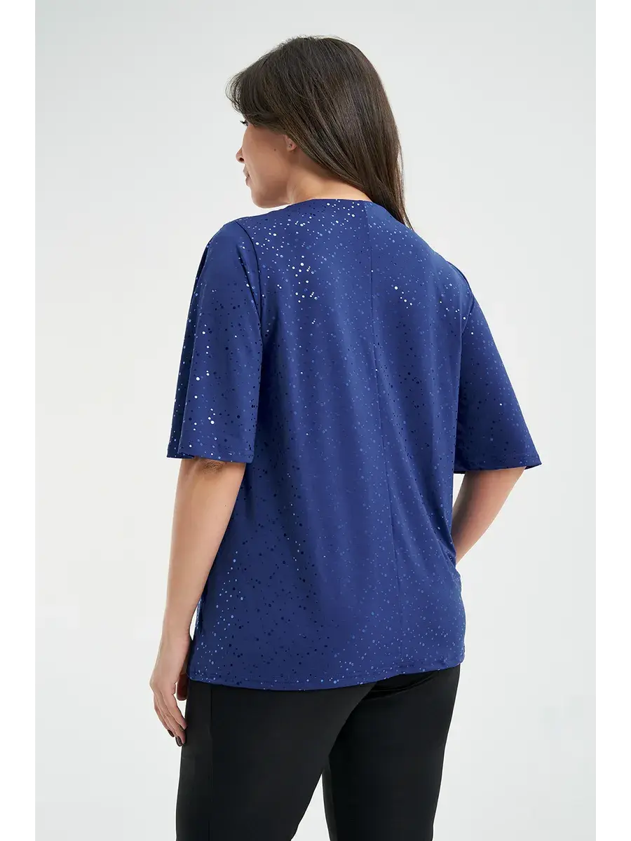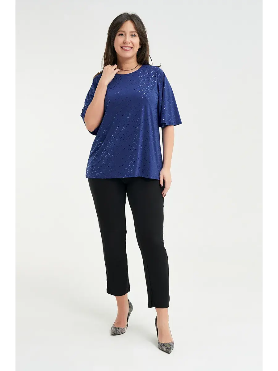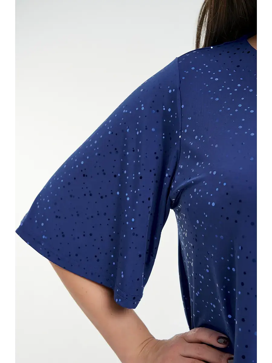 Нарядная блузка больших размеров выполнена из трикотажного полотна масло с пайетками, свободного кроя. Длина изделия по спинке во всех размерах от р.50 до р.70 - 70см, длина рукава 35см.