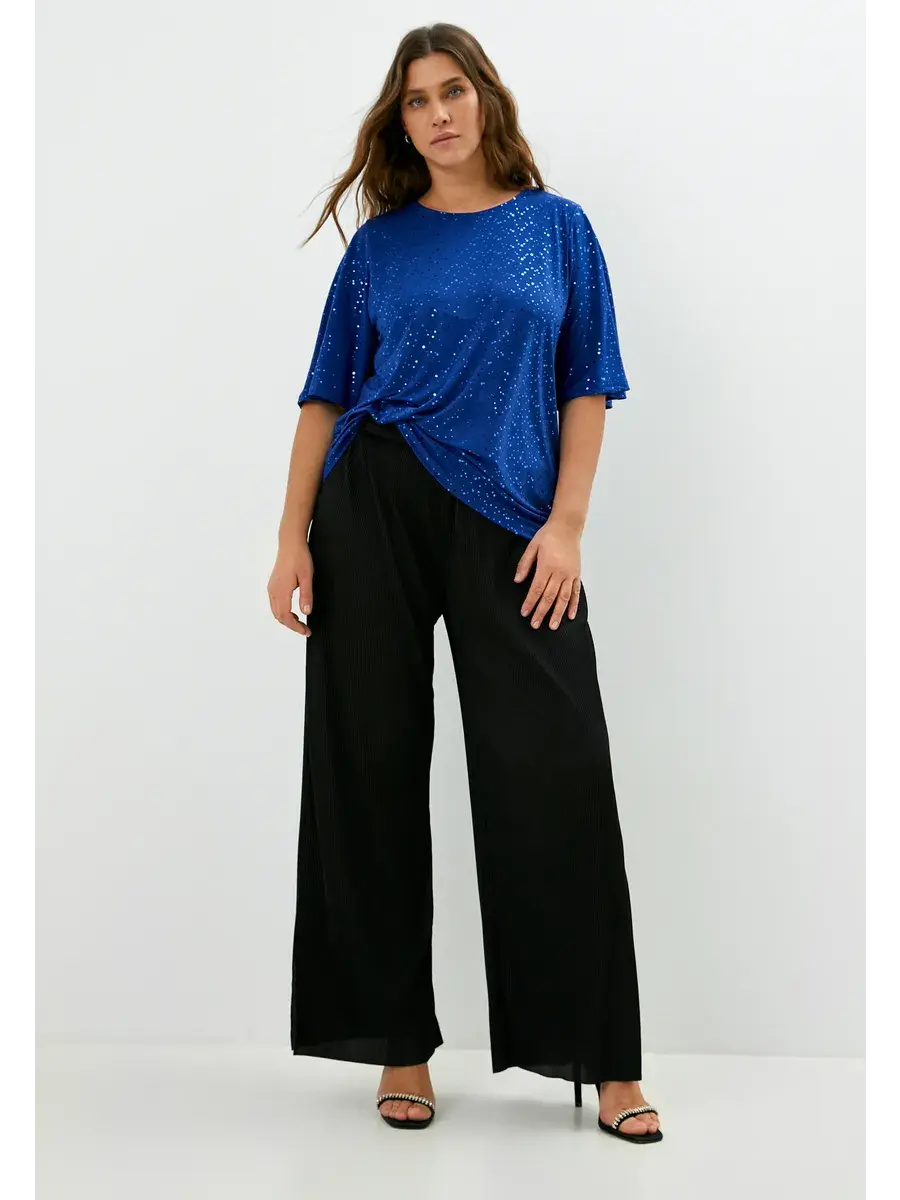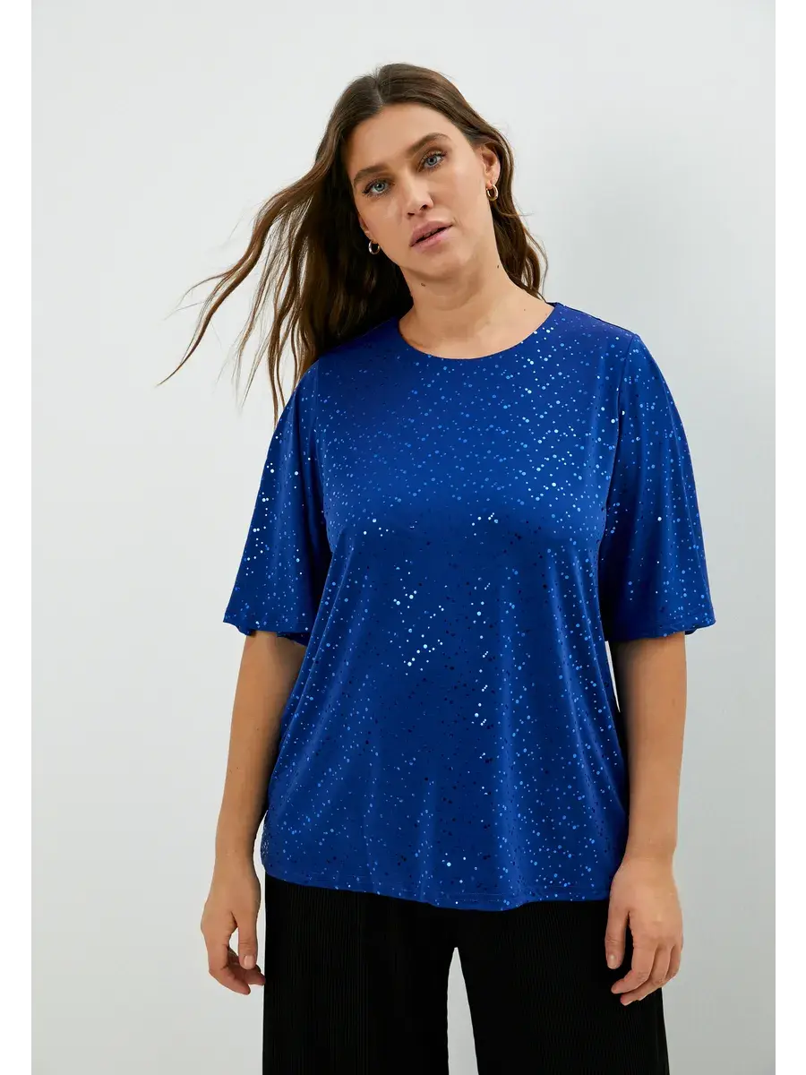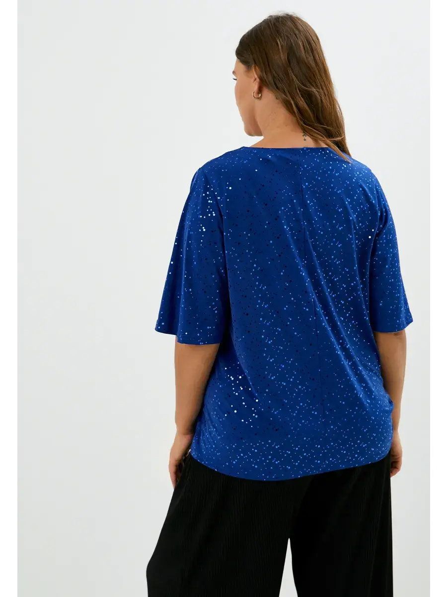 Нарядная блузка больших размеров выполнена из трикотажного полотна масло с пайетками, свободного кроя. Длина изделия по спинке во всех размерах от р.50 до р.70 - 70см, длина рукава 35см.