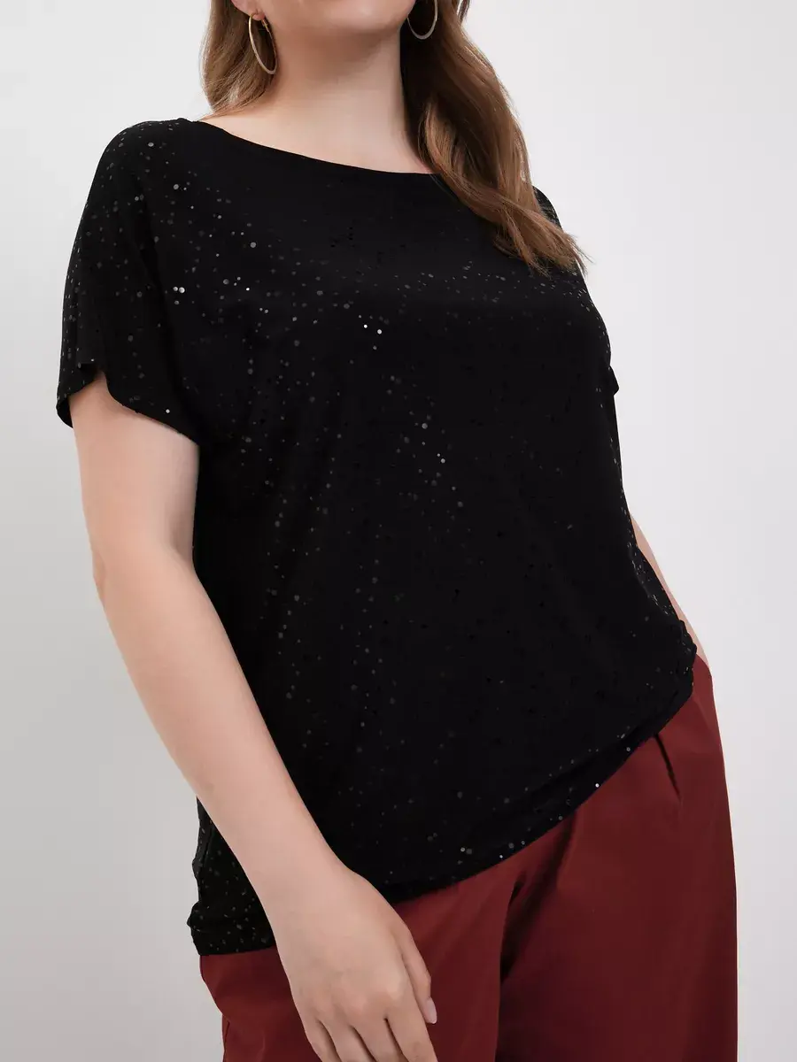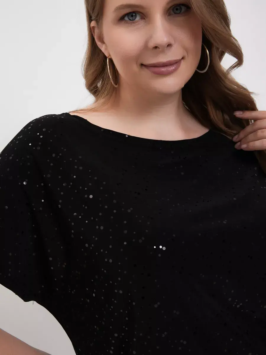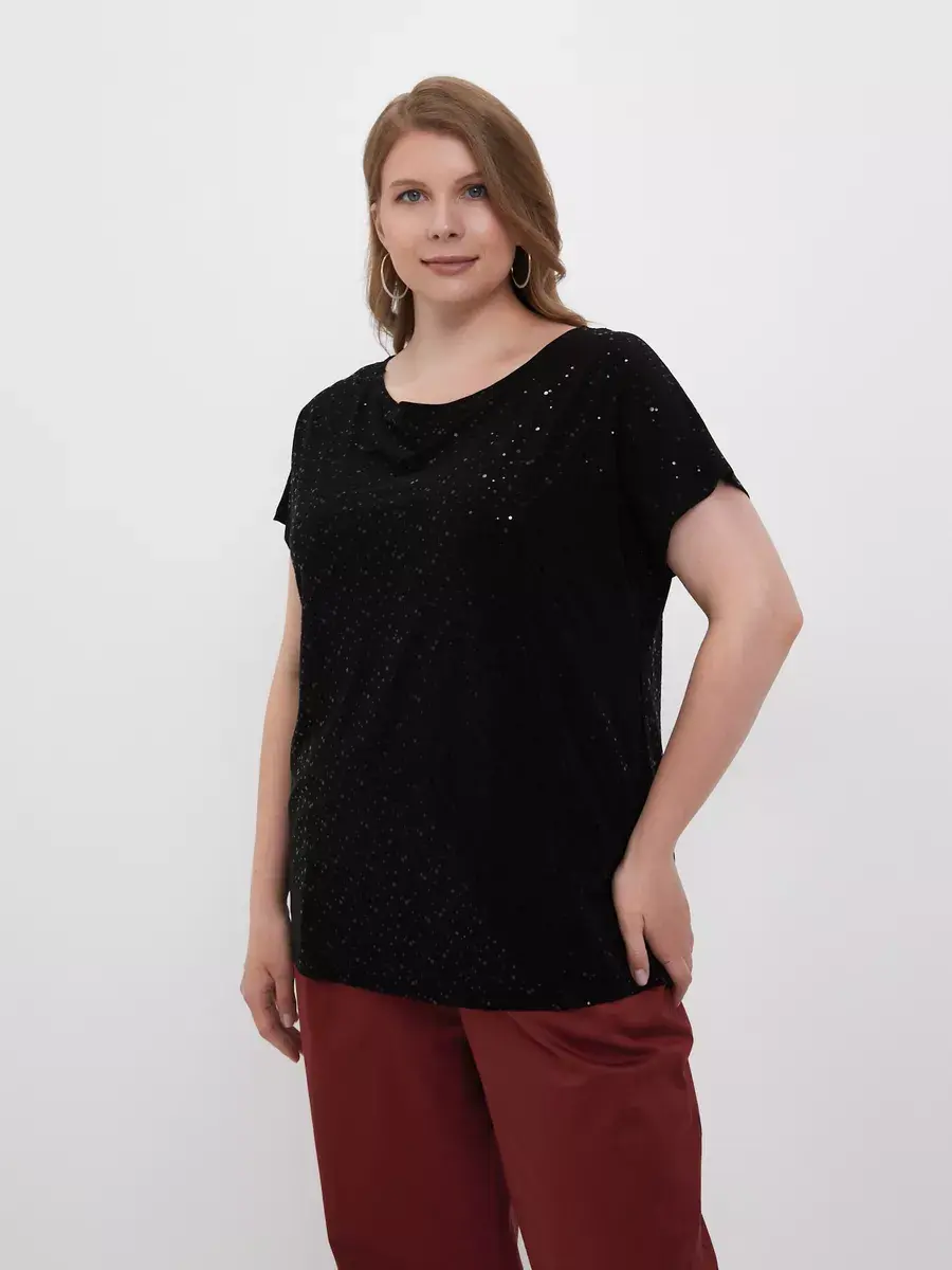 Особенностью данной модели являются изящные пайетки, добавляющие блузке изысканности и элегантности. Благодаря своему дизайну, блузка идеально подходит как для офисного стиля, так и для вечерних мероприятий, а также может стать отличным выбором для женщин с большими размерами.
