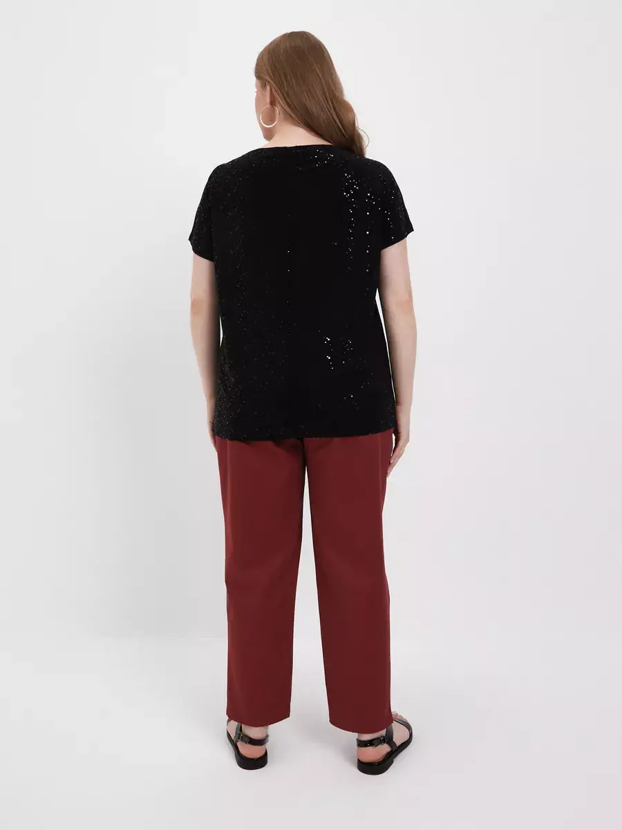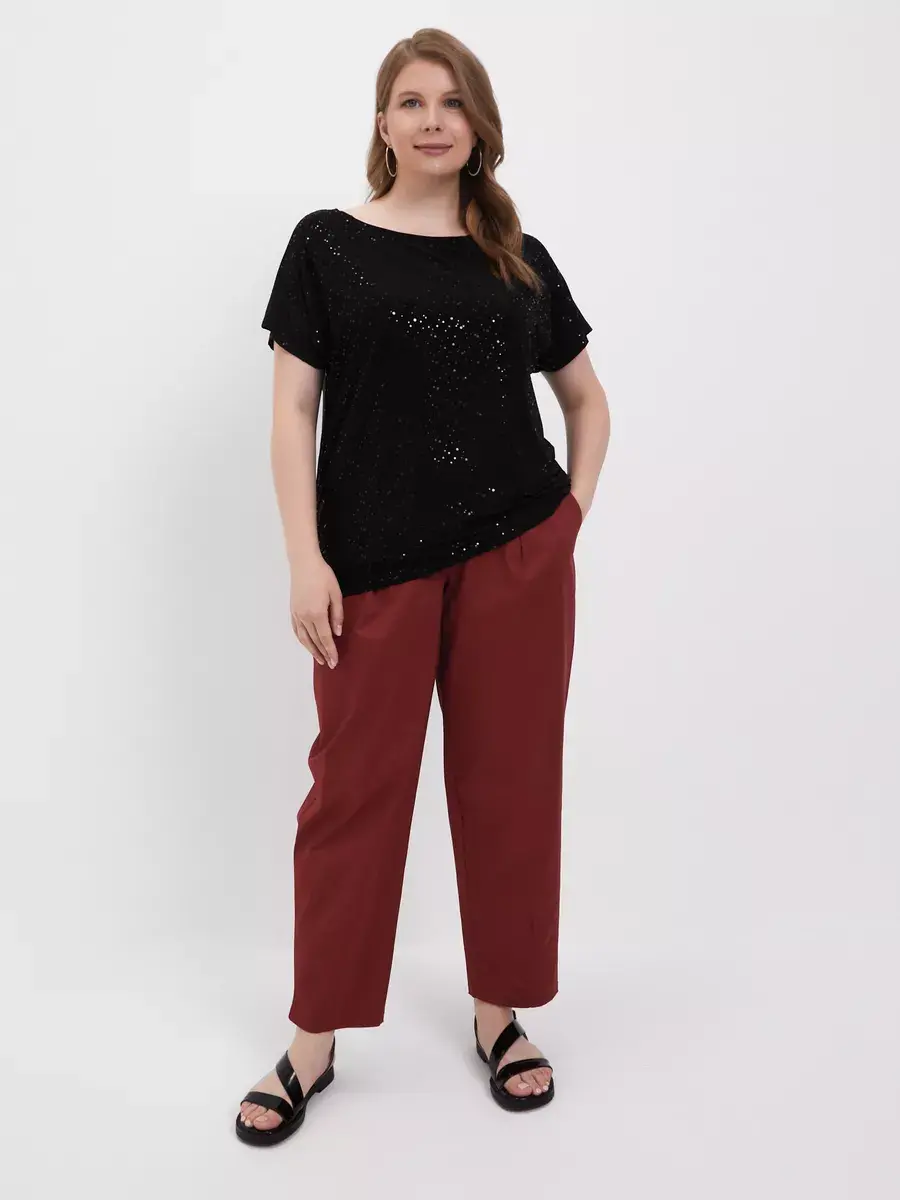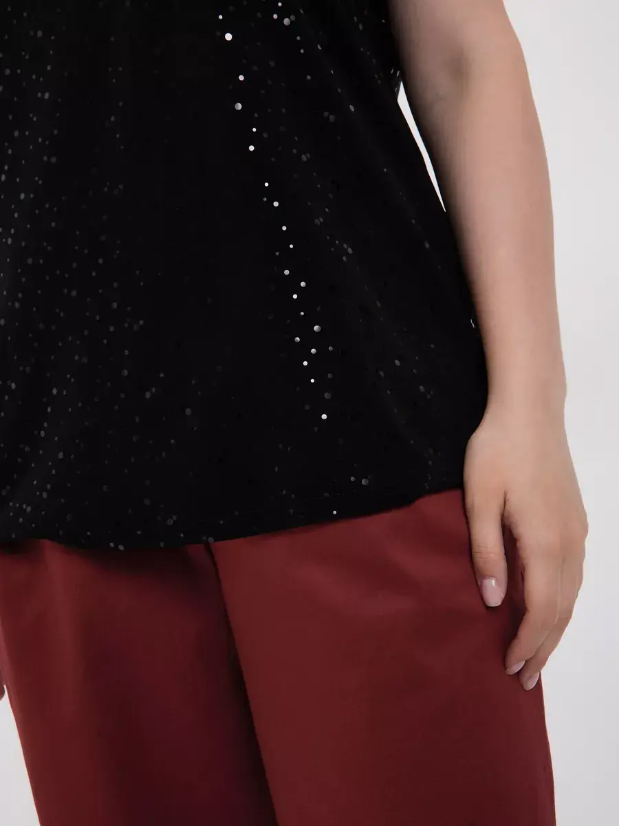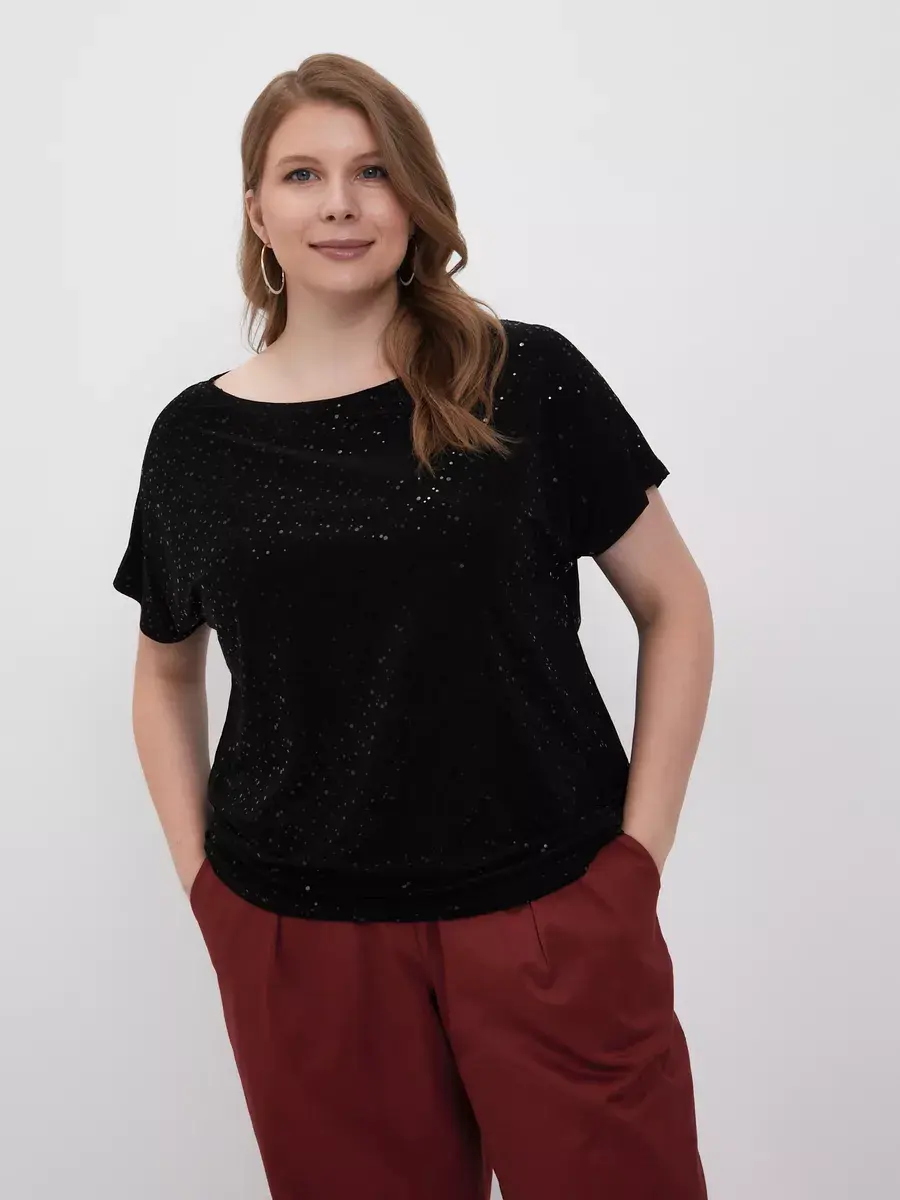 Особенностью данной модели являются изящные пайетки, добавляющие блузке изысканности и элегантности. Благодаря своему дизайну, блузка идеально подходит как для офисного стиля, так и для вечерних мероприятий, а также может стать отличным выбором для женщин с большими размерами.