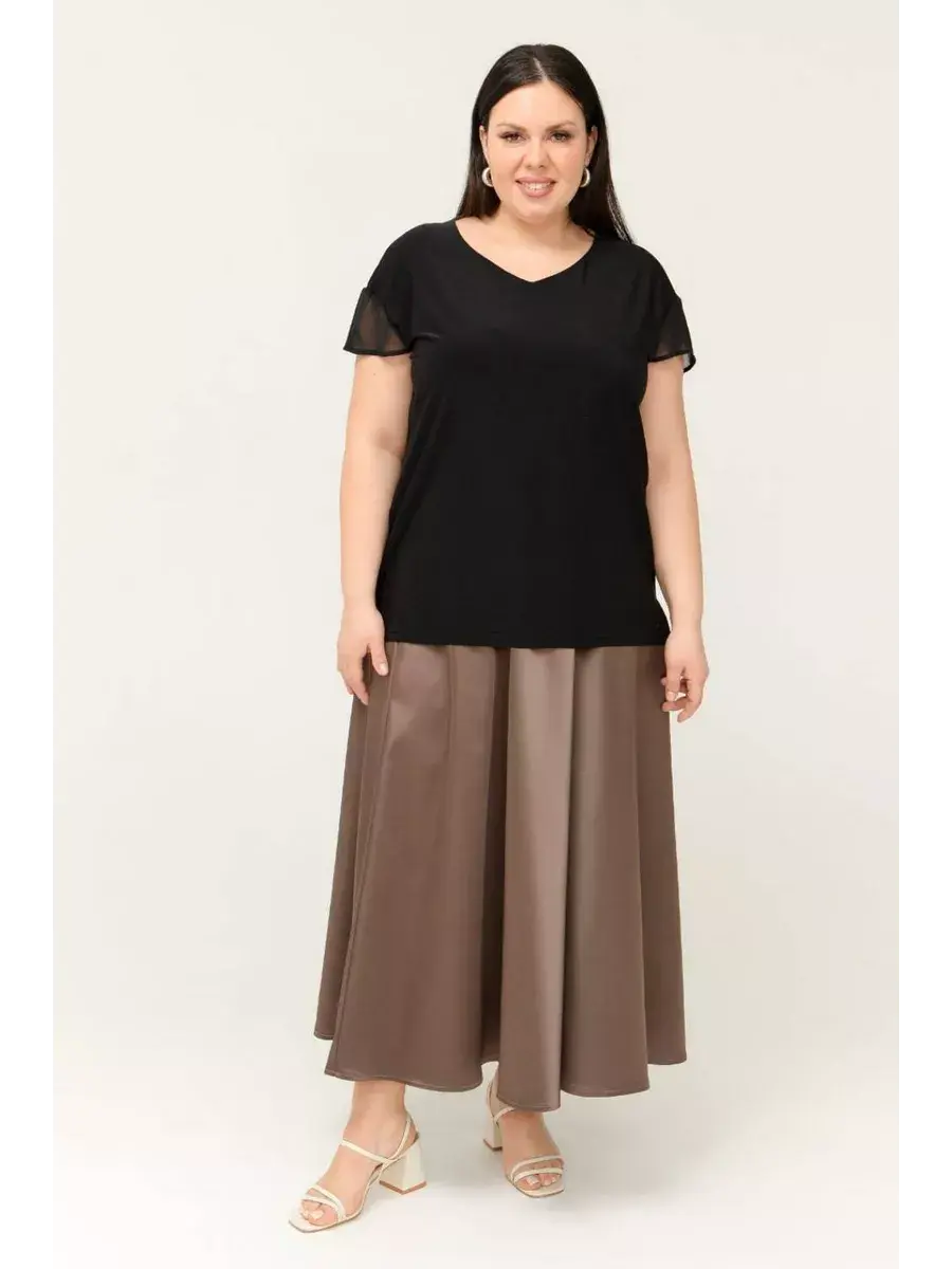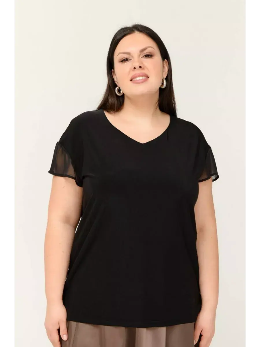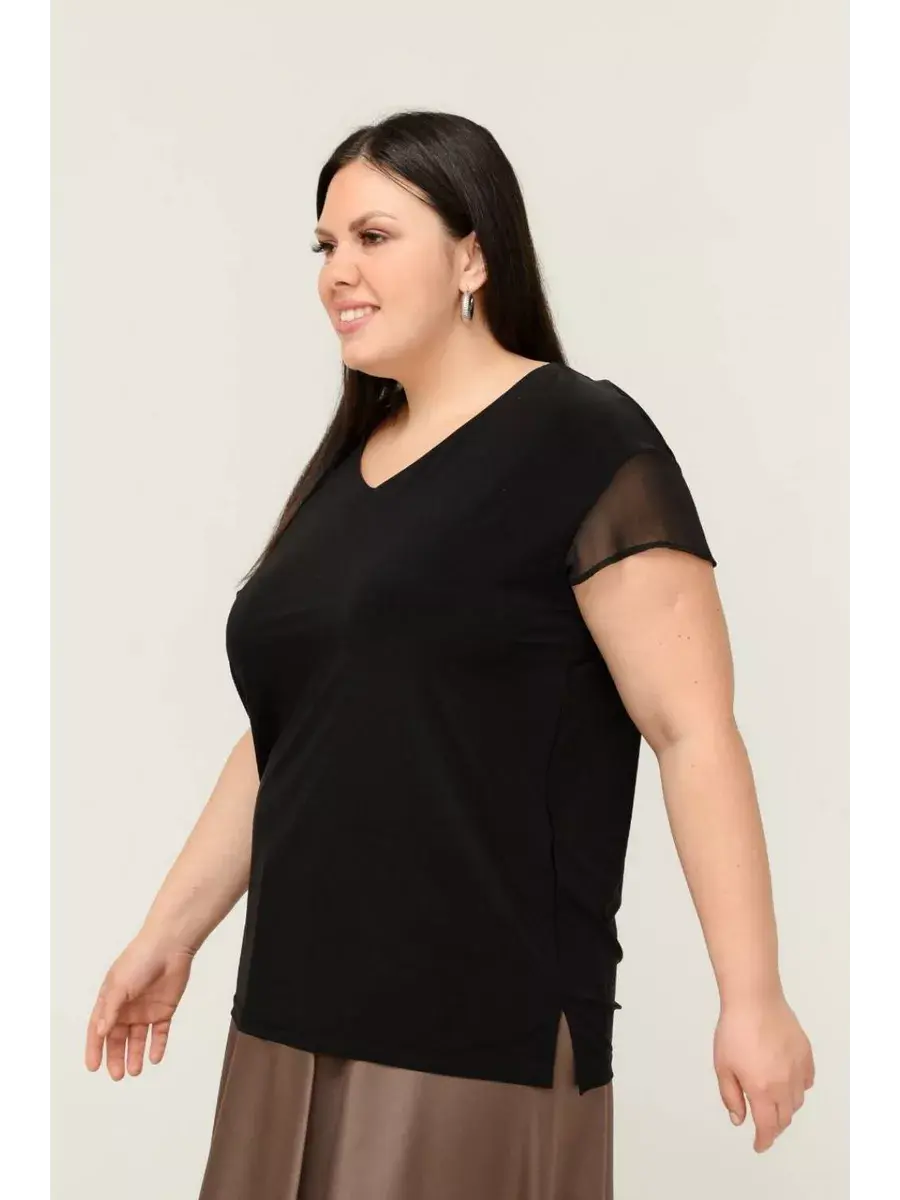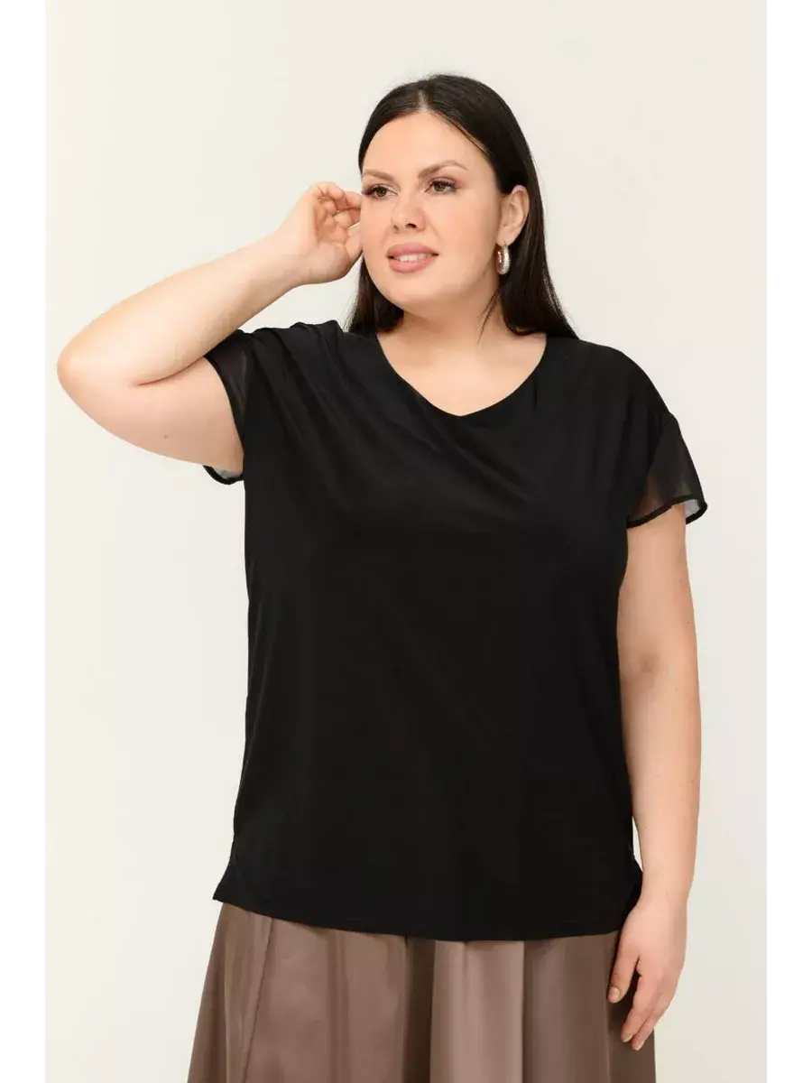 Женская повседневная блузка бренда OLSI, свободного силуэта из трикотажного полотна по типу масло. Удлиненная блузка с V-образным вырезом горловины, со спущенной мягкой линией плеча и короткими рукавами, выполненными из шифона с тон. Длина по спинке/длина рукава/ширина по груди/ширина низ соответственно:р.50-69,5см/11.1см/58,0см/59,3смр.52-70,0см/11,9см/60,0см/61,3смр.54-70,5см/12/9см/61,7см/63,3смр.56-71,0см/13,7см/63,7см/65,4смр.58-71,5см/14,7см/65,7см/67,4смр.60-72,0см/15,6см/67,7см/69,4смр.62-72,5см/16,6см/69,3см/71,5смр.64-73,0см/17,5см/71,3см/73,5смр.66-73,5см/18,4см/73,3см/75,5смр.68-74,0см/19,3см/75,3см/77,6смр.70-74,5см/20,1см/77,3см/79,6смр.72-75,0см/21,1см/79,3см/81,6см
