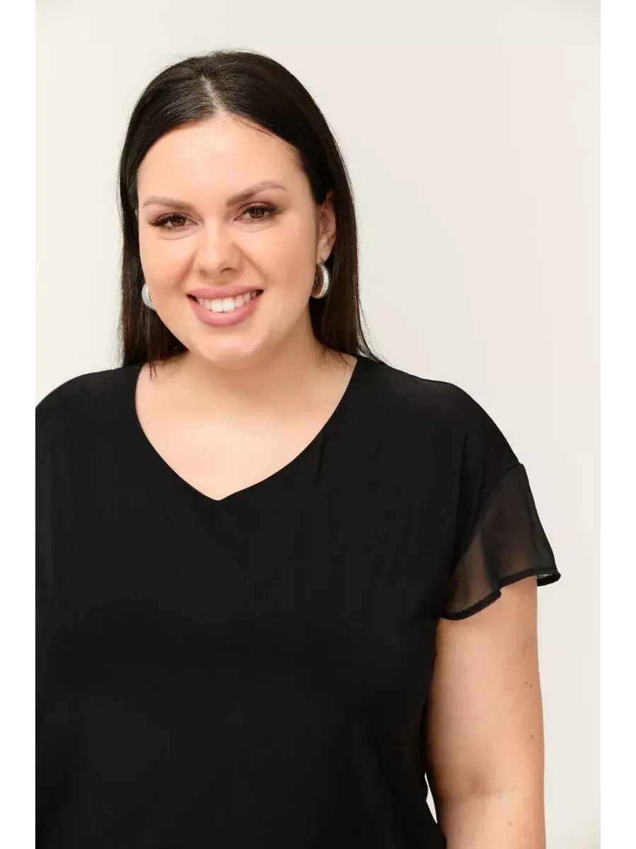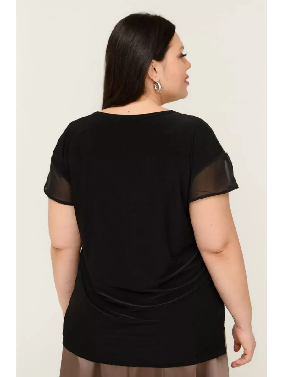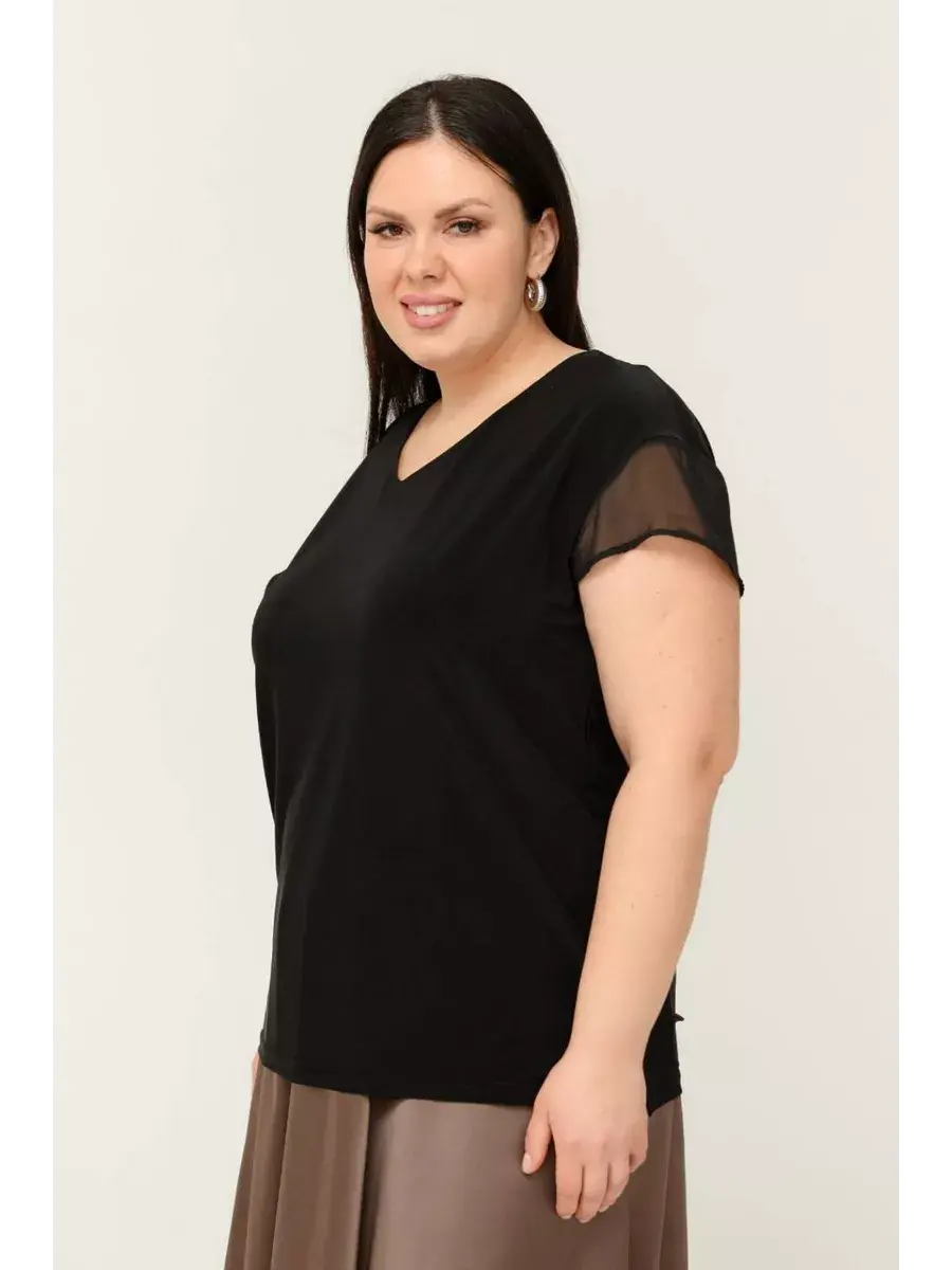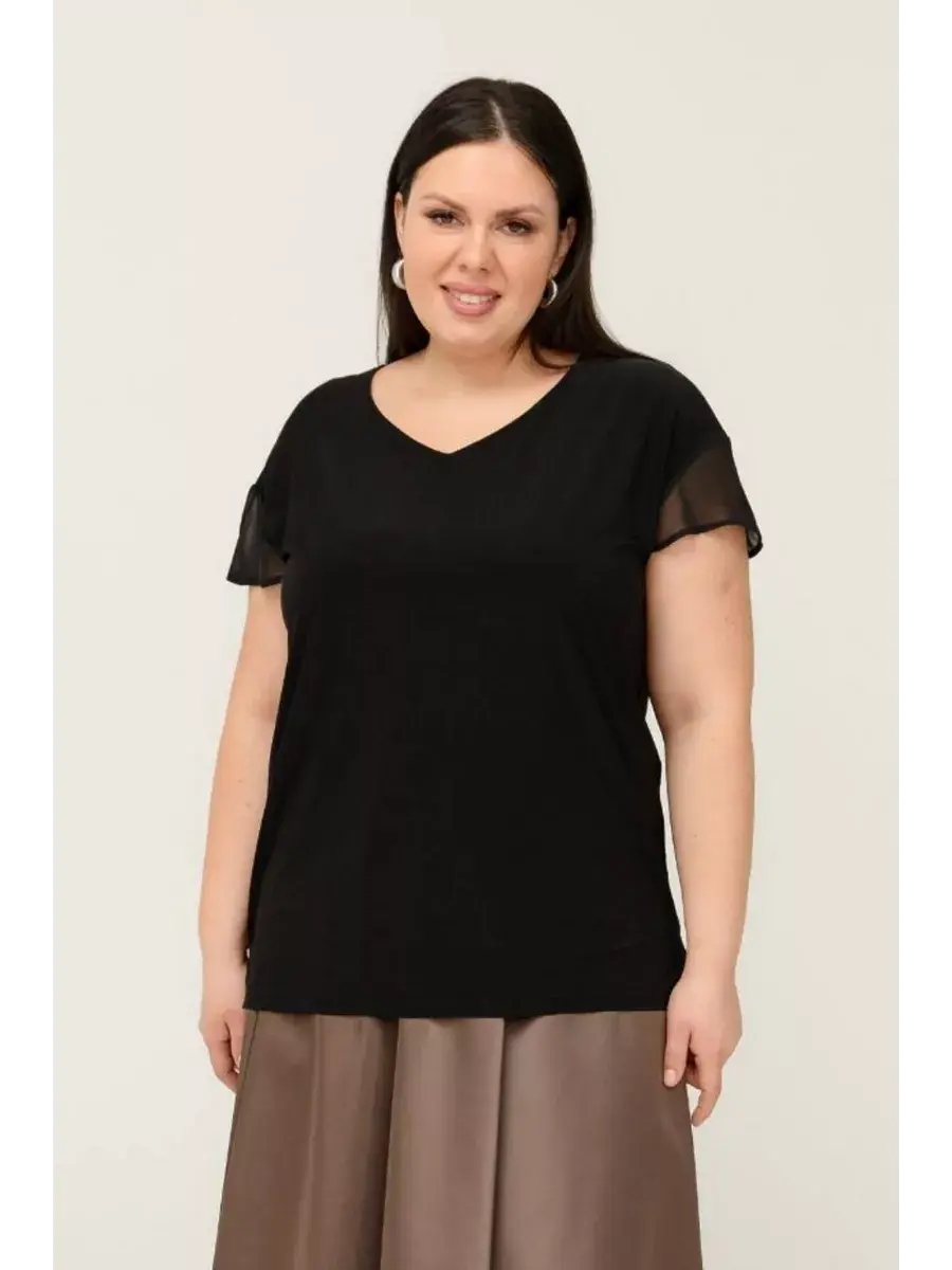 Женская повседневная блузка бренда OLSI, свободного силуэта из трикотажного полотна по типу масло. Удлиненная блузка с V-образным вырезом горловины, со спущенной мягкой линией плеча и короткими рукавами, выполненными из шифона с тон. Длина по спинке/длина рукава/ширина по груди/ширина низ соответственно:р.50-69,5см/11.1см/58,0см/59,3смр.52-70,0см/11,9см/60,0см/61,3смр.54-70,5см/12/9см/61,7см/63,3смр.56-71,0см/13,7см/63,7см/65,4смр.58-71,5см/14,7см/65,7см/67,4смр.60-72,0см/15,6см/67,7см/69,4смр.62-72,5см/16,6см/69,3см/71,5смр.64-73,0см/17,5см/71,3см/73,5смр.66-73,5см/18,4см/73,3см/75,5смр.68-74,0см/19,3см/75,3см/77,6смр.70-74,5см/20,1см/77,3см/79,6смр.72-75,0см/21,1см/79,3см/81,6см