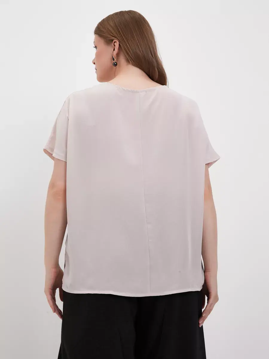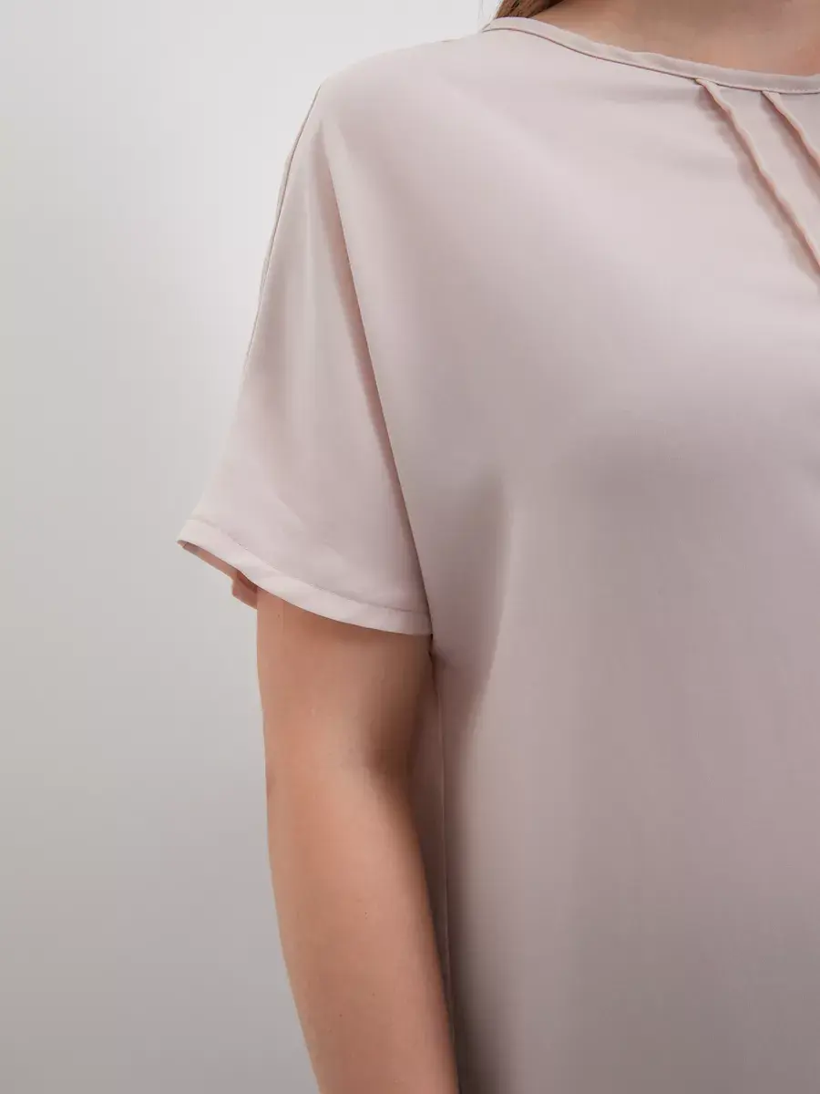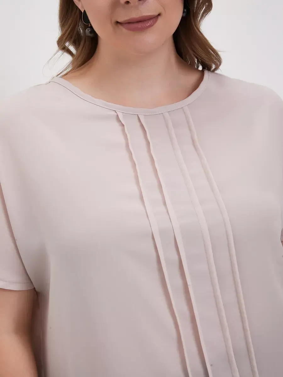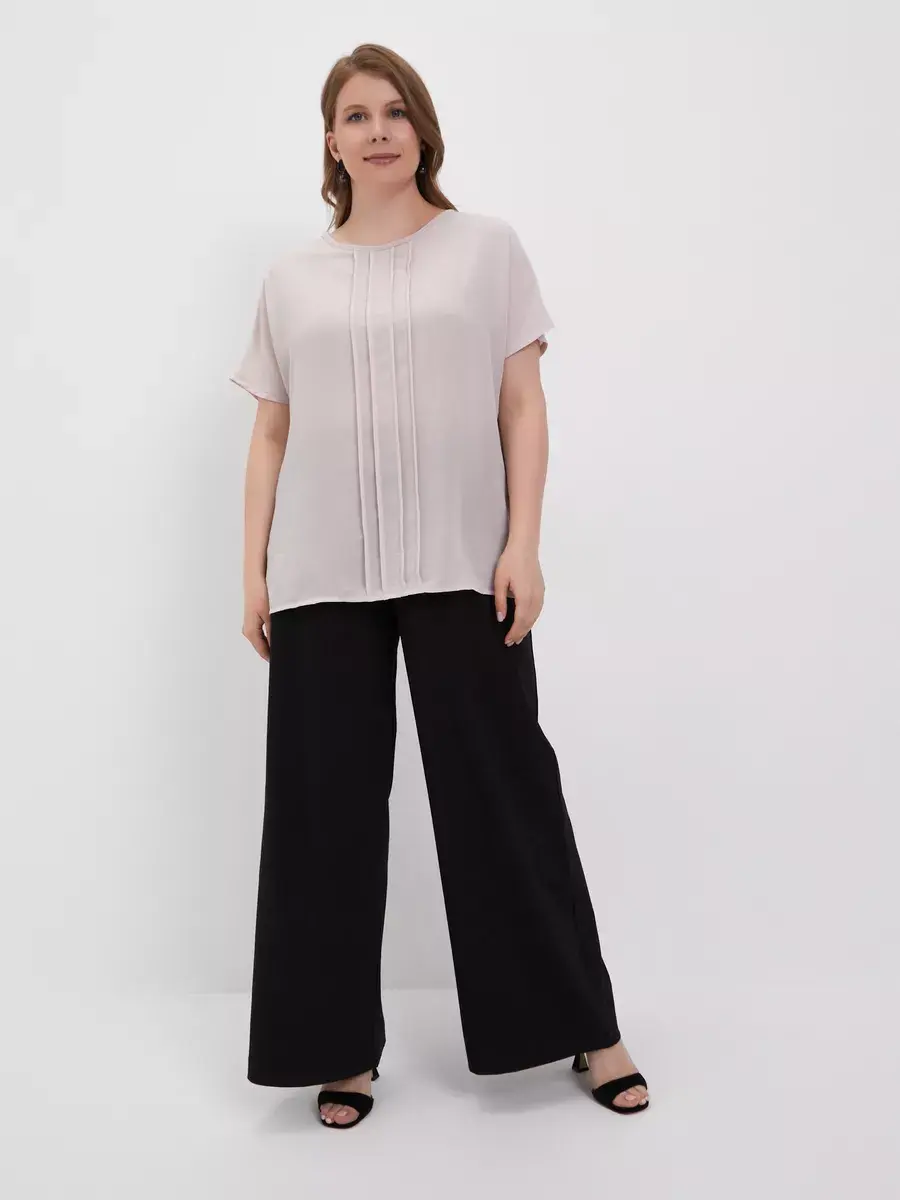 Легкая элегантная блузка больших размеров от бренда OLSI выполнена из премиум вискозной ткани переплетения по типу креп-шелка с матовой поверхностью. Однотонная женская блузка с короткими широкими рукавами , плечо приспущено; с круглым вырезом по горловине. Спереди блузка декорирована отстроченными вертикальными линиями, что визуально удлиняет фигуру и делает стройнее. Фасон блузки широкий, прямого силуэта. Лаконичный крой блузки топа из искусственного шелка подойдет девушкам и женщинам любого возраста. Блузка женская будет уместна в любой ситуации, как повседневная блузка на работу или учебу, так и на праздничное или вечернее мероприятие, свидание. Блузка футболка отлично сочетается с джинсами, классическими брюками, юбкой. Можно носить как футболка под пиджак или жилет. Данная модель станет базовой в гардеробе модниц.