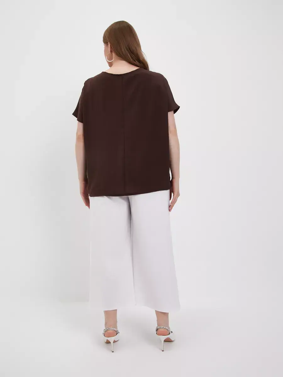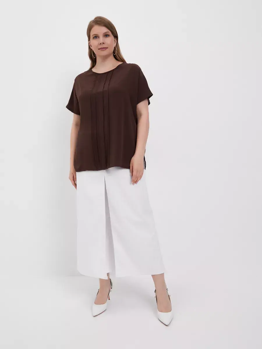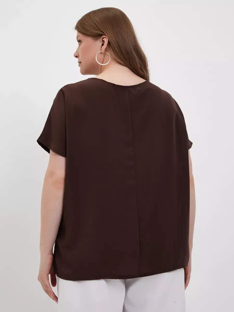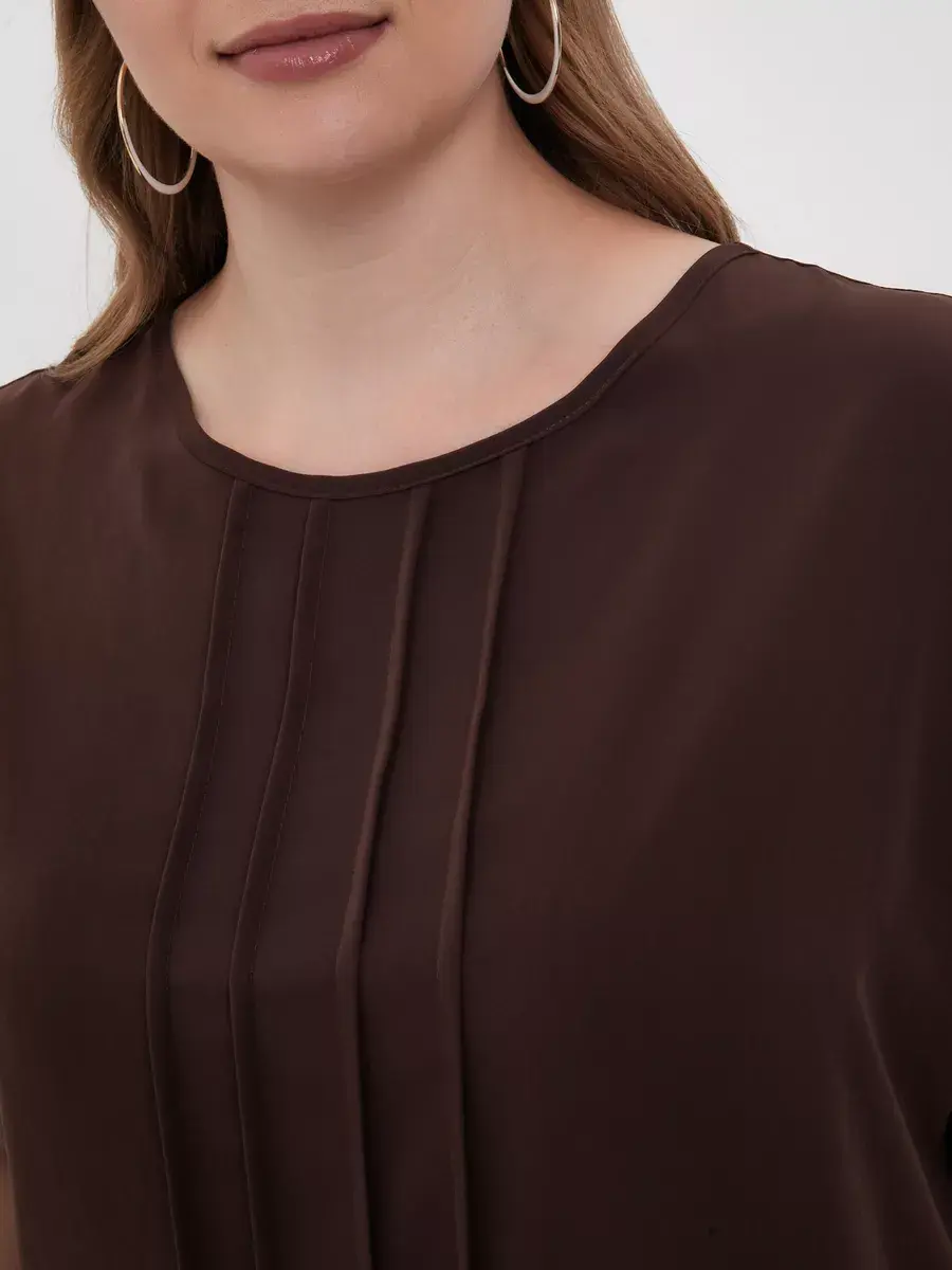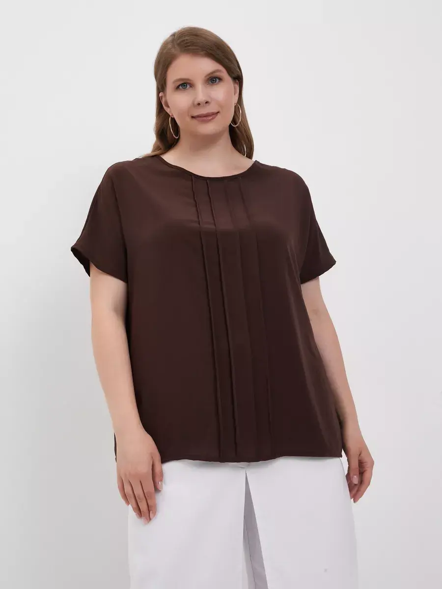 Легкая элегантная блузка больших размеров от бренда OLSI выполнена из премиум вискозной ткани переплетения по типу креп-шелка с матовой поверхностью. Однотонная женская блузка с короткими широкими рукавами , плечо приспущено; с круглым вырезом по горловине. Спереди блузка декорирована отстроченными вертикальными линиями, что визуально удлиняет фигуру и делает стройнее. Фасон блузки широкий, прямого силуэта. Лаконичный крой блузки топа из искусственного шелка подойдет девушкам и женщинам любого возраста. Блузка женская будет уместна в любой ситуации, как повседневная блузка на работу или учебу, так и на праздничное или вечернее мероприятие, свидание. Блузка футболка отлично сочетается с джинсами, классическими брюками, юбкой. Можно носить как футболка под пиджак или жилет. Данная модель станет базовой в гардеробе модниц.