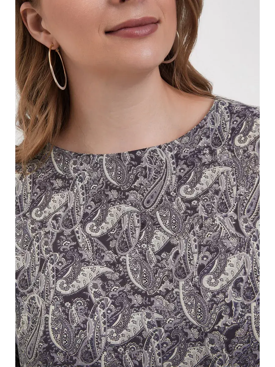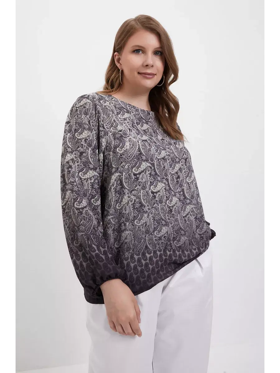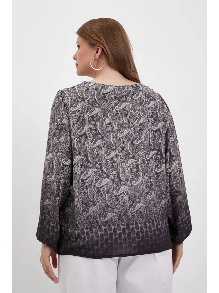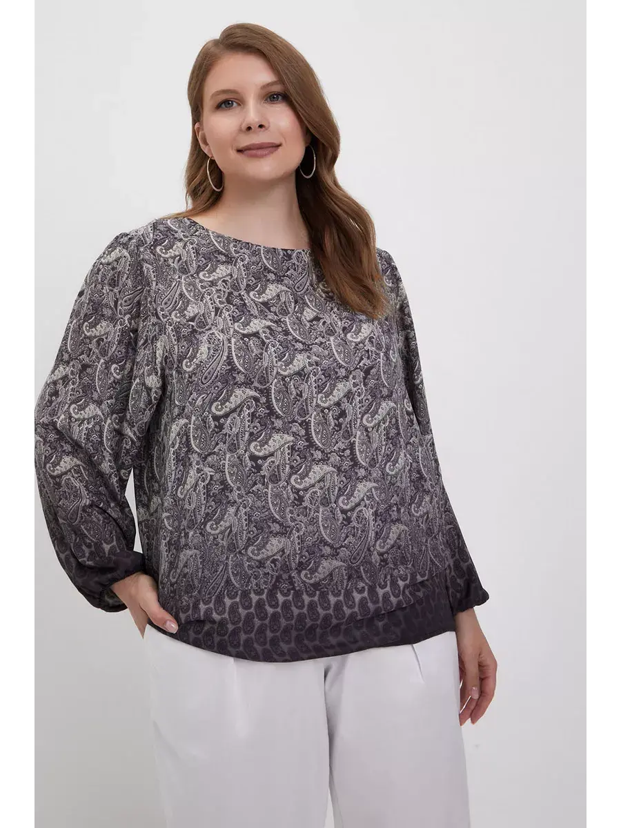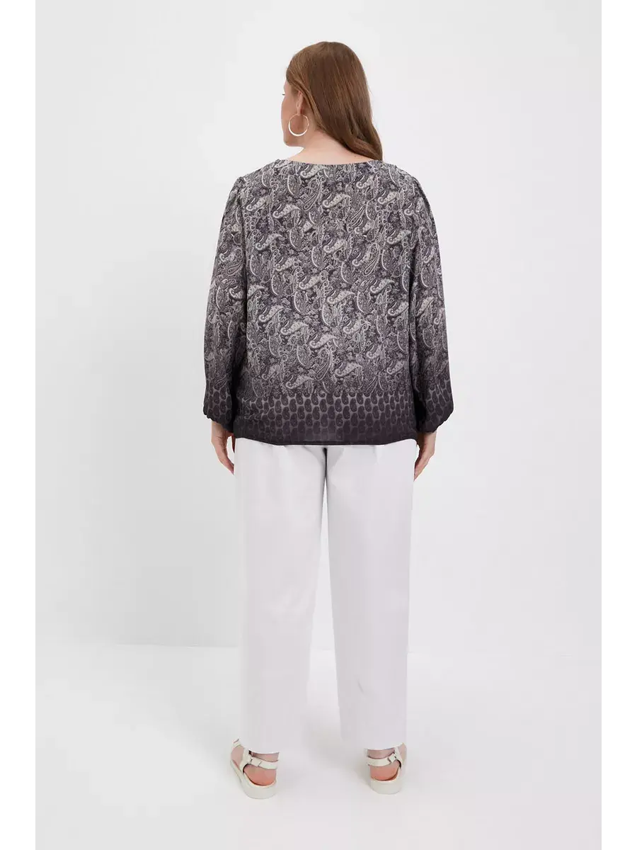 Блузка женская больших размеров от бренда OLSI из струющегося искусственного шифона премиум качества. Блузка свободного фасона, с широкими рукавами до запястья, что делает образ легким и воздушним, скрывая недостатки. Круглый вырез горловины средней глубины женственно открывает шею. Блузка Олси выполнена в стиле бохо. Особенностью модели является его комбинированный рисунок - пейсли (турецкий огурец) в сочетании с деграде. Блузка имеет свободный силуэт, что отлично нивелирует недостатки фигуры, придавая женственности. Хорошо сидит на любой фигуре. В этой блузке Ваш образ будет элегантным и расслабленным. Модель отлично подойдет как нарядная блузка на торжество, так и красивая блузка в офис на работу. Длина по спинке в 52 размере 63,5 см.