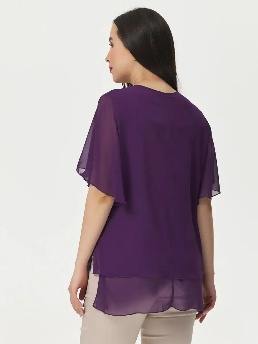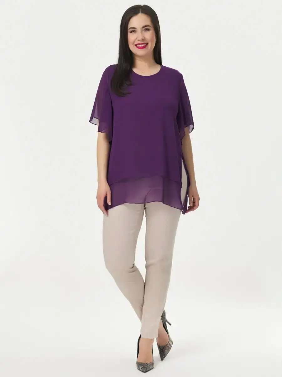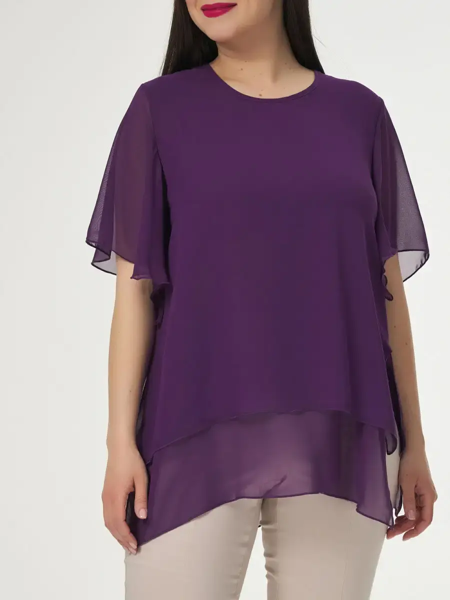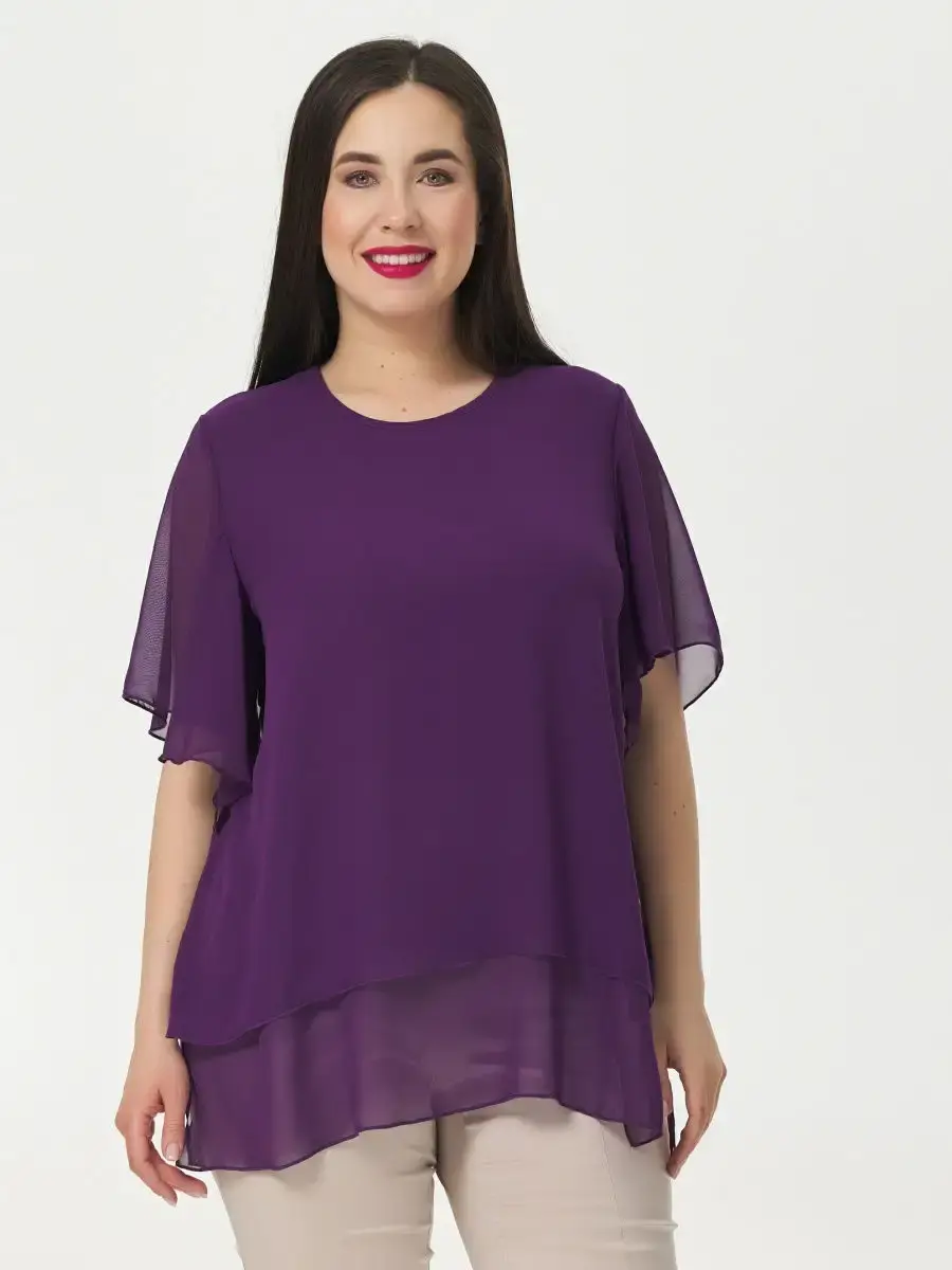 Эта свободная базовая блуза больших размеров с коротким рукавом идеально подходит для создания повседневных и офисных луков. Кофта состоит из двух слоев, а нарядная блуза с округлым вырезом позволит вам оставаться изысканной и элегантной в любой ситуации. Она создает визуально стройный силуэт, а ее прямая модель будет уместно смотреться как на работе, так и на праздничном мероприятии, вечеринке или прогулке.