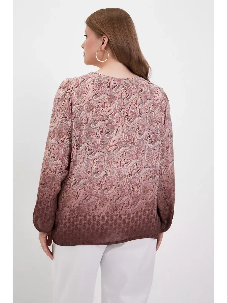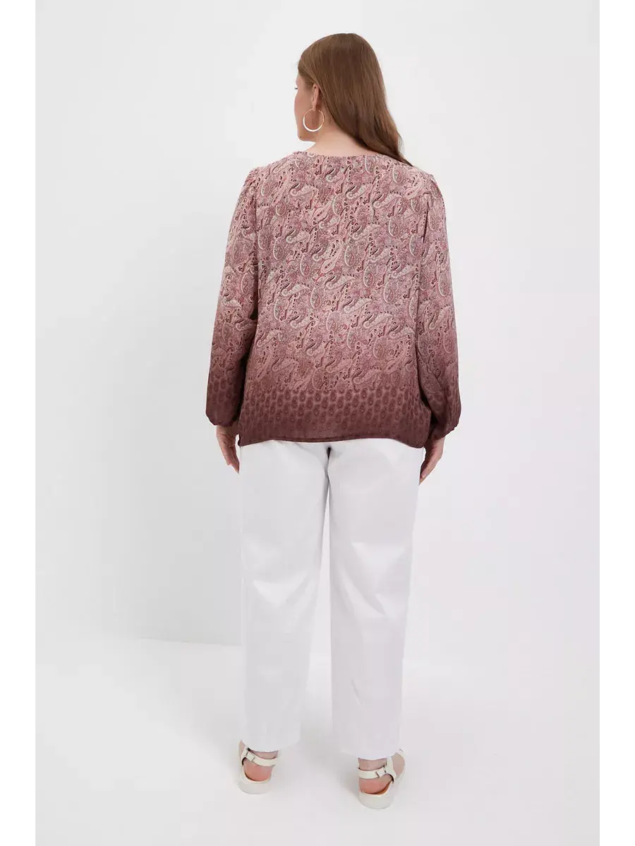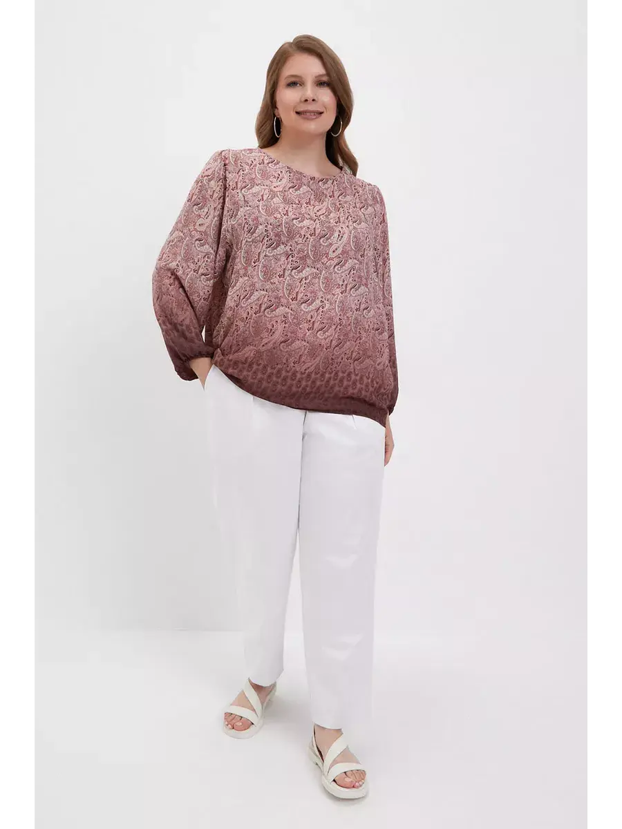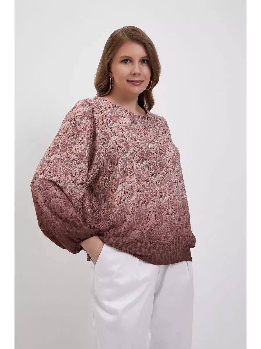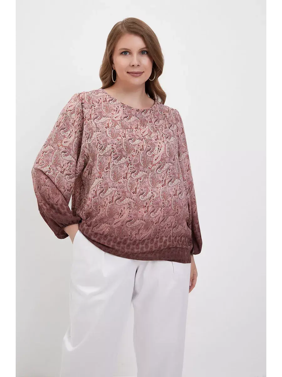 Блузка женская больших размеров от бренда OLSI из струющегося искусственного шифона премиум качества. Блузка свободного фасона, с широкими рукавами до запястья, что делает образ легким и воздушним, скрывая недостатки. Круглый вырез горловины средней глубины женственно открывает шею. Блузка Олси выполнена в стиле бохо. Особенностью модели является его комбинированный рисунок - пейсли (турецкий огурец) в сочетании с деграде. Блузка имеет свободный силуэт, что отлично нивелирует недостатки фигуры, придавая женственности. Хорошо сидит на любой фигуре. В этой блузке Ваш образ будет элегантным и расслабленным. Модель отлично подойдет как нарядная блузка на торжество, так и красивая блузка в офис на работу. Длина по спинке в 52 размере 63,5 см.