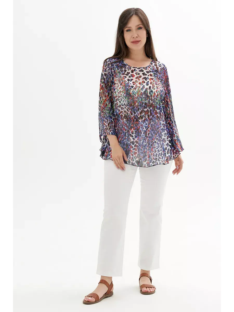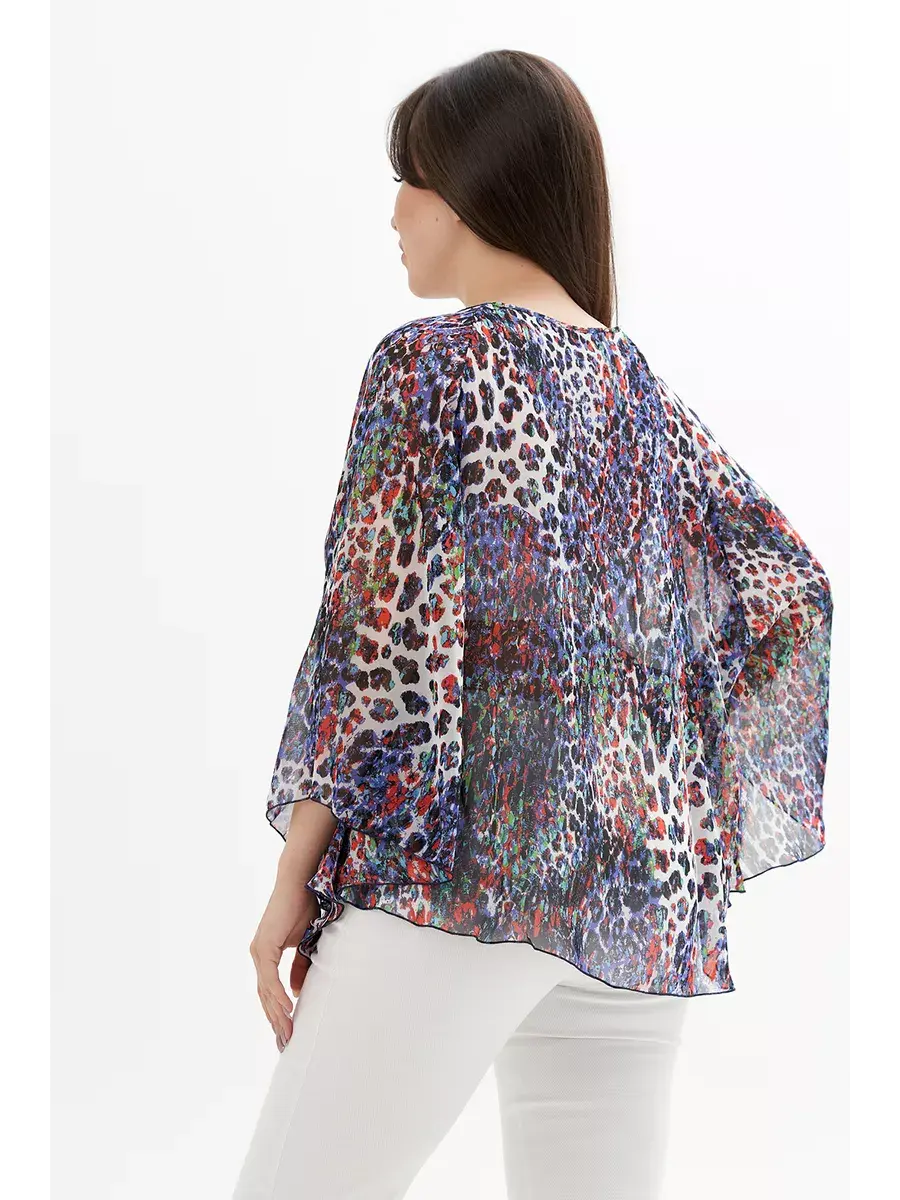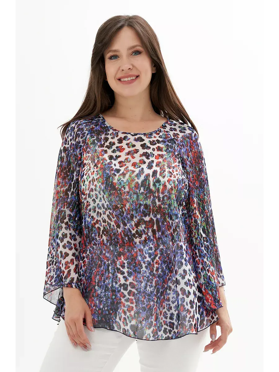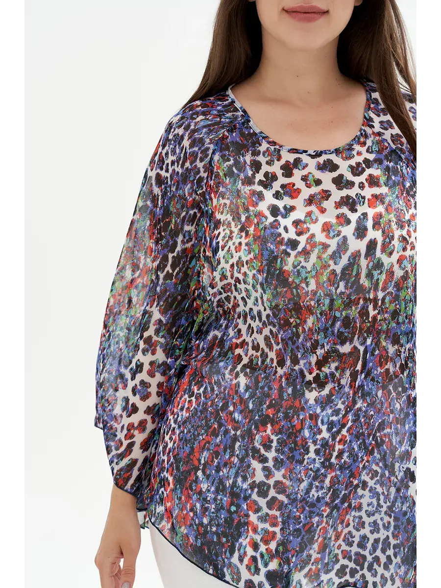 Стильная полупрозрачная блузка летней цветочной расцветки, похожая на воздушную пелерину. Женская блузка из шифона с широким рукавом-кимоно, круглым вырезом горловины и округлым низом, отделанным опиковкой. Модель скроет все несовершенства линий, даст возможность чувствовать себя комфортно и уверенно. Добавит образу легкости и романтики. Подойдет для женщин с любым типом фигуры. Повседневная блузка большого размера, выполнена из тонкого шифона с принтом. Стильная блузка женская больших размеров, Шифоновая блузка широкая, Пелерина женская летняя