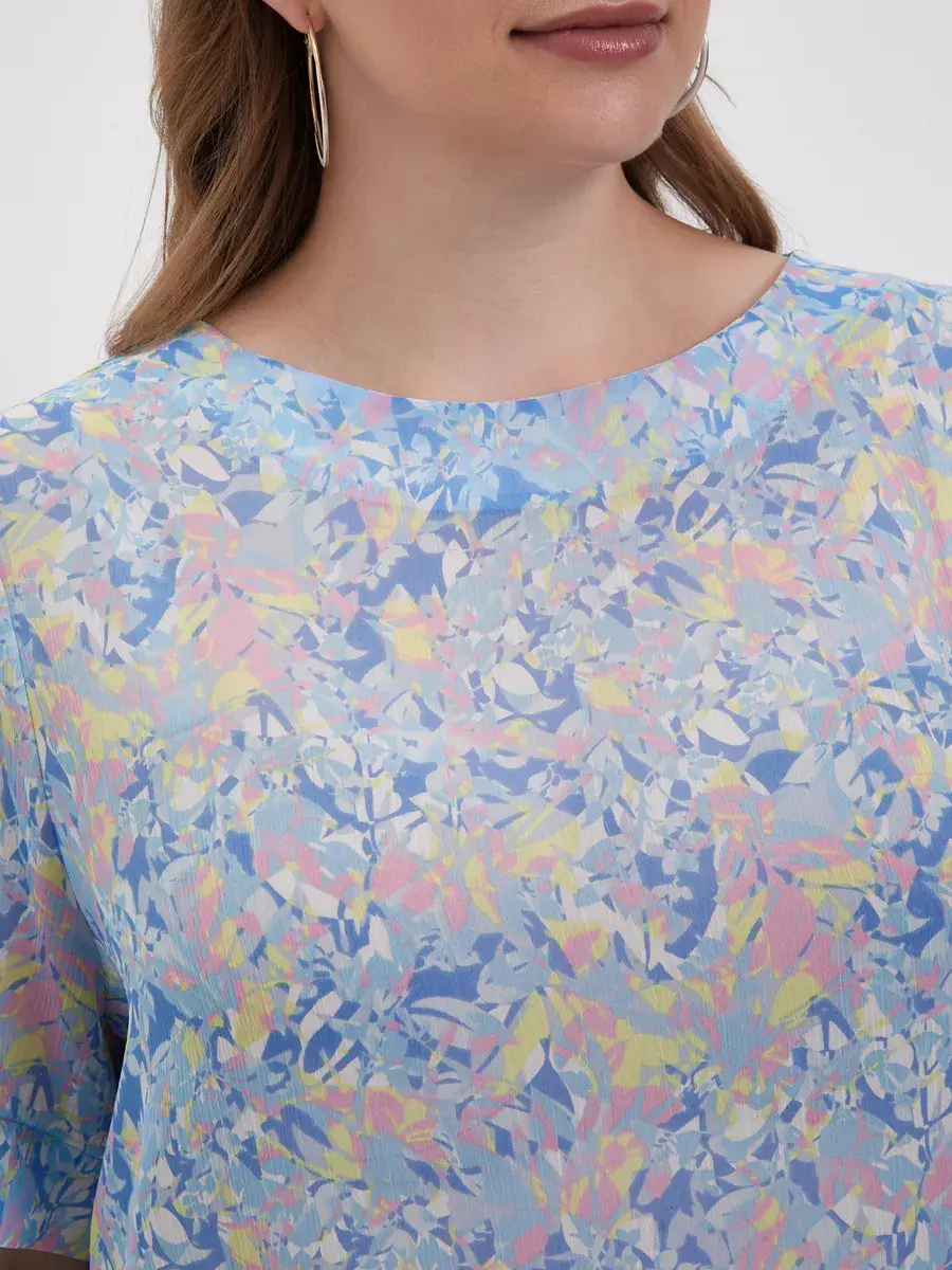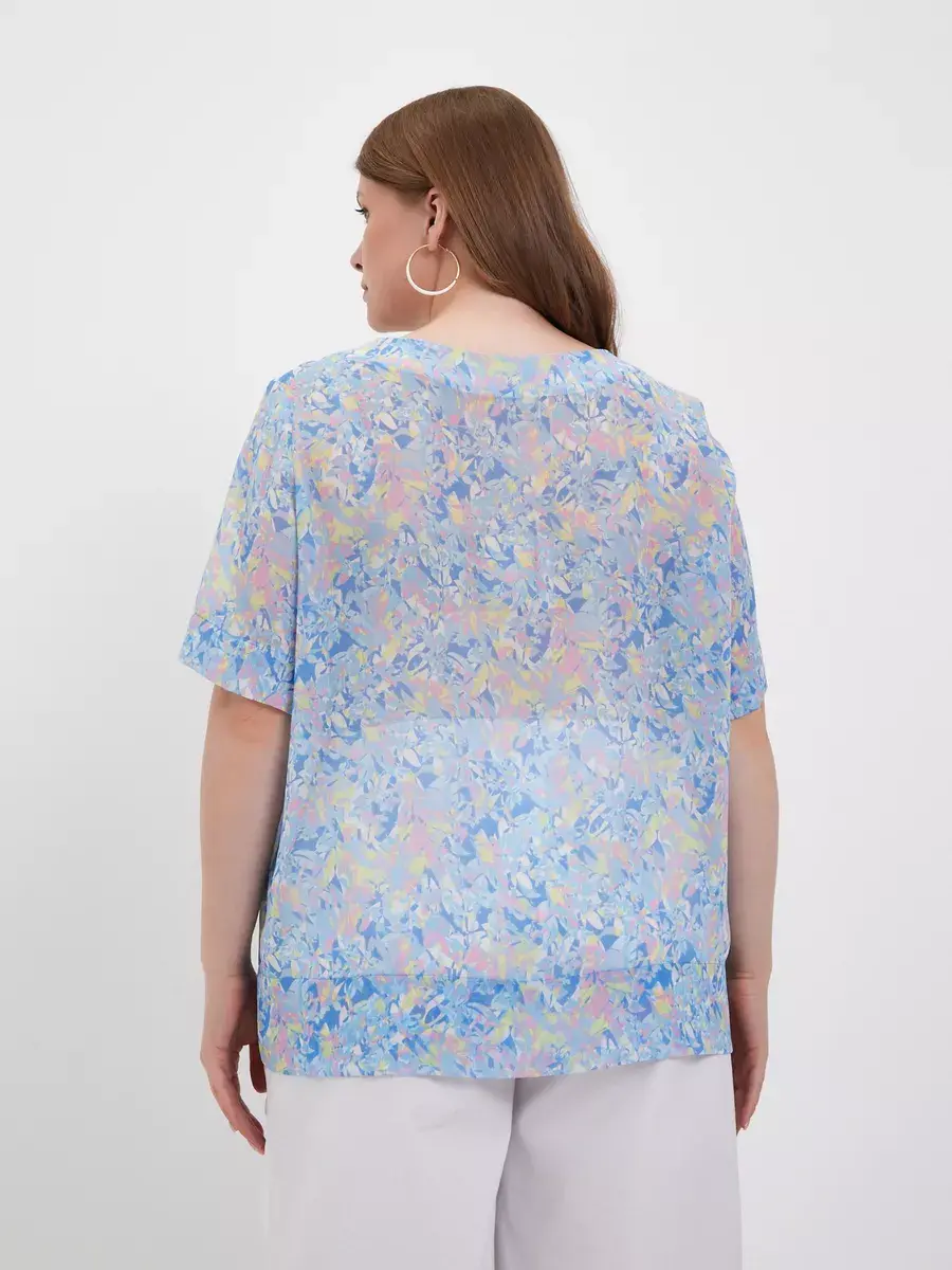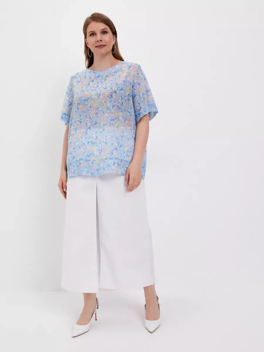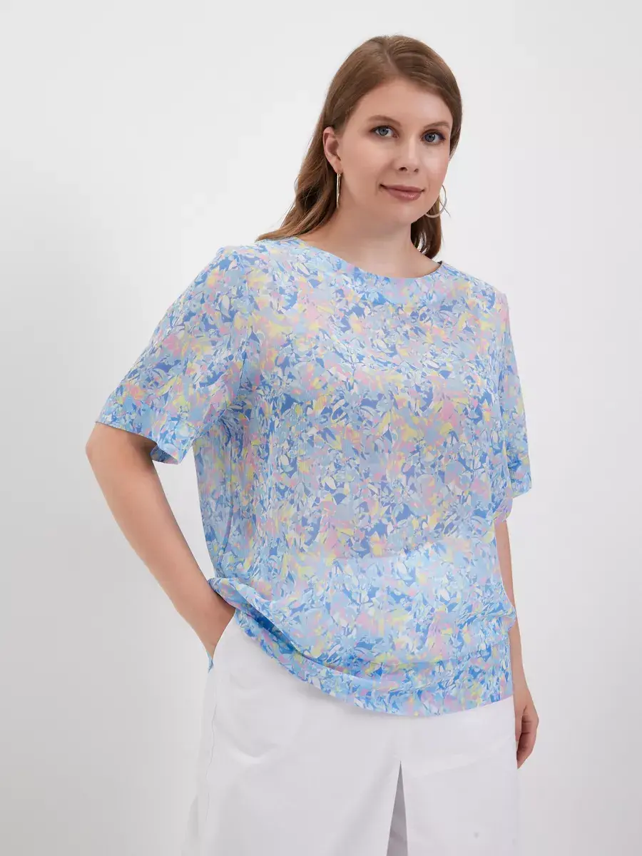 Легкая элегантная блузка больших размеров от бренда OLSI выполнена из премиум шифона с матовой поверхностью. Принтованная женская блузка Олси с короткими широкими рукавами с широким подгибом по низу, плечо приспущено; с круглым вырезом по горловине. По низу блузки широкая подгибка с отделочной строчкой, - что придает дорогой вид. Фасон блузки широкий и укороченный. Лаконичный крой блузки топа подойдет девушкам и женщинам любого возраста. Блузка женская будет уместна в любой ситуации, как повседневная блузка на работу или учебу, так и на праздничное или вечернее мероприятие, свидание. Блузка футболка отлично сочетается с джинсами, классическими брюками, юбкой. Можно носить как футболка под пиджак или жилет. Данная модель станет базовой в гардеробе модниц. Бренд OLSI это высокое качество изделий, премиальные ткани из Южкой Кореи, и собственное производство в Москве.