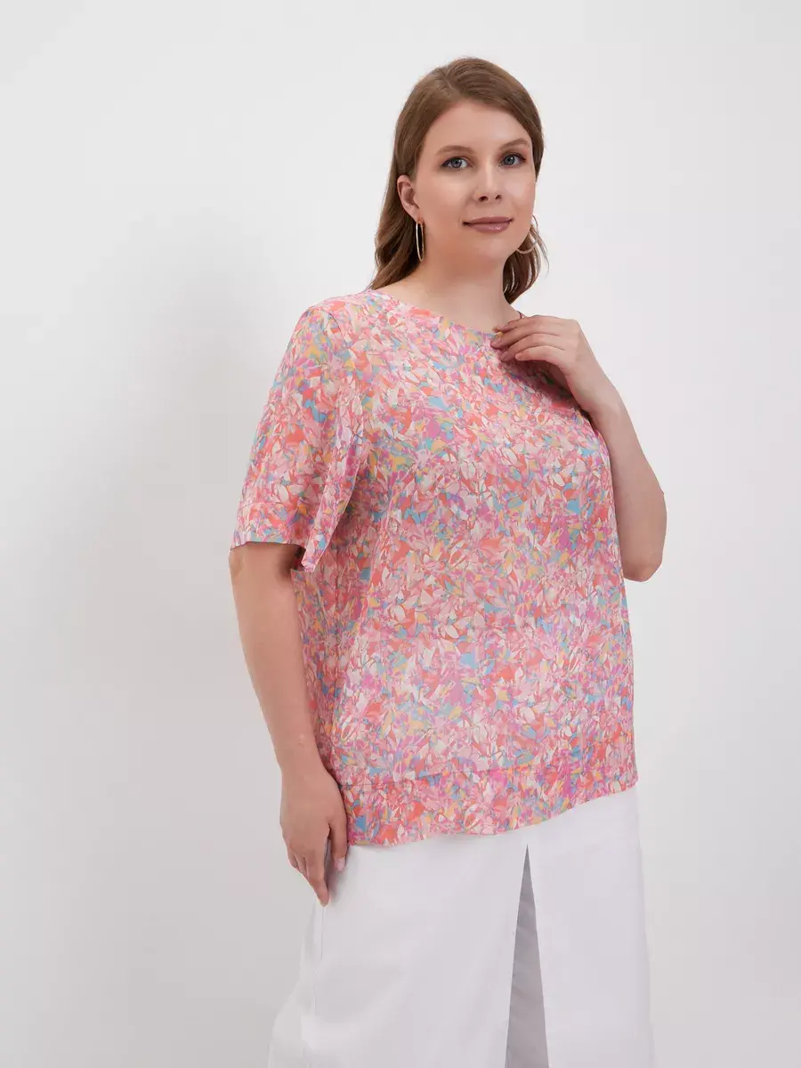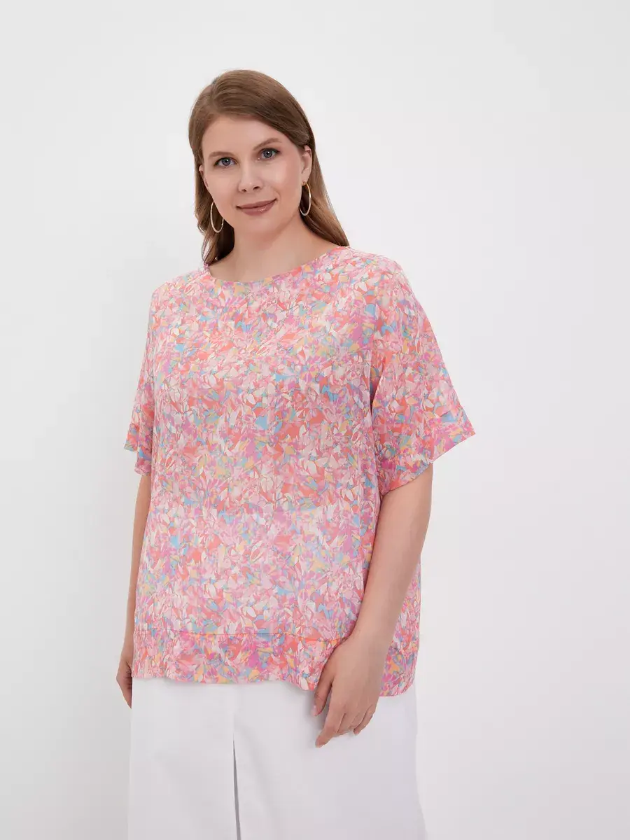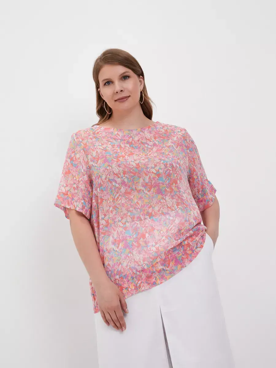 Легкая элегантная блузка больших размеров от бренда OLSI выполнена из премиум шифона с матовой поверхностью. Принтованная женская блузка Олси с короткими широкими рукавами с широким подгибом по низу, плечо приспущено; с круглым вырезом по горловине. По низу блузки широкая подгибка с отделочной строчкой, - что придает дорогой вид. Фасон блузки широкий и укороченный. Лаконичный крой блузки топа подойдет девушкам и женщинам любого возраста. Блузка женская будет уместна в любой ситуации, как повседневная блузка на работу или учебу, так и на праздничное или вечернее мероприятие, свидание. Блузка футболка отлично сочетается с джинсами, классическими брюками, юбкой. Можно носить как футболка под пиджак или жилет. Данная модель станет базовой в гардеробе модниц. Бренд OLSI это высокое качество изделий, премиальные ткани из Южкой Кореи, и собственное производство в Москве.