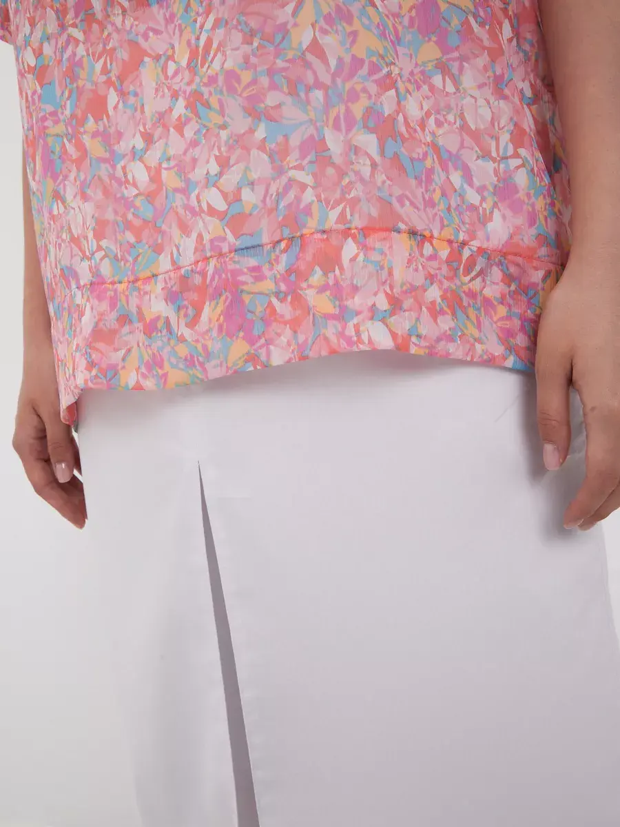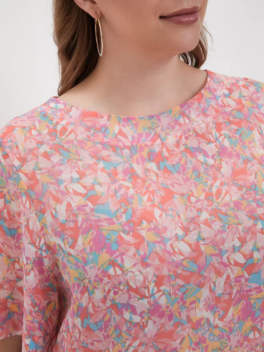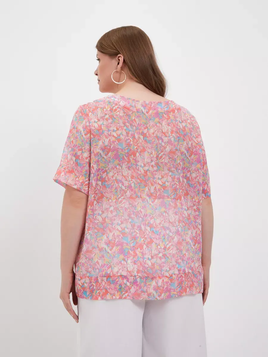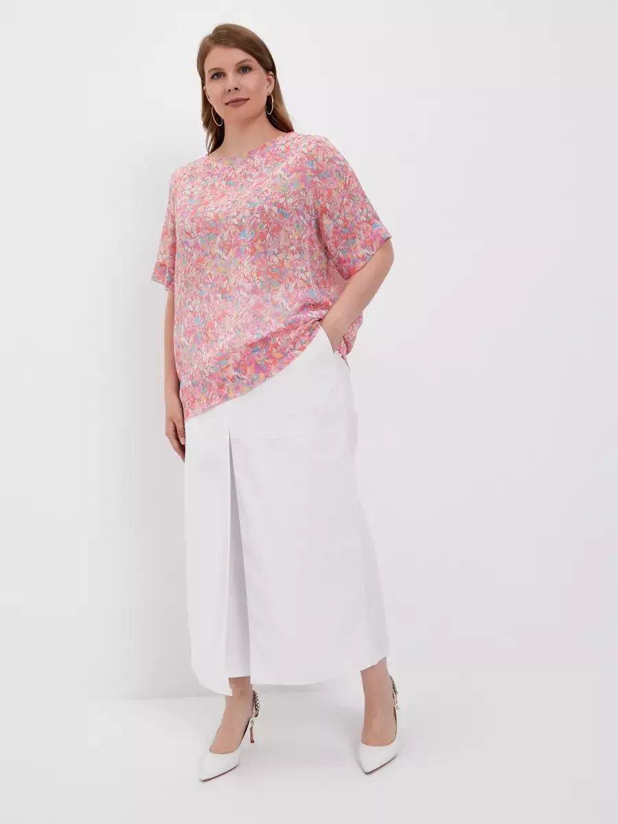 Легкая элегантная блузка больших размеров от бренда OLSI выполнена из премиум шифона с матовой поверхностью. Принтованная женская блузка Олси с короткими широкими рукавами с широким подгибом по низу, плечо приспущено; с круглым вырезом по горловине. По низу блузки широкая подгибка с отделочной строчкой, - что придает дорогой вид. Фасон блузки широкий и укороченный. Лаконичный крой блузки топа подойдет девушкам и женщинам любого возраста. Блузка женская будет уместна в любой ситуации, как повседневная блузка на работу или учебу, так и на праздничное или вечернее мероприятие, свидание. Блузка футболка отлично сочетается с джинсами, классическими брюками, юбкой. Можно носить как футболка под пиджак или жилет. Данная модель станет базовой в гардеробе модниц. Бренд OLSI это высокое качество изделий, премиальные ткани из Южкой Кореи, и собственное производство в Москве.