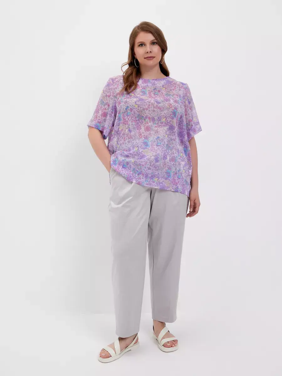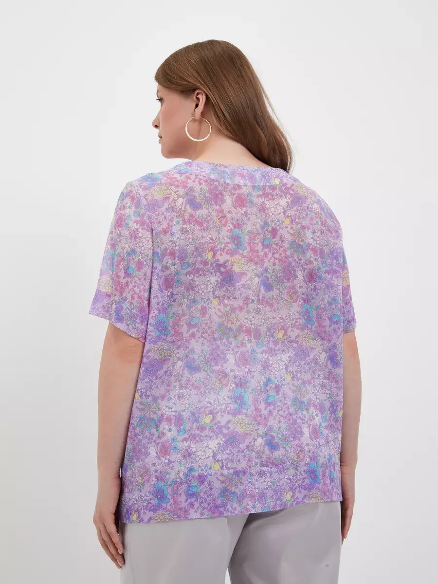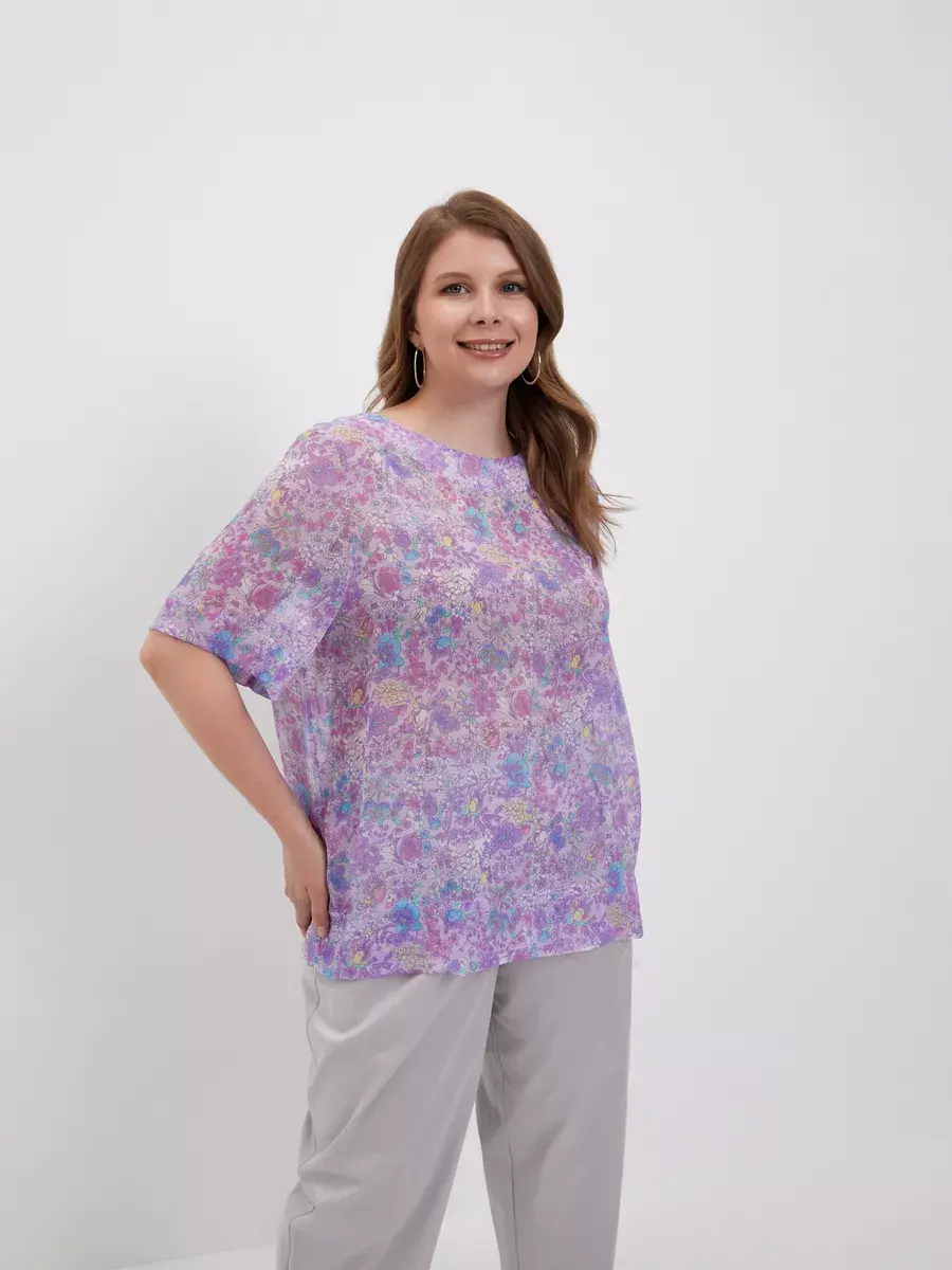 Легкая элегантная блузка больших размеров от бренда OLSI выполнена из премиум шифона с матовой поверхностью. Принтованная женская блузка Олси с короткими широкими рукавами с широким подгибом по низу, плечо приспущено; с круглым вырезом по горловине. По низу блузки широкая подгибка с отделочной строчкой, - что придает дорогой вид. Фасон блузки широкий и укороченный. Лаконичный крой блузки топа подойдет девушкам и женщинам любого возраста. Блузка женская будет уместна в любой ситуации, как повседневная блузка на работу или учебу, так и на праздничное или вечернее мероприятие, свидание. Блузка футболка отлично сочетается с джинсами, классическими брюками, юбкой. Можно носить как футболка под пиджак или жилет. Данная модель станет базовой в гардеробе модниц. Бренд OLSI это высокое качество изделий, премиальные ткани из Южкой Кореи, и собственное производство в Москве.