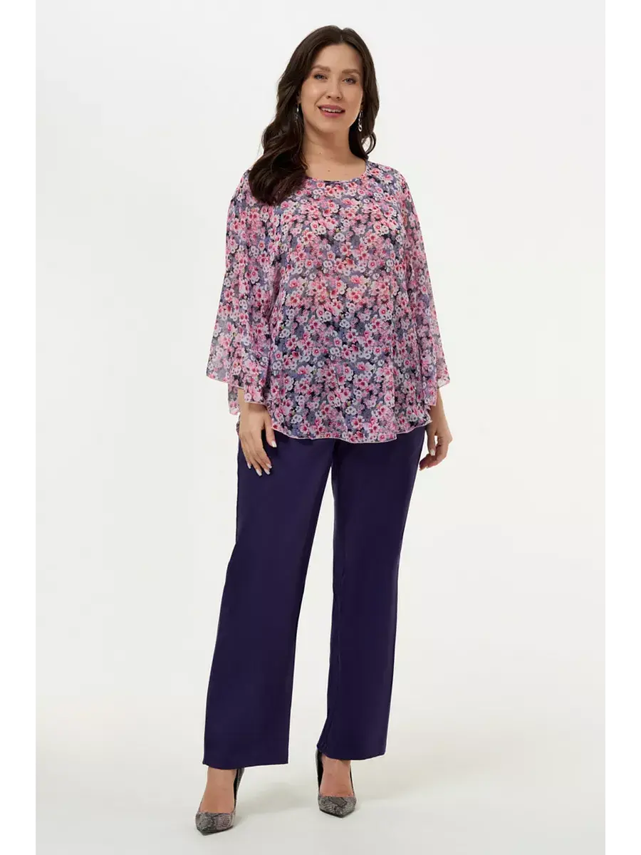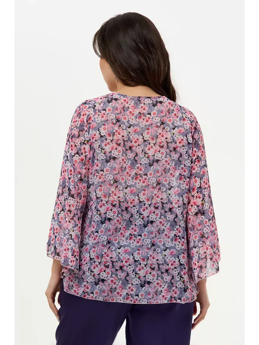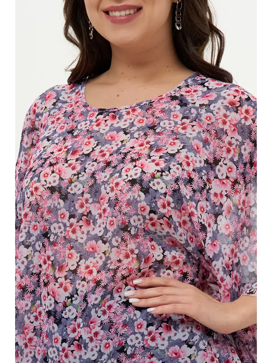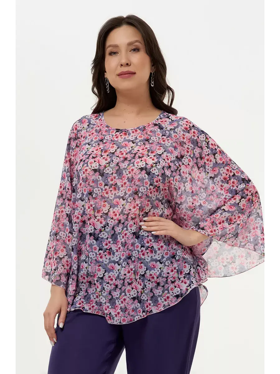Стильная полупрозрачная блузка летней цветочной расцветки, похожая на воздушную пелерину. Женская блузка из шифона с широким рукавом-кимоно, круглым вырезом горловины и округлым низом, отделанным опиковкой. Модель скроет все несовершенства линий, даст возможность чувствовать себя комфортно и уверенно. Добавит образу легкости и романтики. Подойдет для женщин с любым типом фигуры. Повседневная блузка большого размера, выполнена из тонкого шифона с принтом. Стильная блузка женская больших размеров, Шифоновая блузка широкая, Пелерина женская летняя