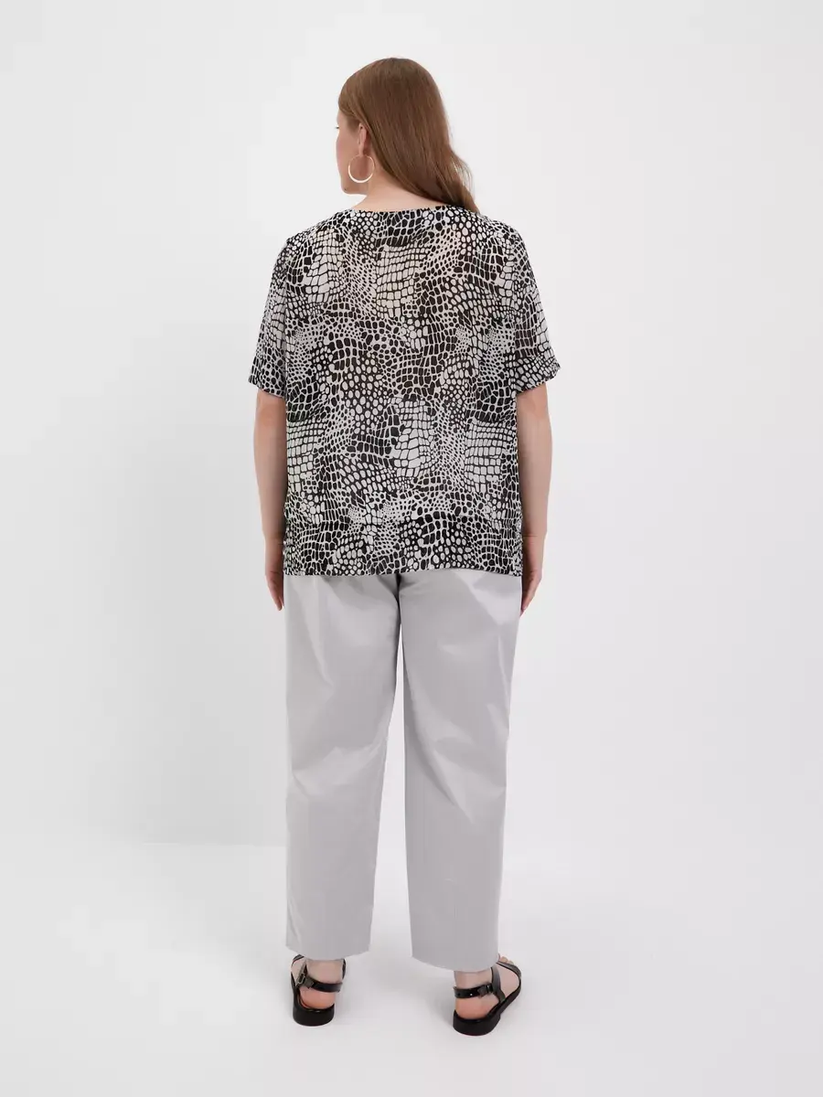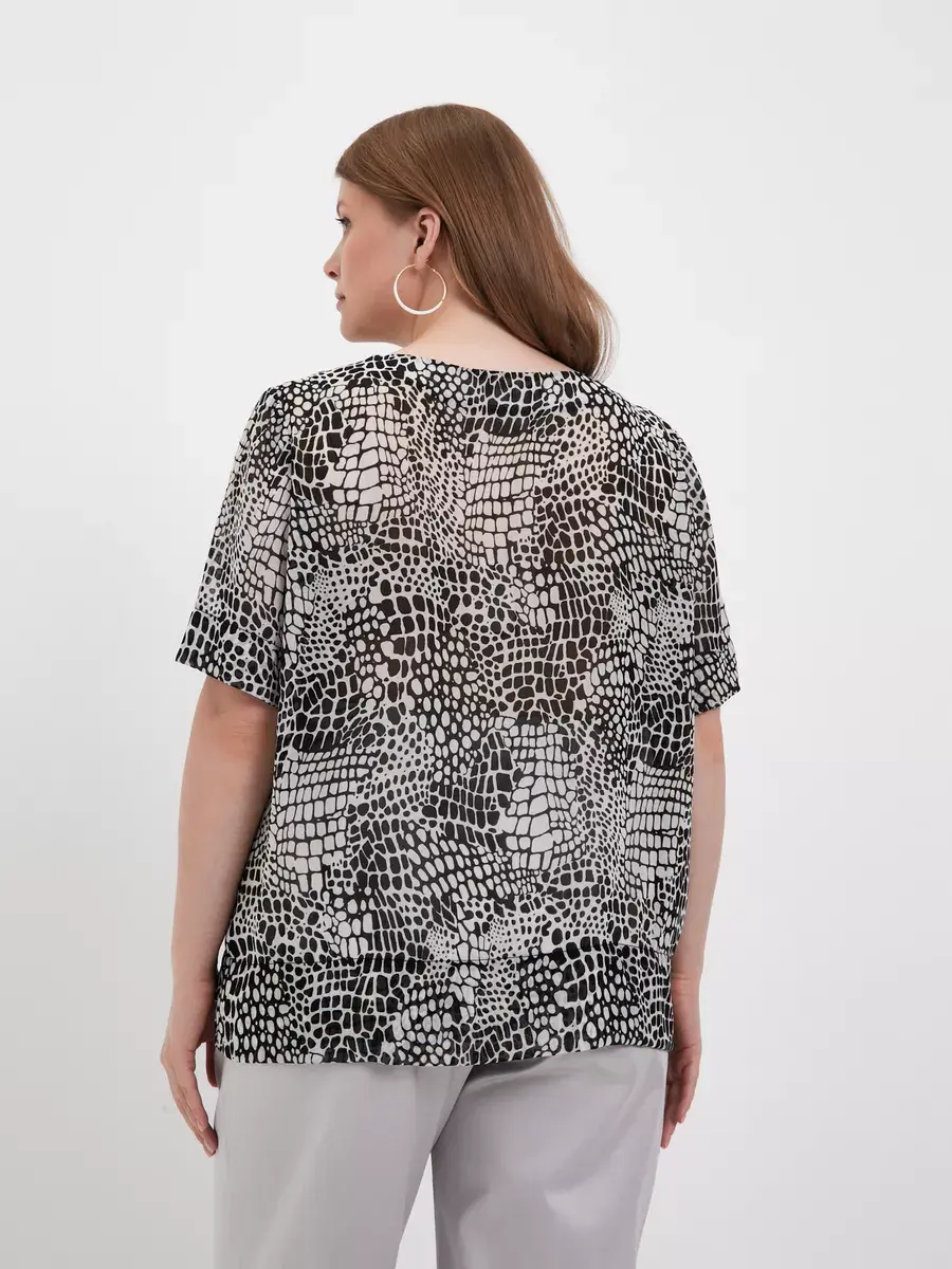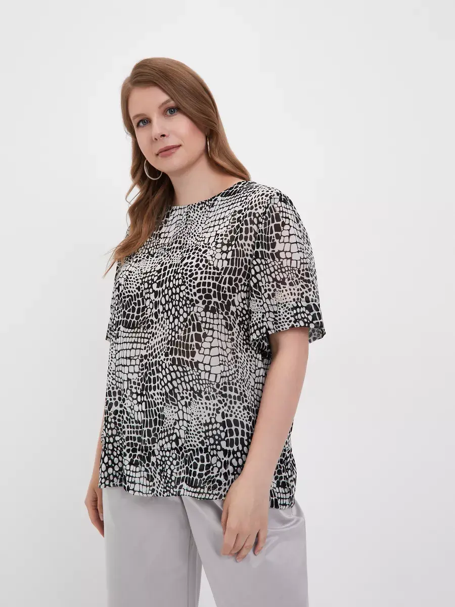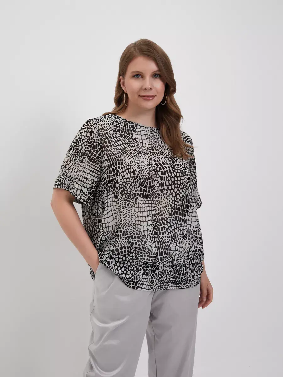 Легкая элегантная блузка больших размеров от бренда OLSI выполнена из премиум шифона с матовой поверхностью. Принтованная женская блузка Олси с короткими широкими рукавами с широким подгибом по низу, плечо приспущено; с круглым вырезом по горловине. По низу блузки широкая подгибка с отделочной строчкой, - что придает дорогой вид. Фасон блузки широкий и укороченный. Лаконичный крой блузки топа подойдет девушкам и женщинам любого возраста. Блузка женская будет уместна в любой ситуации, как повседневная блузка на работу или учебу, так и на праздничное или вечернее мероприятие, свидание. Блузка футболка отлично сочетается с джинсами, классическими брюками, юбкой. Можно носить как футболка под пиджак или жилет. Данная модель станет базовой в гардеробе модниц. Бренд OLSI это высокое качество изделий, премиальные ткани из Южкой Кореи, и собственное производство в Москве.