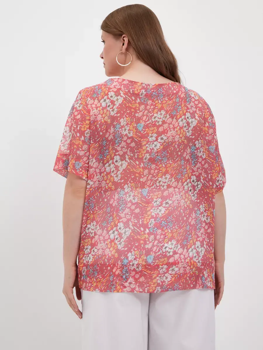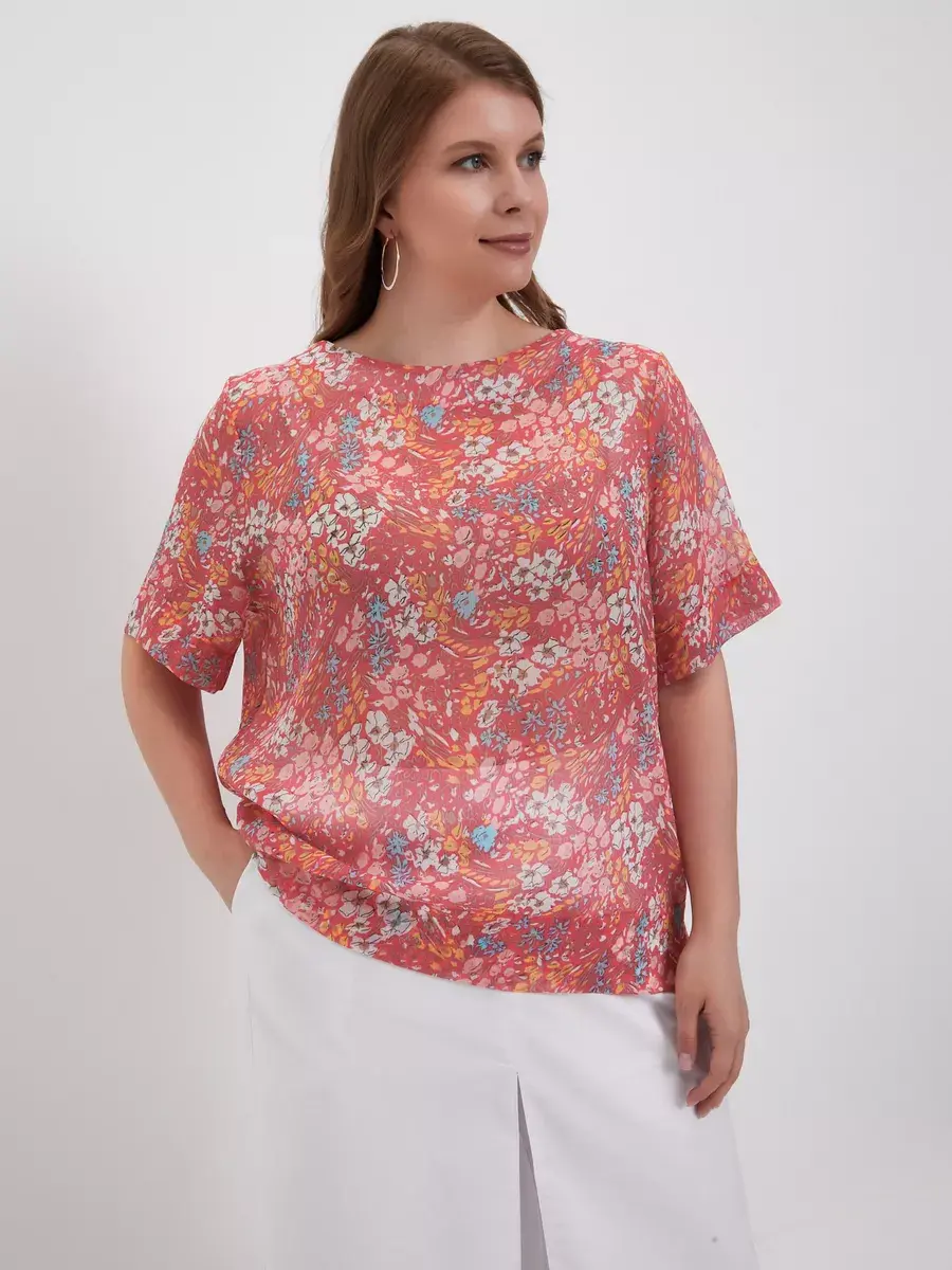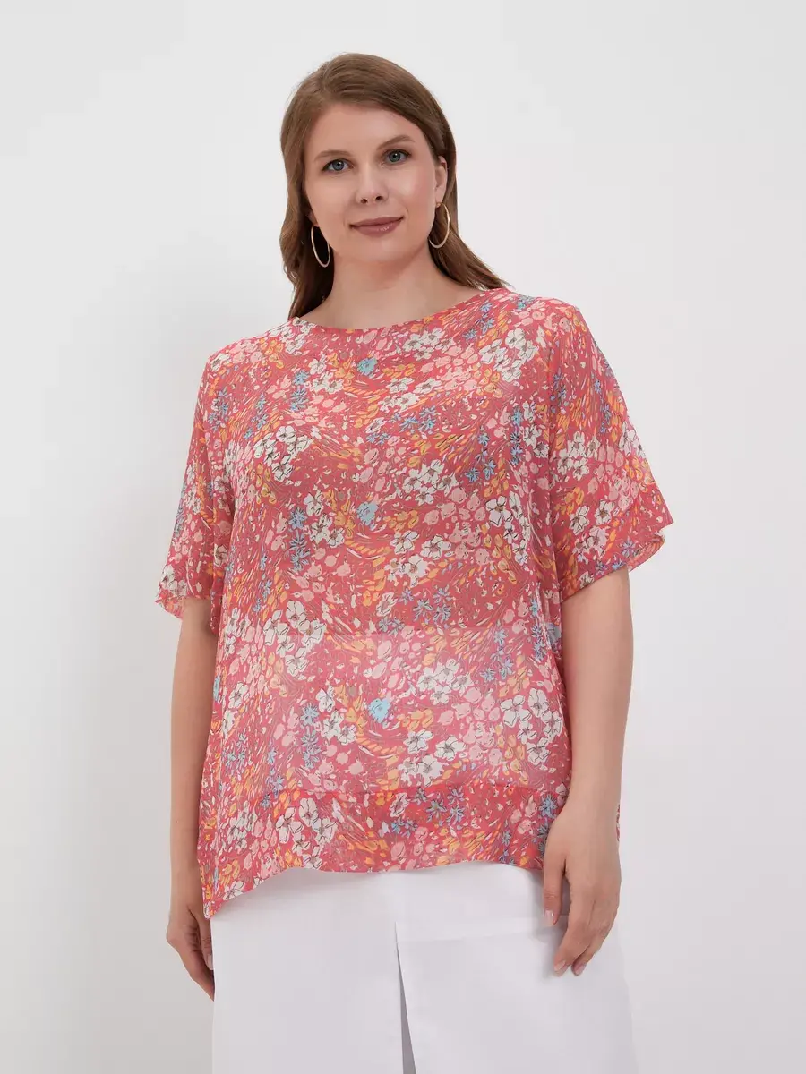 Легкая элегантная блузка больших размеров от бренда OLSI выполнена из премиум шифона с матовой поверхностью. Принтованная женская блузка Олси с короткими широкими рукавами с широким подгибом по низу, плечо приспущено; с круглым вырезом по горловине. По низу блузки широкая подгибка с отделочной строчкой, - что придает дорогой вид. Фасон блузки широкий и укороченный. Лаконичный крой блузки топа подойдет девушкам и женщинам любого возраста. Блузка женская будет уместна в любой ситуации, как повседневная блузка на работу или учебу, так и на праздничное или вечернее мероприятие, свидание. Блузка футболка отлично сочетается с джинсами, классическими брюками, юбкой. Можно носить как футболка под пиджак или жилет. Данная модель станет базовой в гардеробе модниц. Бренд OLSI это высокое качество изделий, премиальные ткани из Южкой Кореи, и собственное производство в Москве.