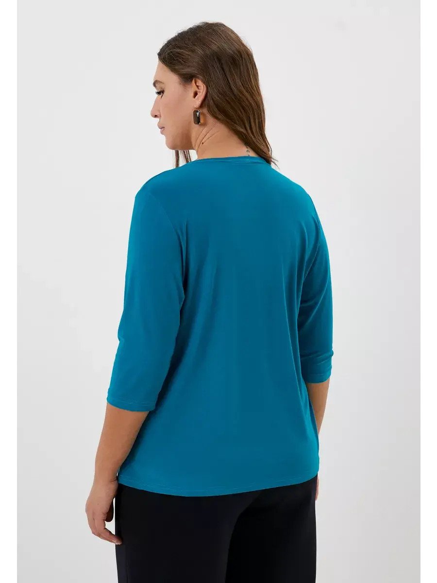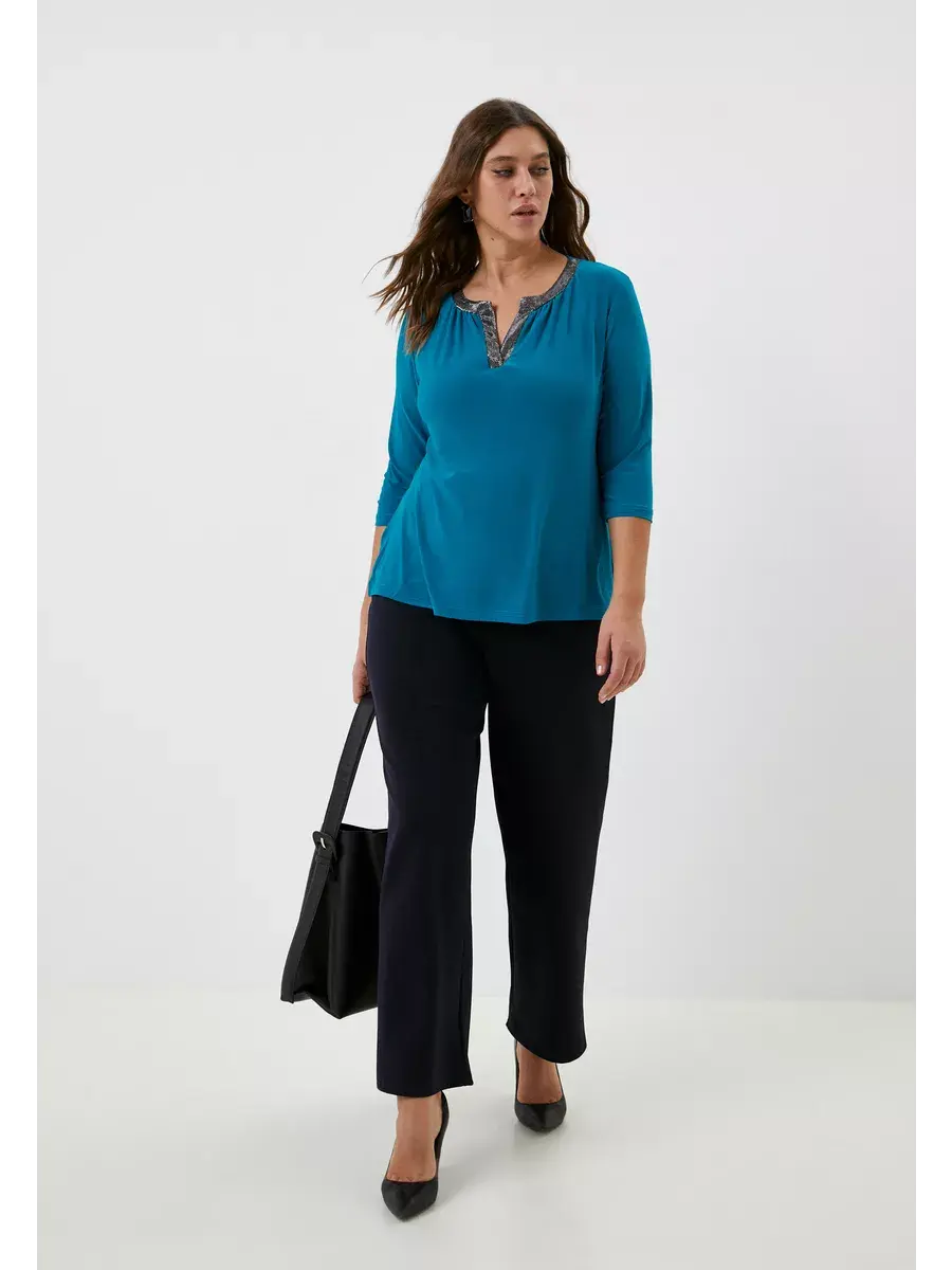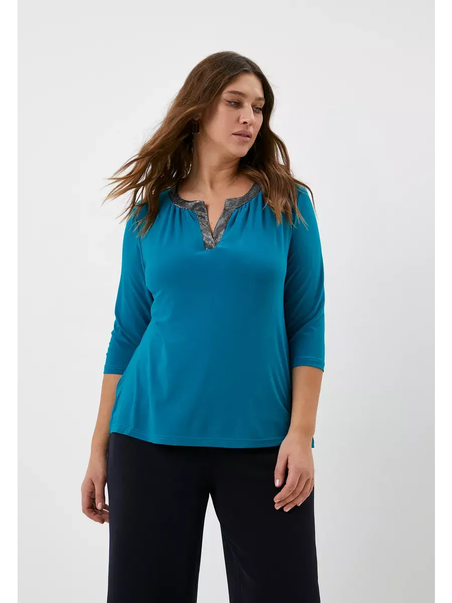Элегантная нарядная блузка-туника больших размеров от бренда OLSI, классического кроя, с втачным рукавом 3/4. Изюминка модели - горловина с фигурным вырезом «замочная скважина», отделанная блестящим трикотажем. Вырез акцентирует внимание на лице и линии шеи, придает образу одухотворенность. Изделие не стесняет движение, визуально стройнит и «подтягивает» силуэт. Подойдет для женщин с любым типом фигуры.