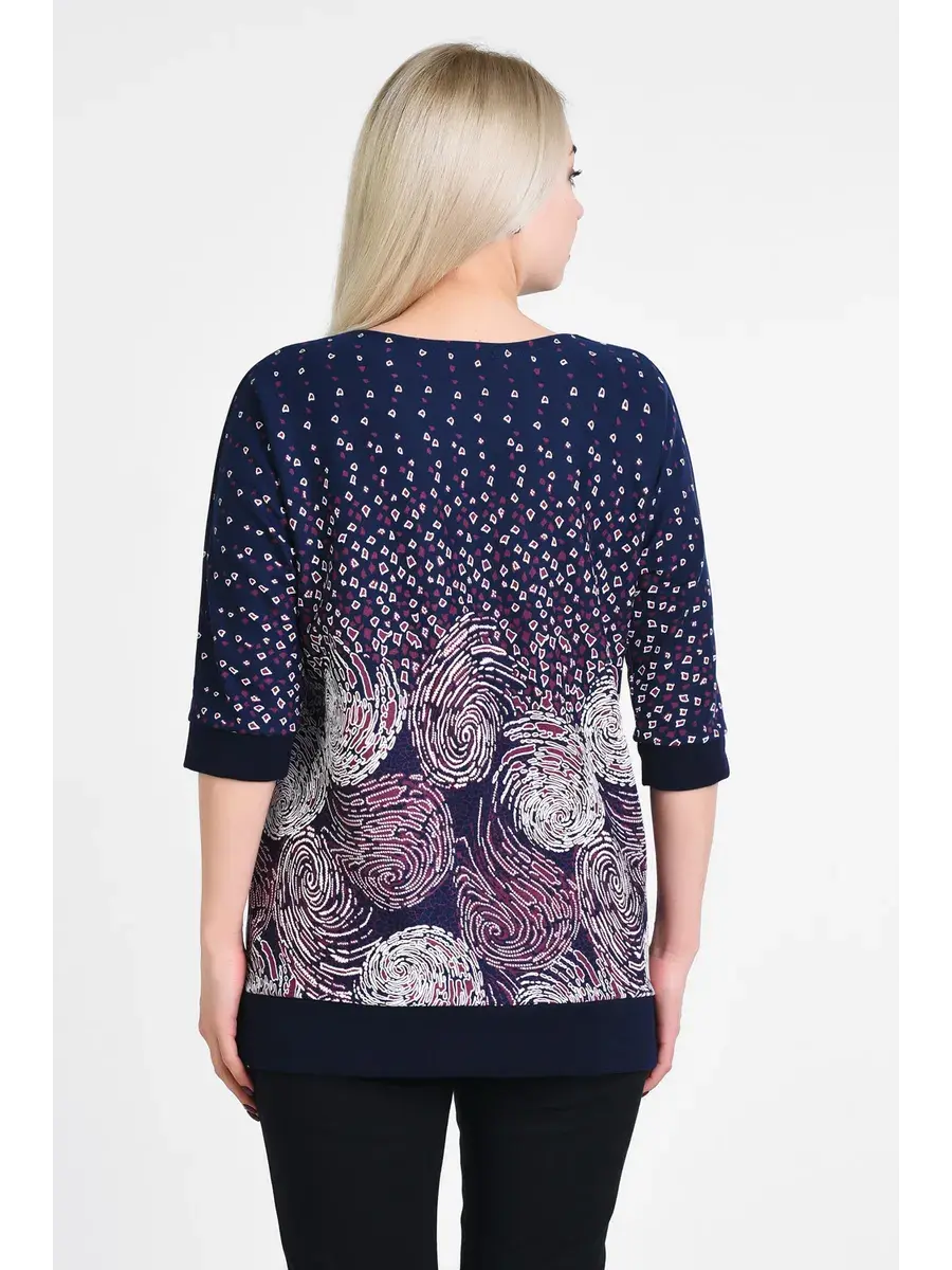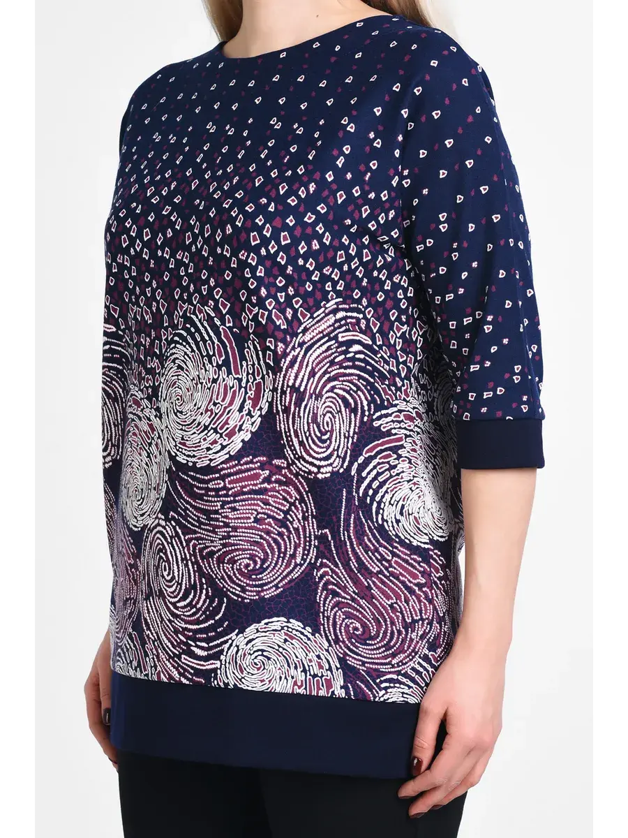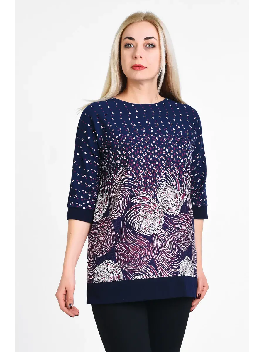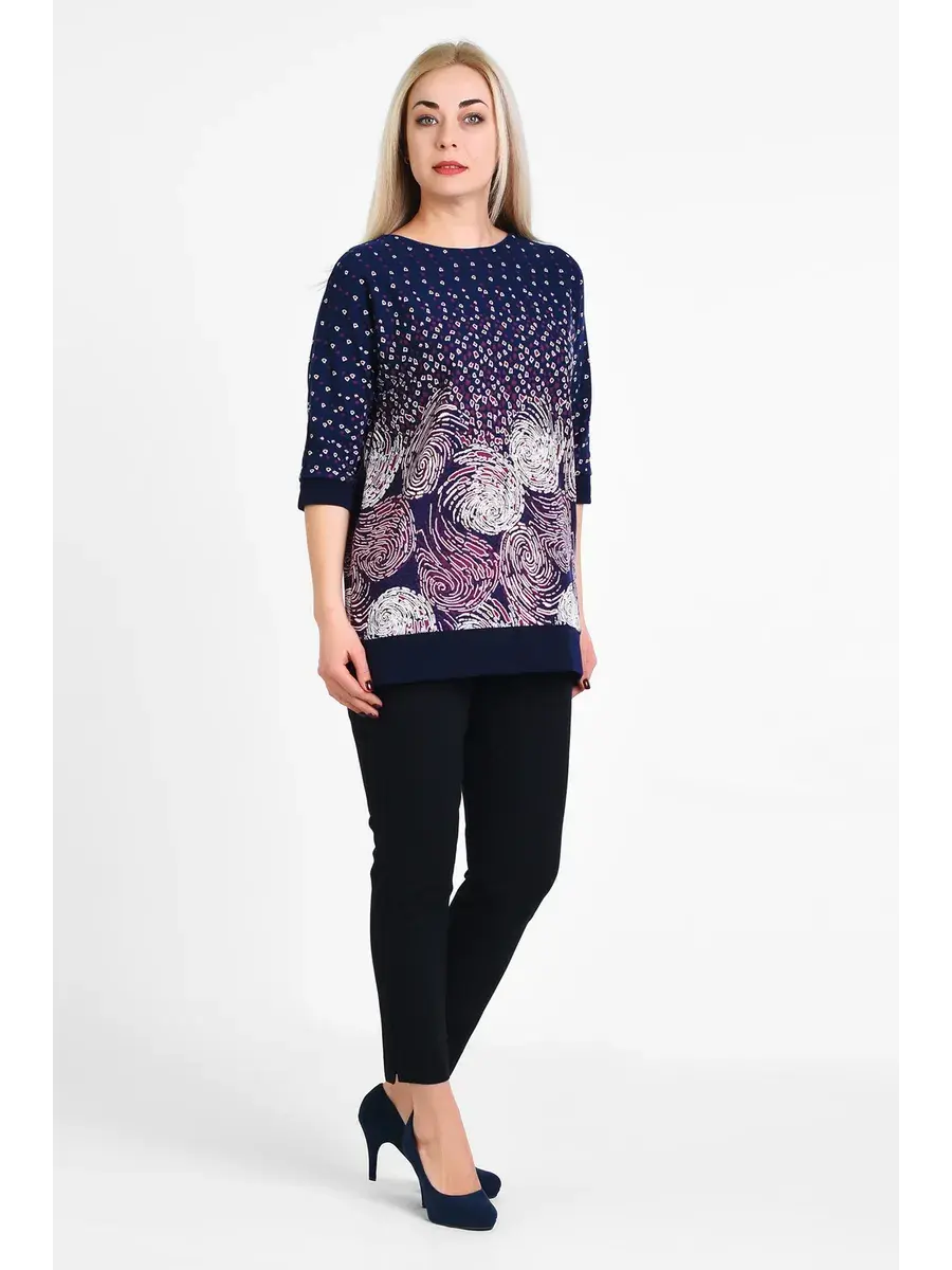 Эффектная стильная туника из плотного тонкого трикотажа с принтом в стилистике звездного неба В. Ван Гога. Модель с вырезом горловины лодочка, цельнокроеными рукавами длиной 3/4; манжет по низу изделия и на обшлагах выполнены из однотонной ткани, что в ансамбле с динамикой рисунка придает четкость силуэту. Туника придает фигуре изящество, корректирует пропорции, придает образу мечтательность и романтические нотки.