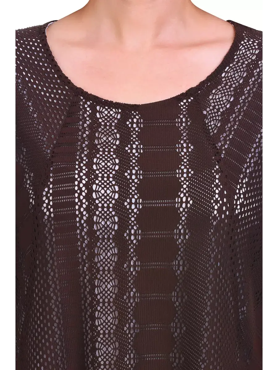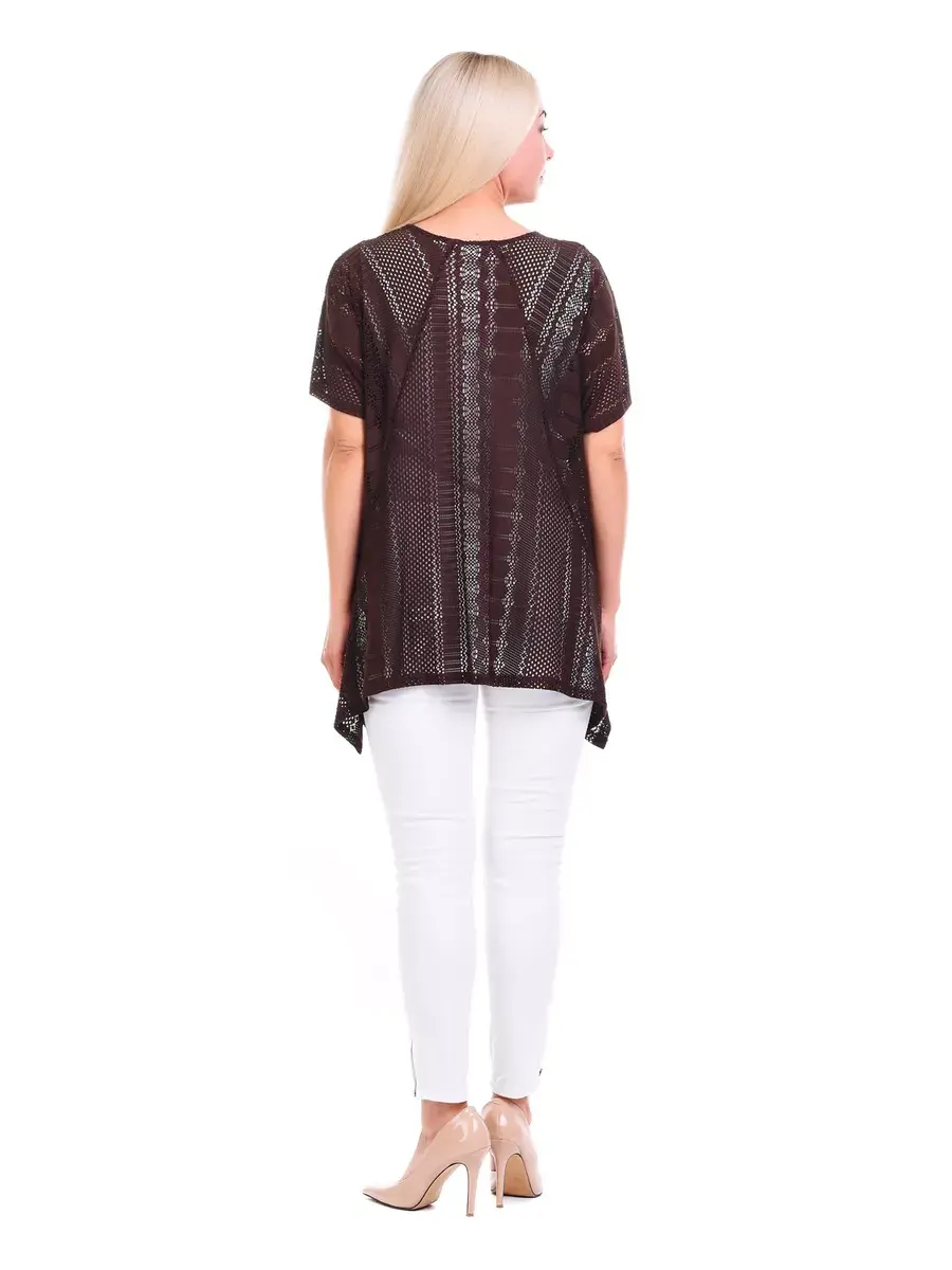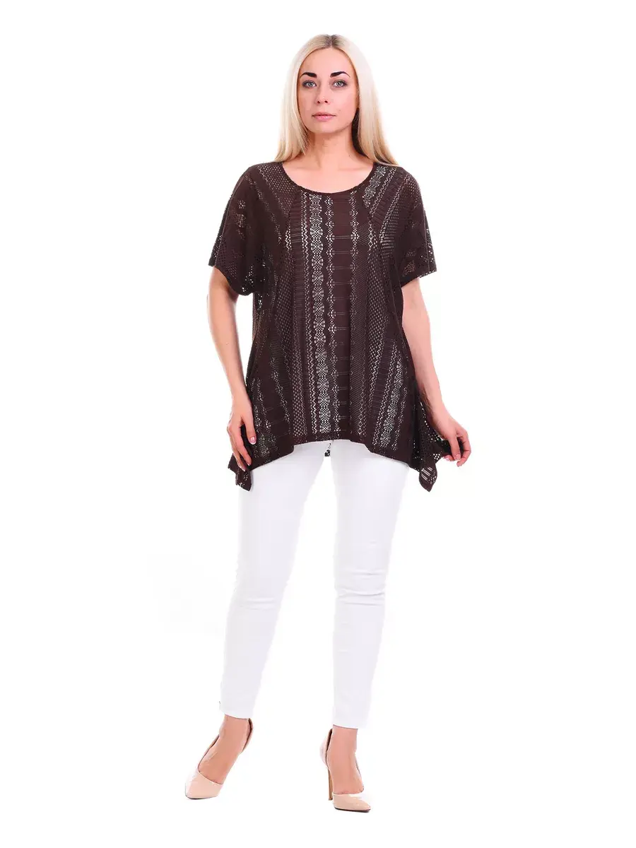 Стильная блузка-туника больших размеров от бренда OLSI выполнена из ажурного трикотажа со сквозным рисунком-перфорацией. Пляжная туника с глубоким круглым вырезом горловины, подчеркивающим красоту шеи, цельнокроеными рукавами длиной по локоть, асимметричным низом, вуалирующим объем бедер, и приоткрывающим ноги спереди, что визуально придает им стройность и длину. Ажурная туника также легко впишется в городской стиль, если комбинировать ее с топом под низ. В целом модель женской блузки создает ощущение свежести, женственности.