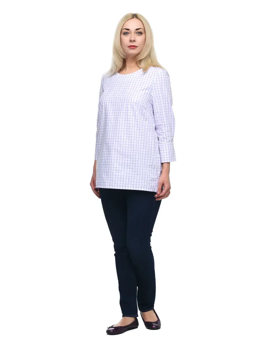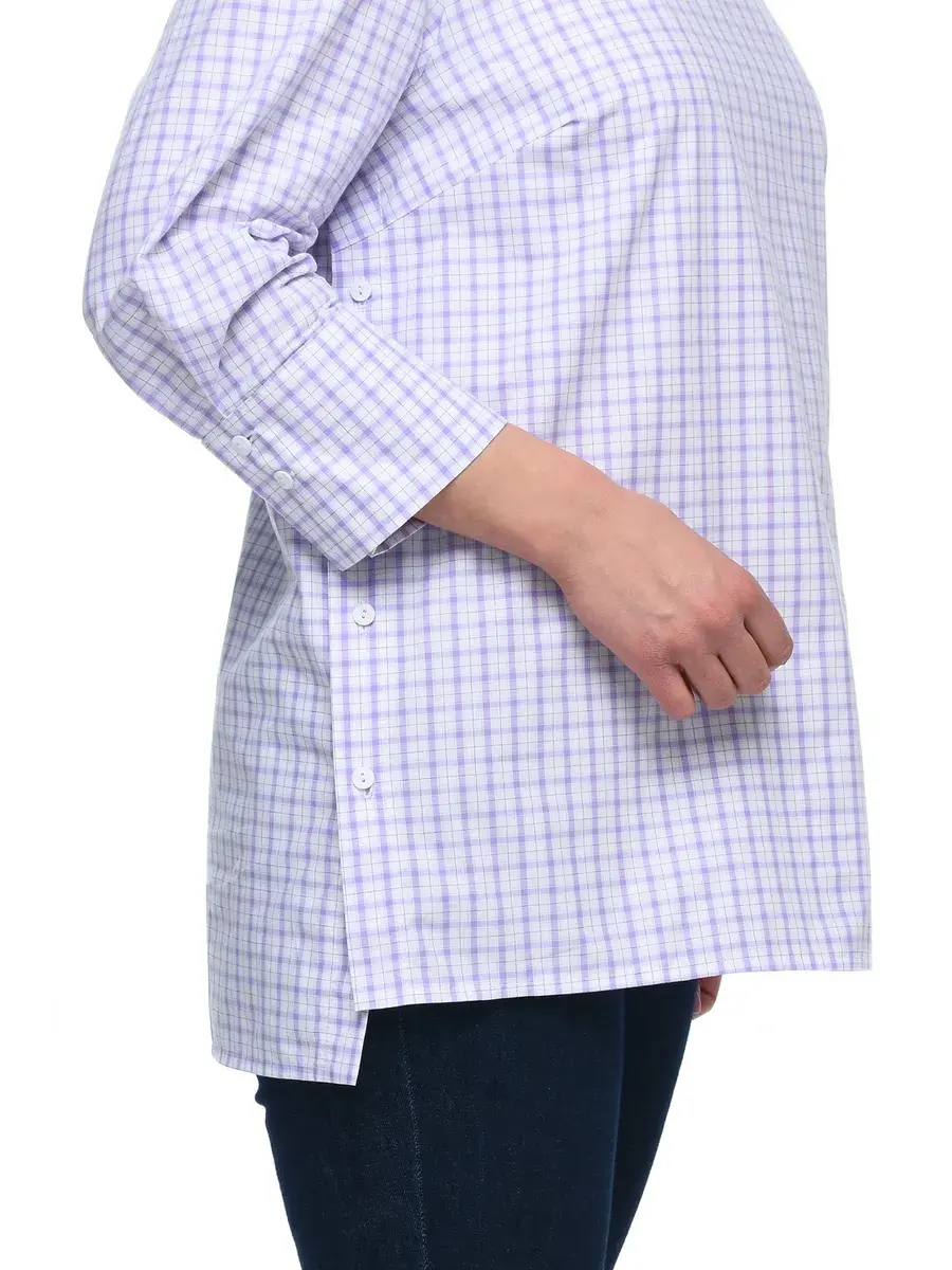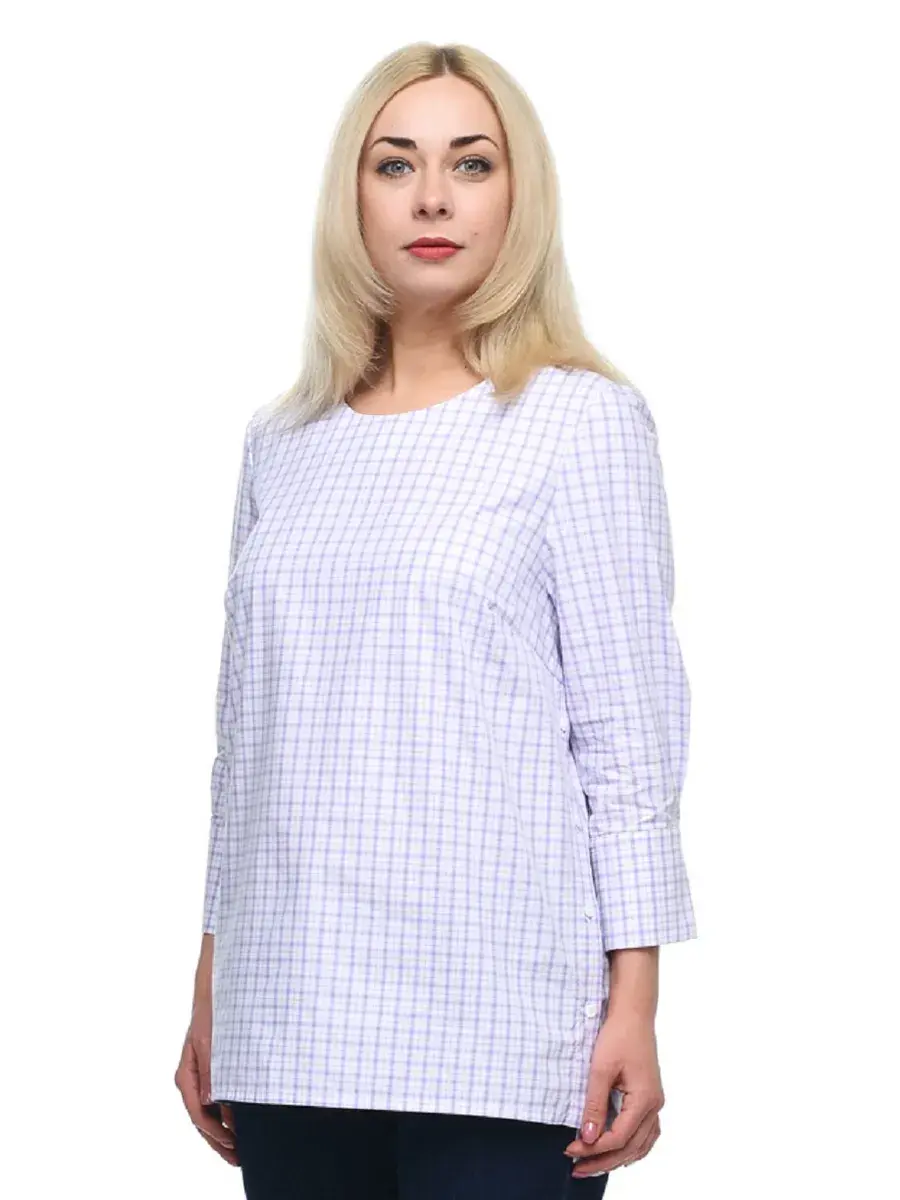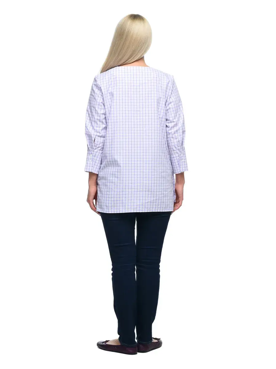 Лаконичная блузка-туника из тонкой дышащей ткани в мелкую клетку; с круглым вырезом горловины, втачными рубашечными рукавами 3/4, на широких манжетах с двумя пуговицами. Низ изделия чуть длиннее по спинке, глубина разрезов по бокам регулируется застежкой на пуговицах. Крой модели придает образу спокойствие и женственность, а мелкая клетка и детали – деловитость.