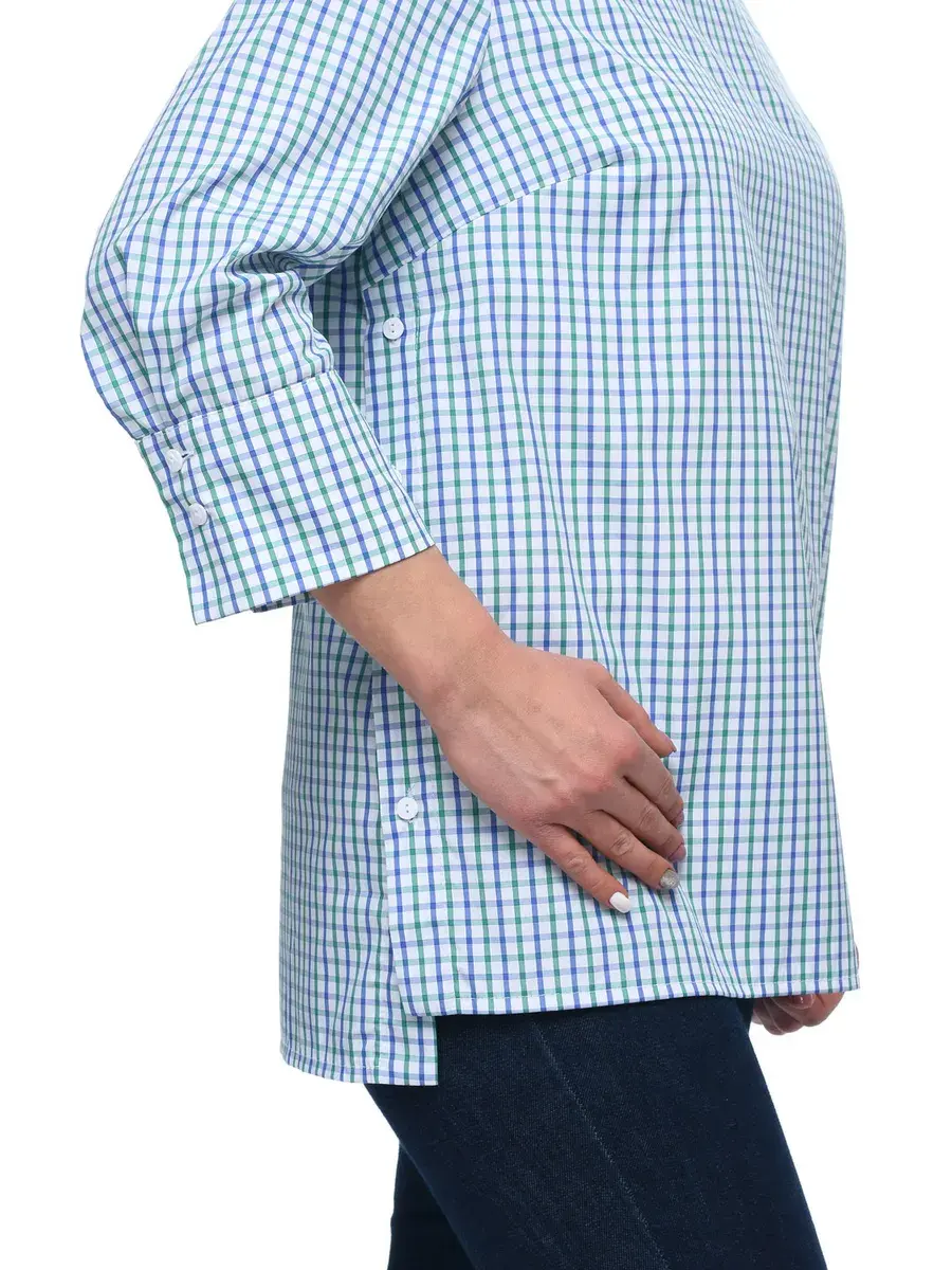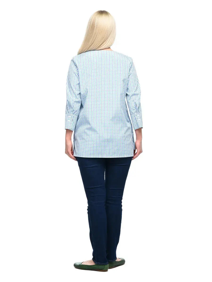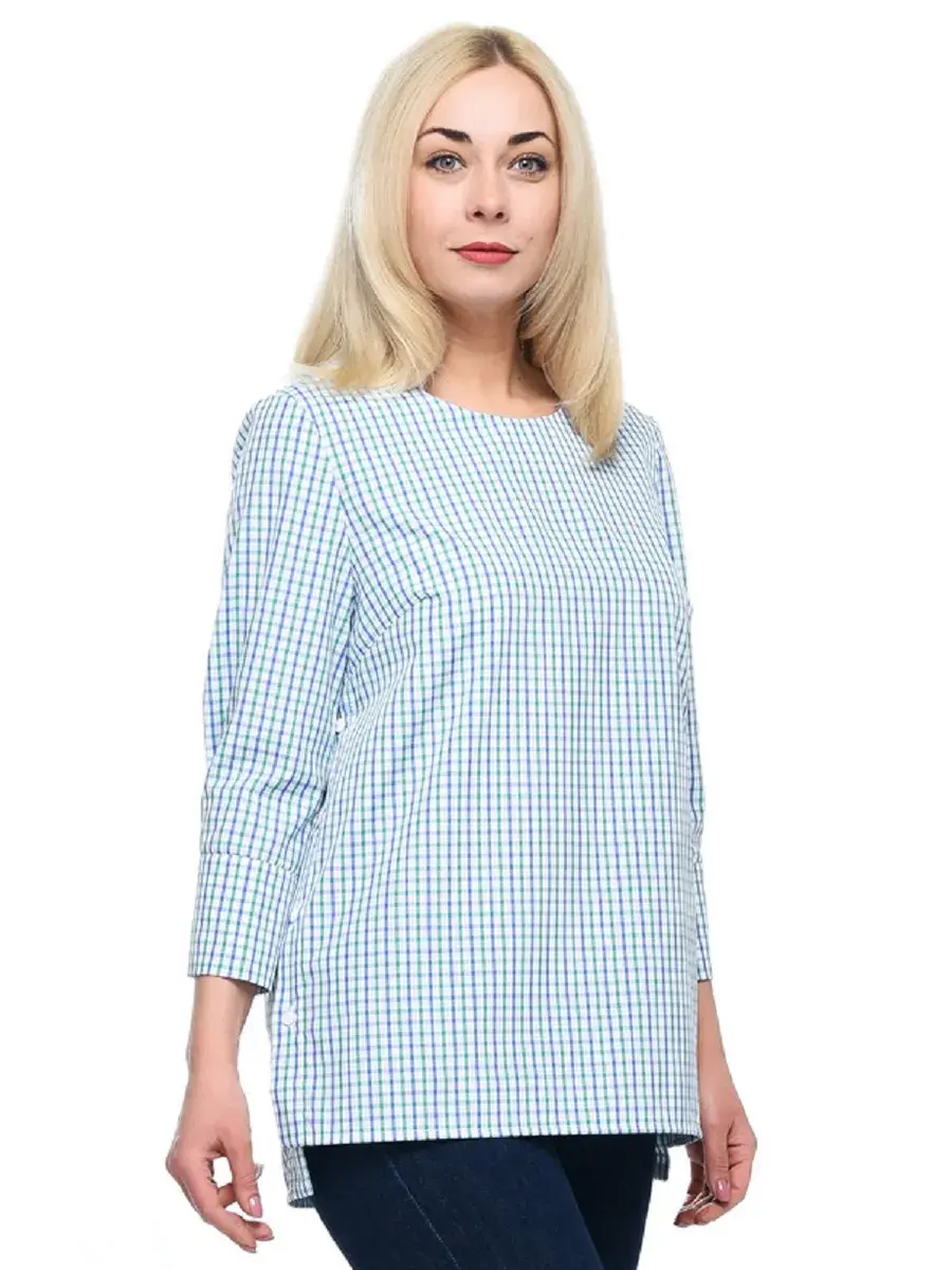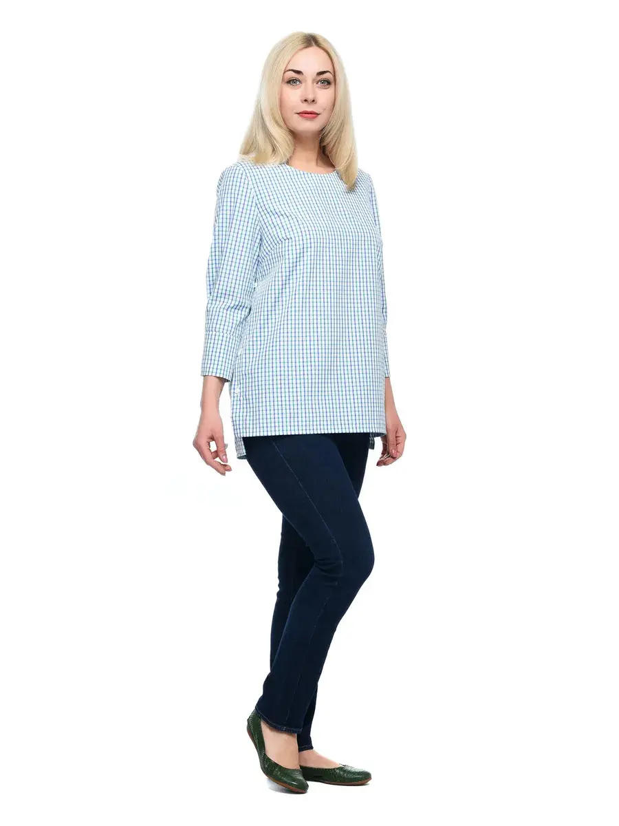 Лаконичная блузка-туника из тонкой дышащей ткани в мелкую клетку; с круглым вырезом горловины, втачными рубашечными рукавами 3/4, на широких манжетах с двумя пуговицами. Низ изделия чуть длиннее по спинке, глубина разрезов по бокам регулируется застежкой на пуговицах. Крой модели придает образу спокойствие и женственность, а мелкая клетка и детали – деловитость.