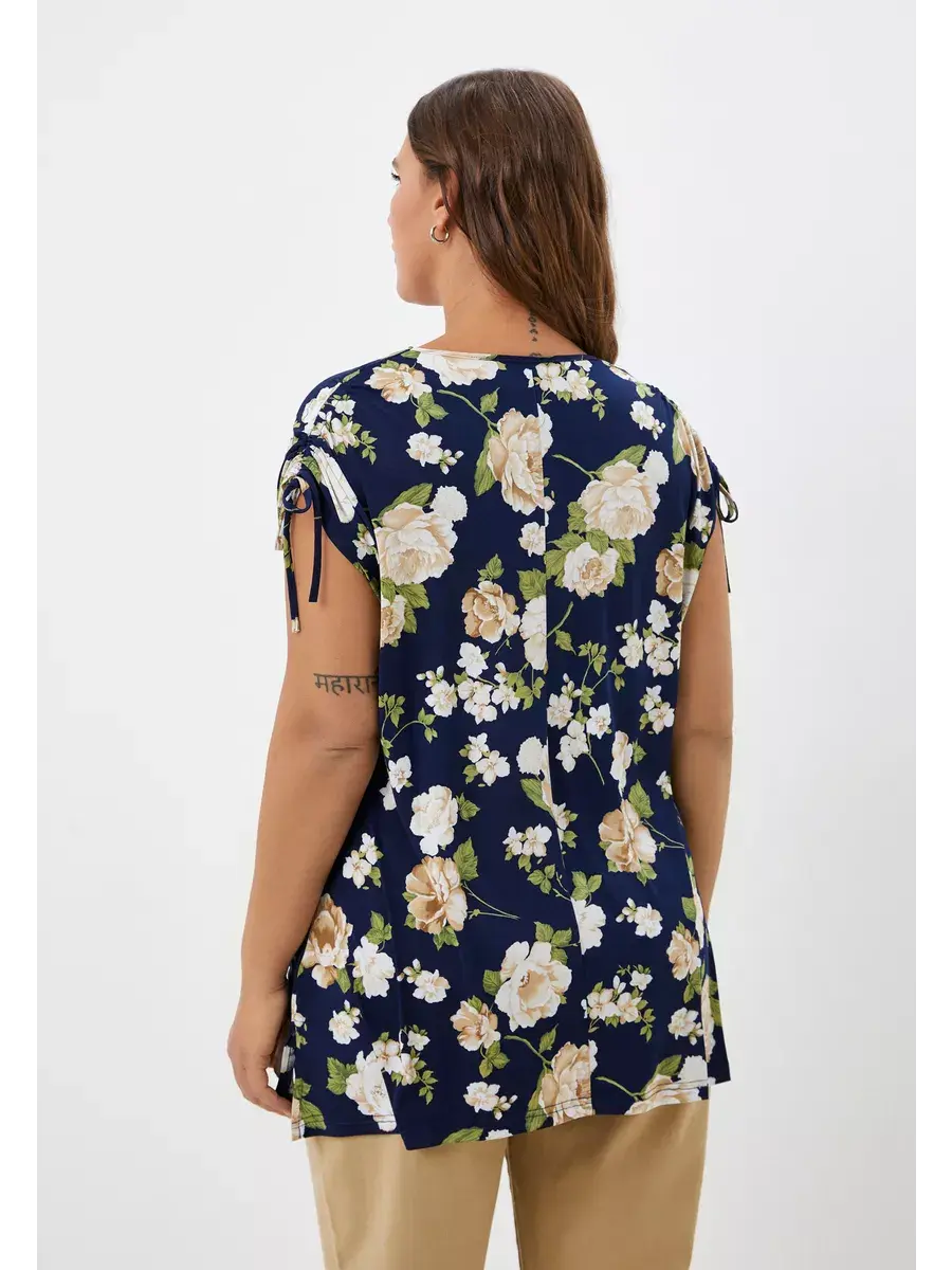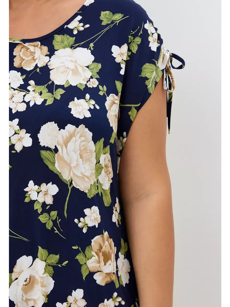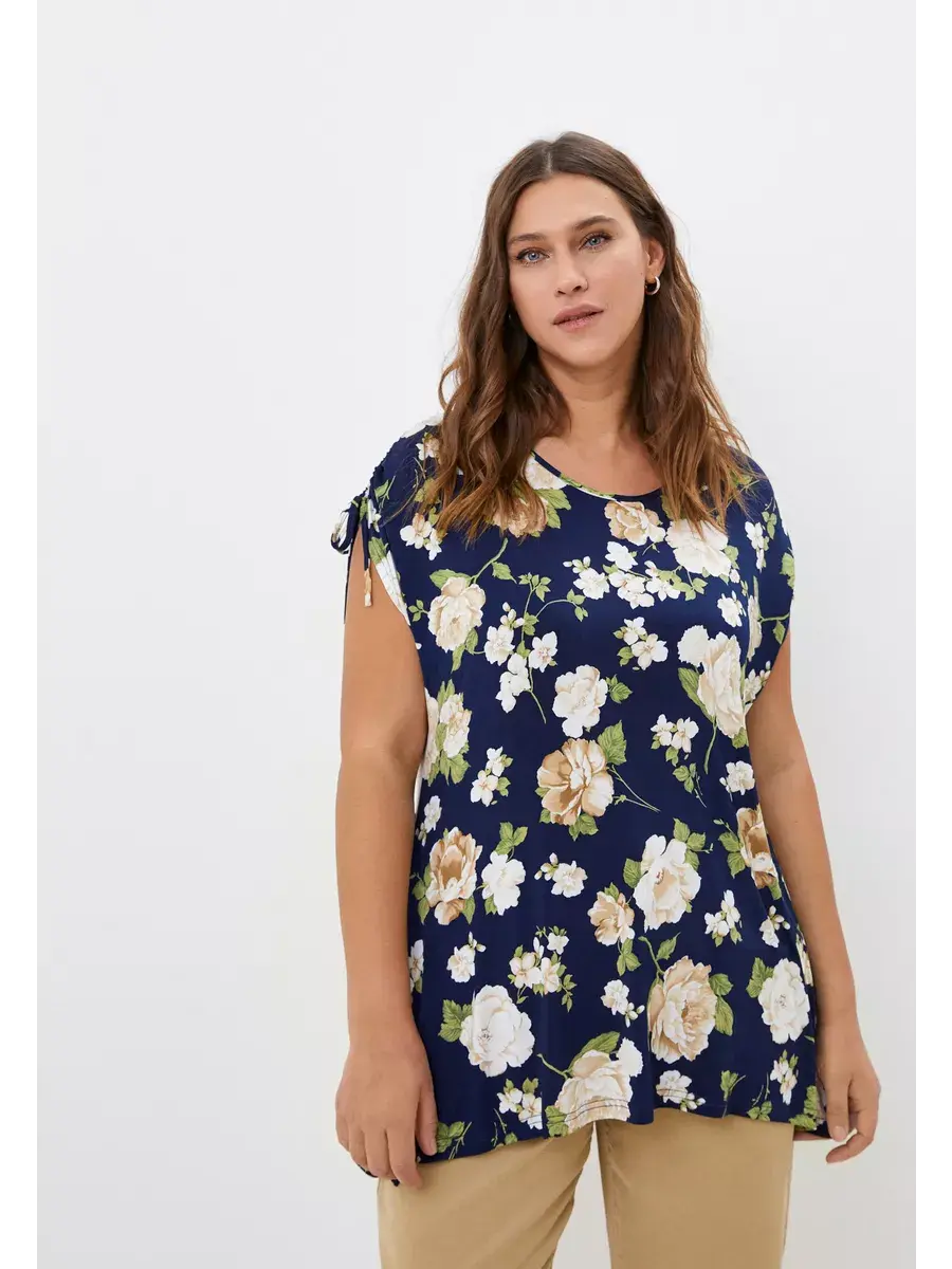 Стильная летняя туника от бренда OLSI из тонкой ткани с крупным цветочным принтом. Женская футболка выполнена из трикотажа масло. Модель с глубоким круглым вырезом горловины; с короткими рукавами крылышко со спущенной проймой; с двойной кулиской с завязками на плечах, с асимметричным низом - аркой спереди, с разрезами по бокам. Изделие полуприлегающего, слегка расклешенного силуэта, придающего фигуре изящество и легкость. Идеально подходит для прогулок, встречи с друзьями, его обязательно нужно взять с собой на отдых.