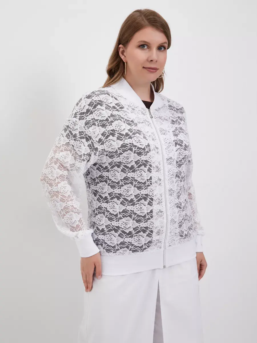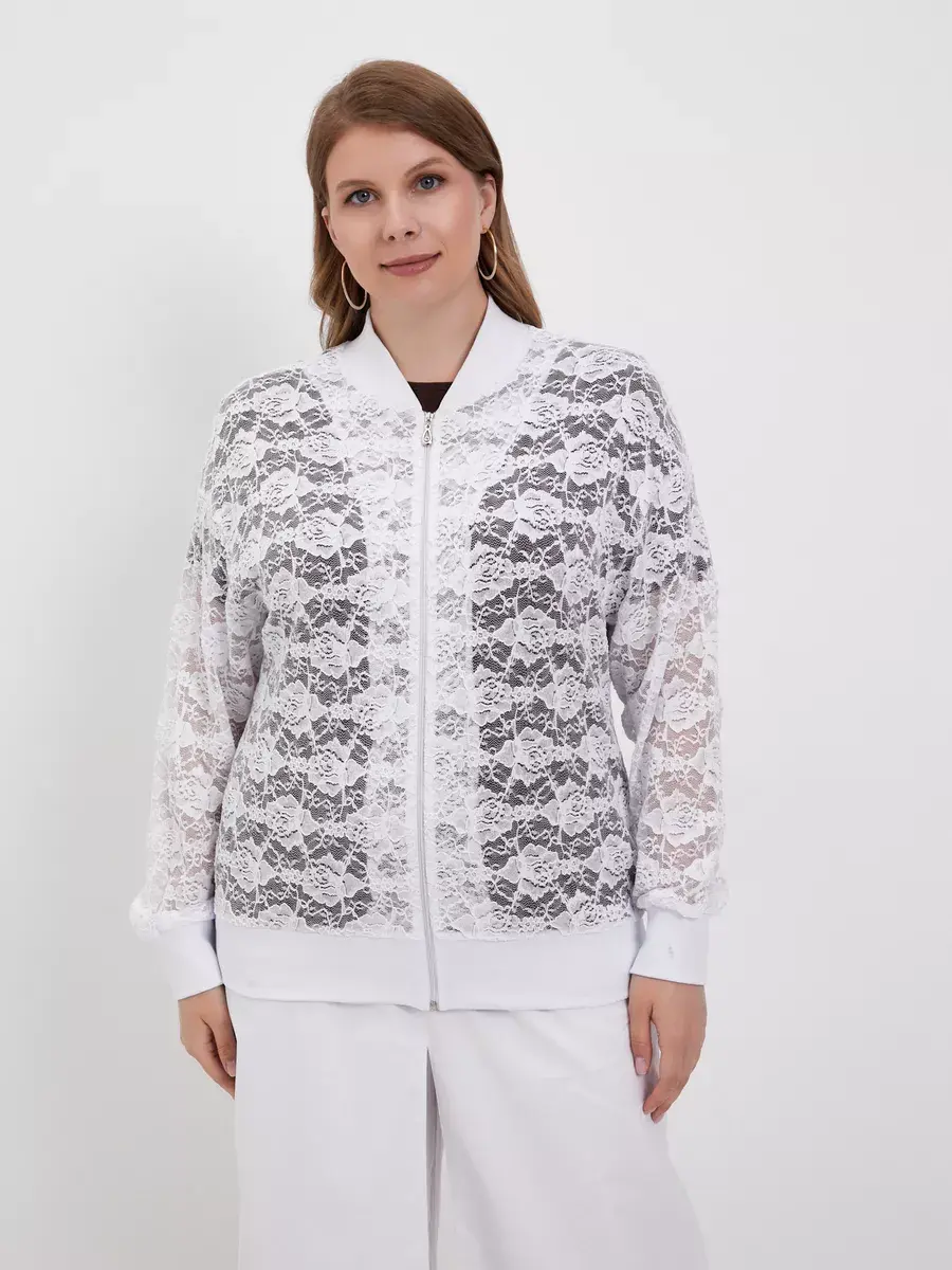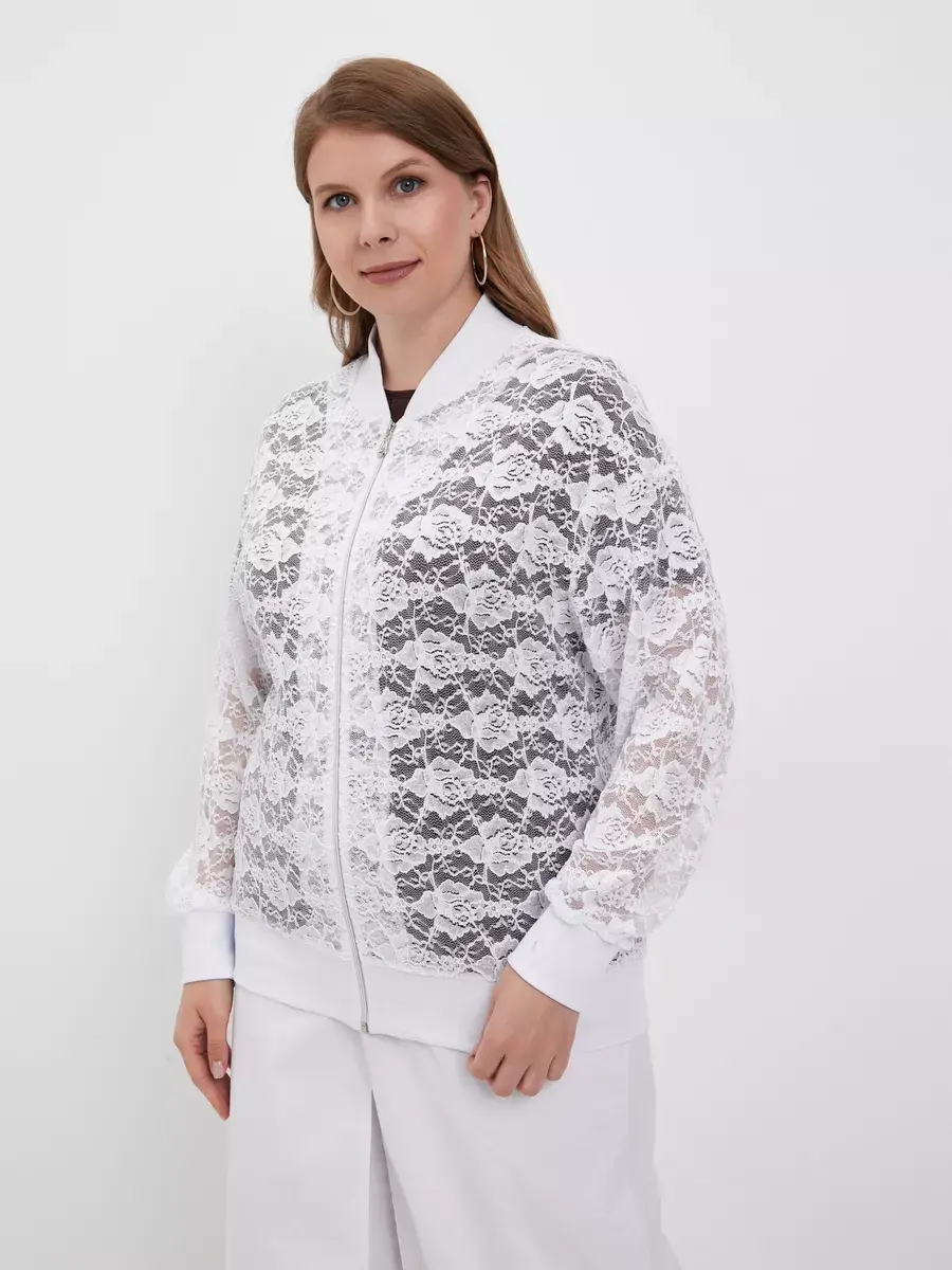 Лёгкий кружевной жакет больших размеров от бренда OLSI, выполнен из полотна по типу гипюра. Кружевной бомбер больших размеров Олси из мягкого, приятного на ощупь кружевного полотна с эластаном, без подкладки. Легкий летний бомбер с длинным рукавом имеет воротником и манжетами по низу и рукавах из трикотажа, жакет с застежкой-молнией, без карманов. Рисунок кружева - розы. Отличный вариант для повседневной носки, также можно носить как нарядная накидка.