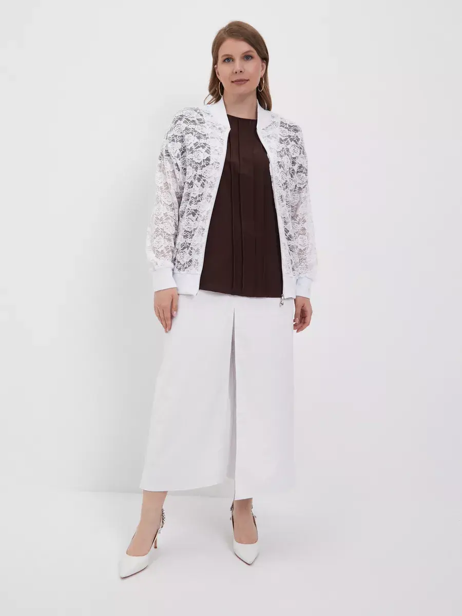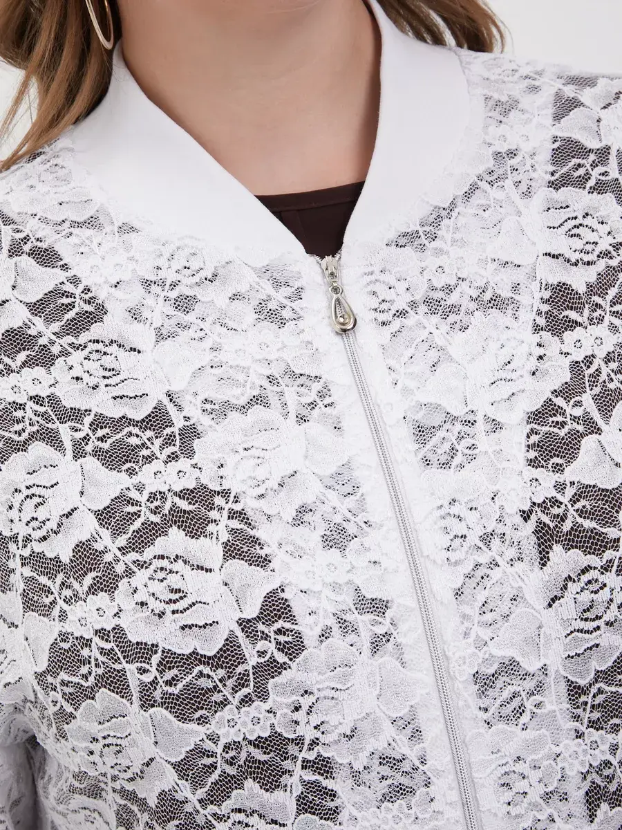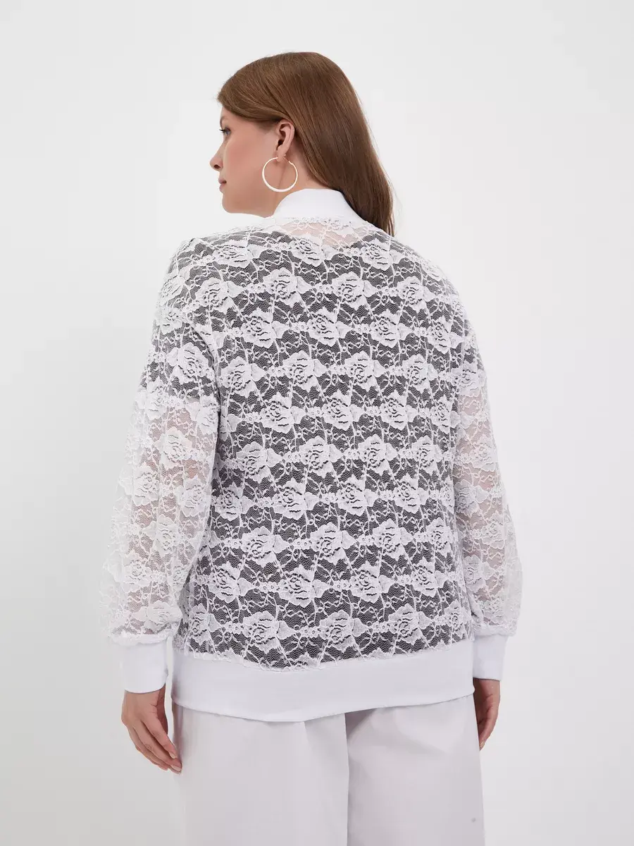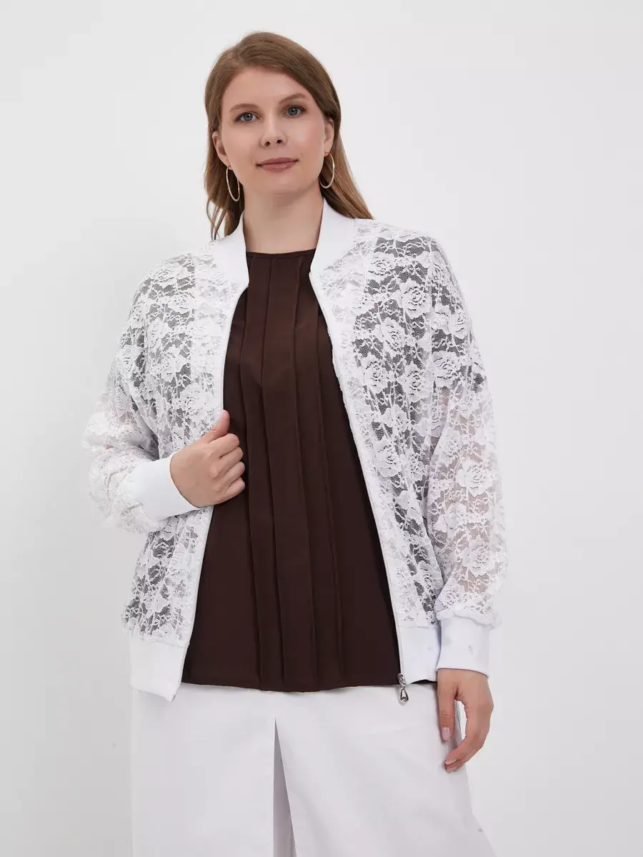 Лёгкий кружевной жакет больших размеров от бренда OLSI, выполнен из полотна по типу гипюра. Кружевной бомбер больших размеров Олси из мягкого, приятного на ощупь кружевного полотна с эластаном, без подкладки. Легкий летний бомбер с длинным рукавом имеет воротником и манжетами по низу и рукавах из трикотажа, жакет с застежкой-молнией, без карманов. Рисунок кружева - розы. Отличный вариант для повседневной носки, также можно носить как нарядная накидка.