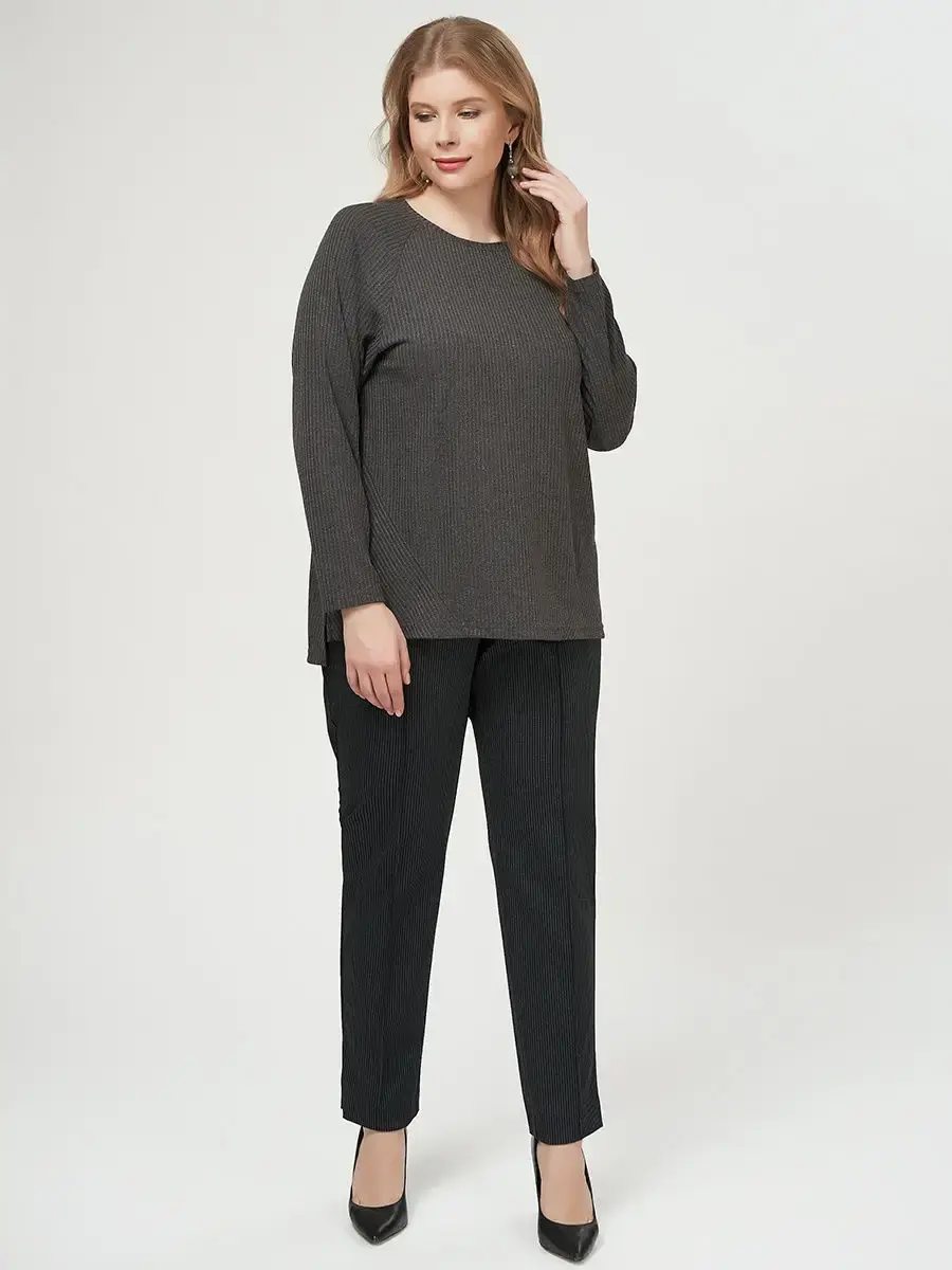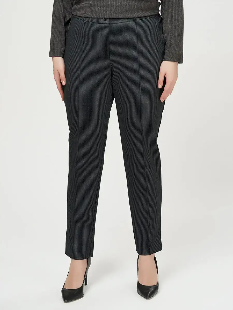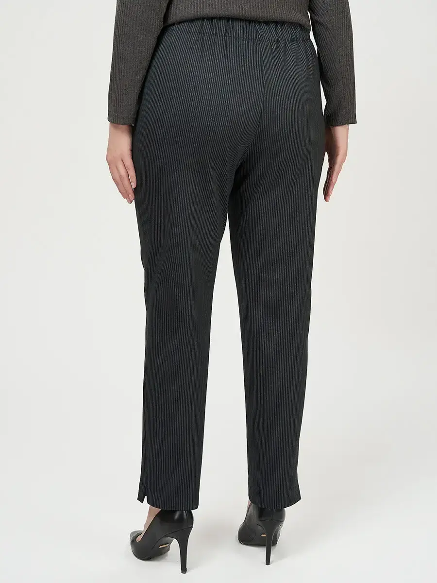 Классические брюки со стрелками из плотной ткани с рельефным плетением, комфортным поясом на резинке сзади, гульфиком спереди и косыми фальш-карманами по бокам. Модель укороченная, чуть зауженная книзу, с небольшими разрезами на уровне щиколотки. Фактура ткани, эталонные стрелки спереди, высокая посадка визуально делают ноги длиннее, а силуэт стройнее. Модель будет уместно смотреться и в офисе, и в театре, и на встрече с друзьями.