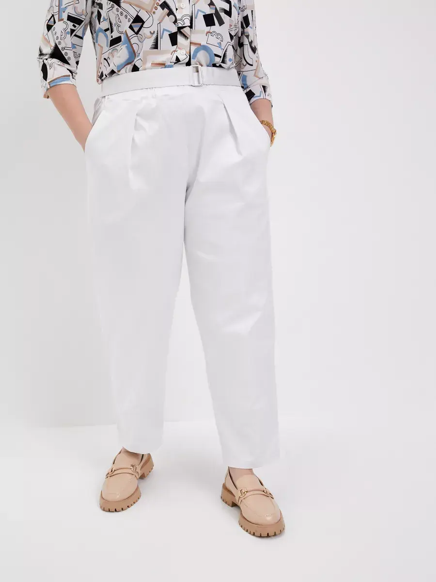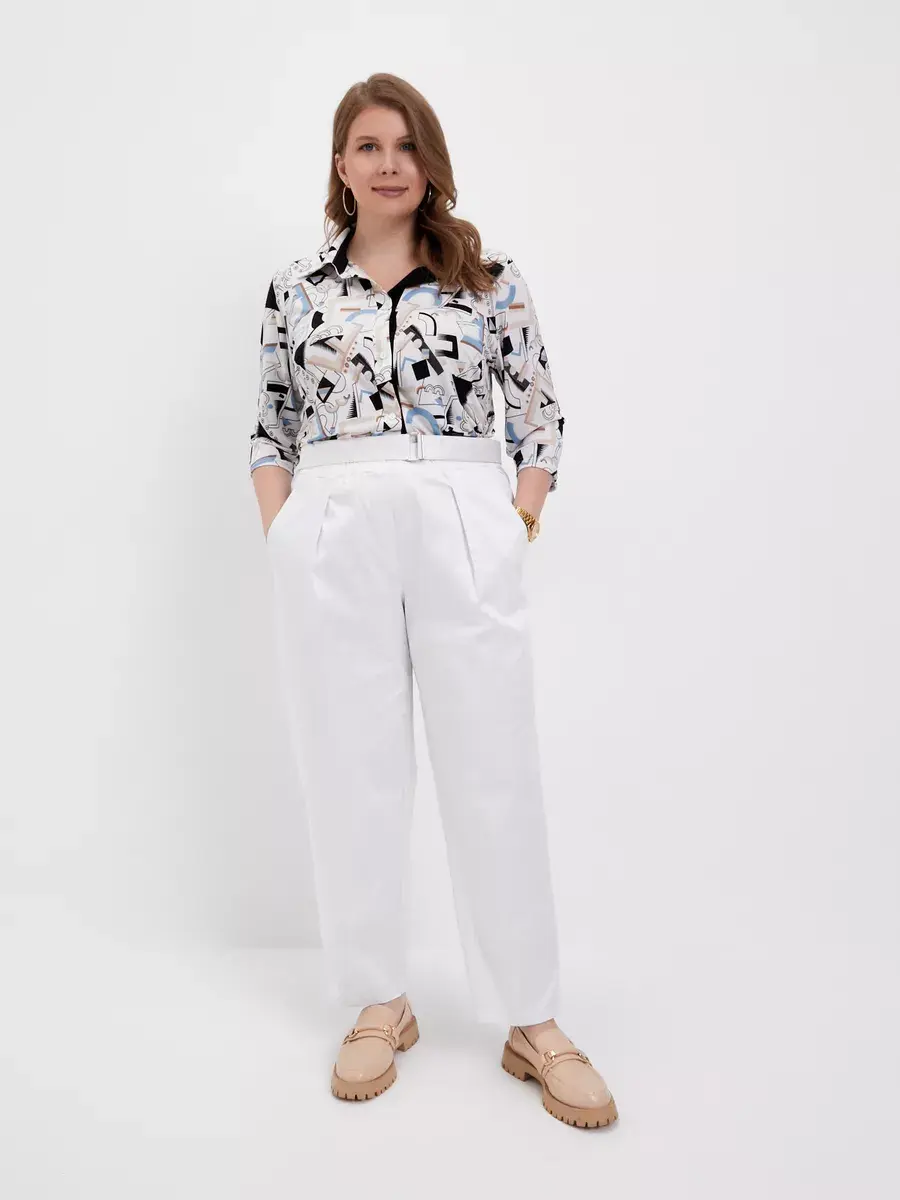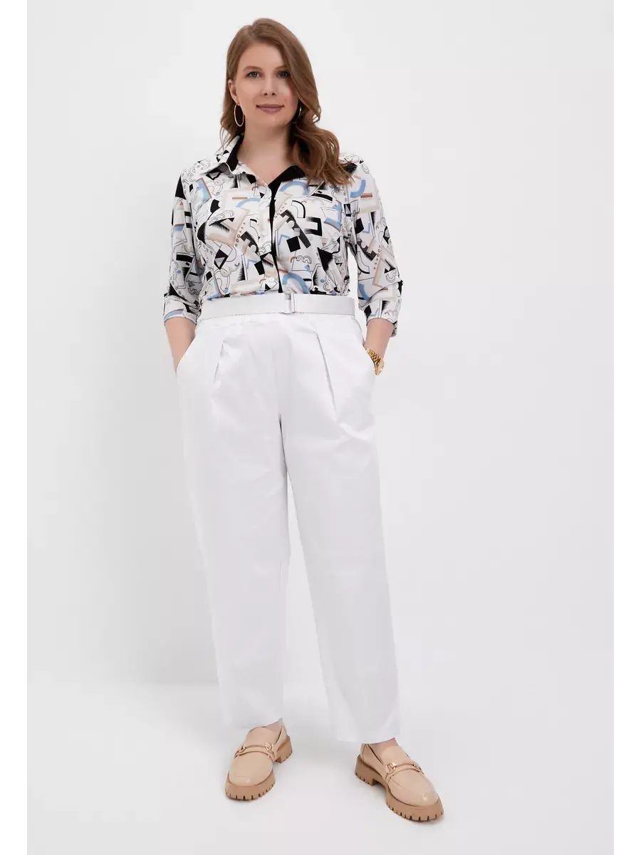 Повседневные женские брюки больших размеров бренда OLSI из хлопчатобумажной ткани с лоском. Брюки летние Олси однотонные, прямого силуэта. С функциональными карманами на передней части, застежка-обманка, и складками от пояса. Брюки без застежки, с круговой резинкой в поясе. Также пояс со свободным концом, застегивающийся на пряжку. Для заужения штанин снизу есть вытачки. Брюки длиной до щиколотки. Длина бокового шва/длина шагового шва/ширина брючины низ соответственно:р.48-101,4см/72,3см/21,5смр.50-101,7см/72,1см/22,0смр.52-101,9см/71,9см/22,5смр.54-102,3см/71,6см/23,0смр.56-102,5см/71,5см/23,5смр.58-102,9см/71,3см/24,0смр.60-103,2см/71,1см/24,5смр.62-103,5см/70,9см/25,0смр.64-103,8см/70,6см/25,5смр.66-104,3см/70,4см/26,0смр.68-104,5см/70,2см/26,5смр.70-104,8см/69,9см/27,0см