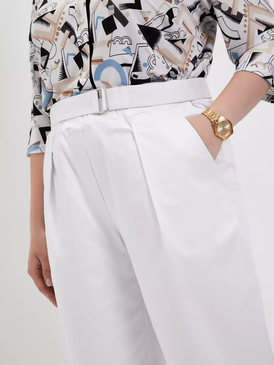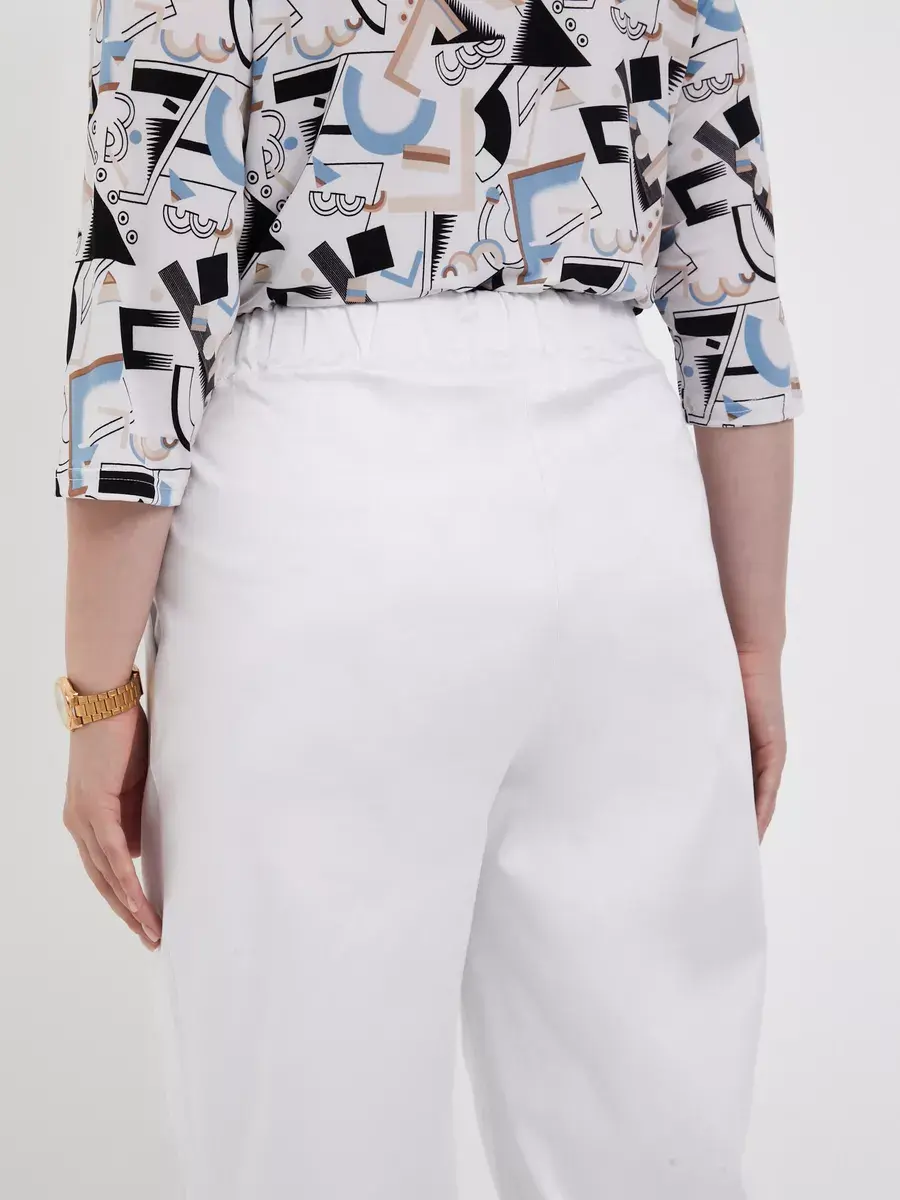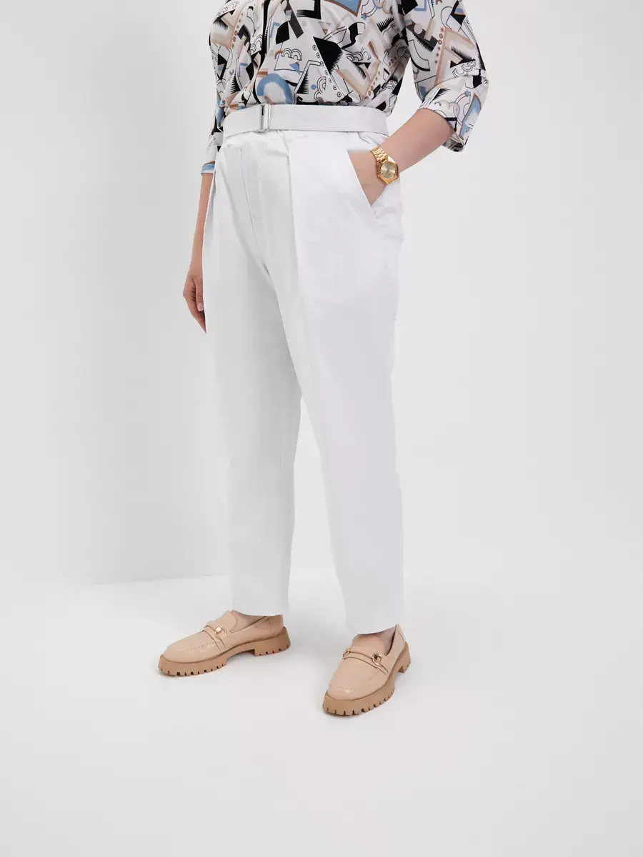 Повседневные женские брюки больших размеров бренда OLSI из хлопчатобумажной ткани с лоском. Брюки летние Олси однотонные, прямого силуэта. С функциональными карманами на передней части, застежка-обманка, и складками от пояса. Брюки без застежки, с круговой резинкой в поясе. Также пояс со свободным концом, застегивающийся на пряжку. Для заужения штанин снизу есть вытачки. Брюки длиной до щиколотки. Длина бокового шва/длина шагового шва/ширина брючины низ соответственно:р.48-101,4см/72,3см/21,5смр.50-101,7см/72,1см/22,0смр.52-101,9см/71,9см/22,5смр.54-102,3см/71,6см/23,0смр.56-102,5см/71,5см/23,5смр.58-102,9см/71,3см/24,0смр.60-103,2см/71,1см/24,5смр.62-103,5см/70,9см/25,0смр.64-103,8см/70,6см/25,5смр.66-104,3см/70,4см/26,0смр.68-104,5см/70,2см/26,5смр.70-104,8см/69,9см/27,0см