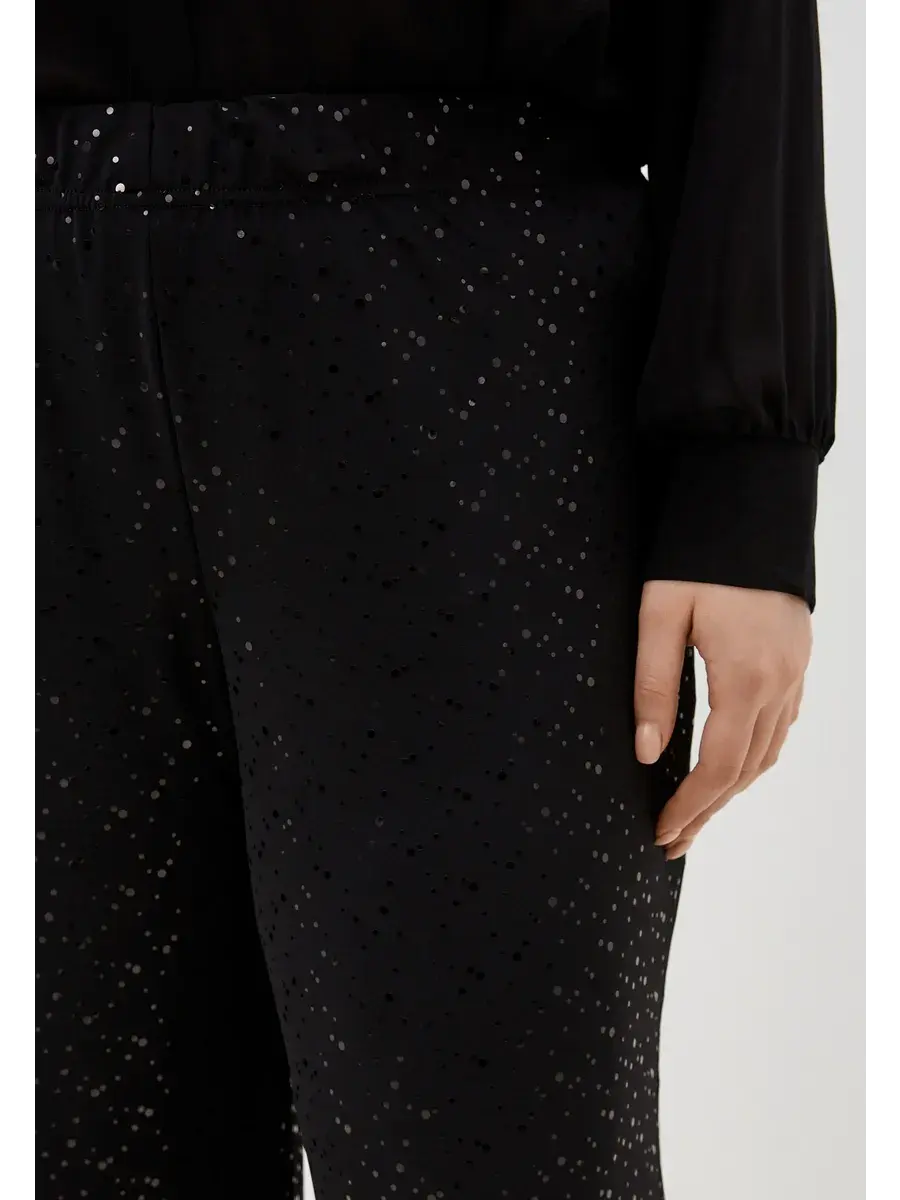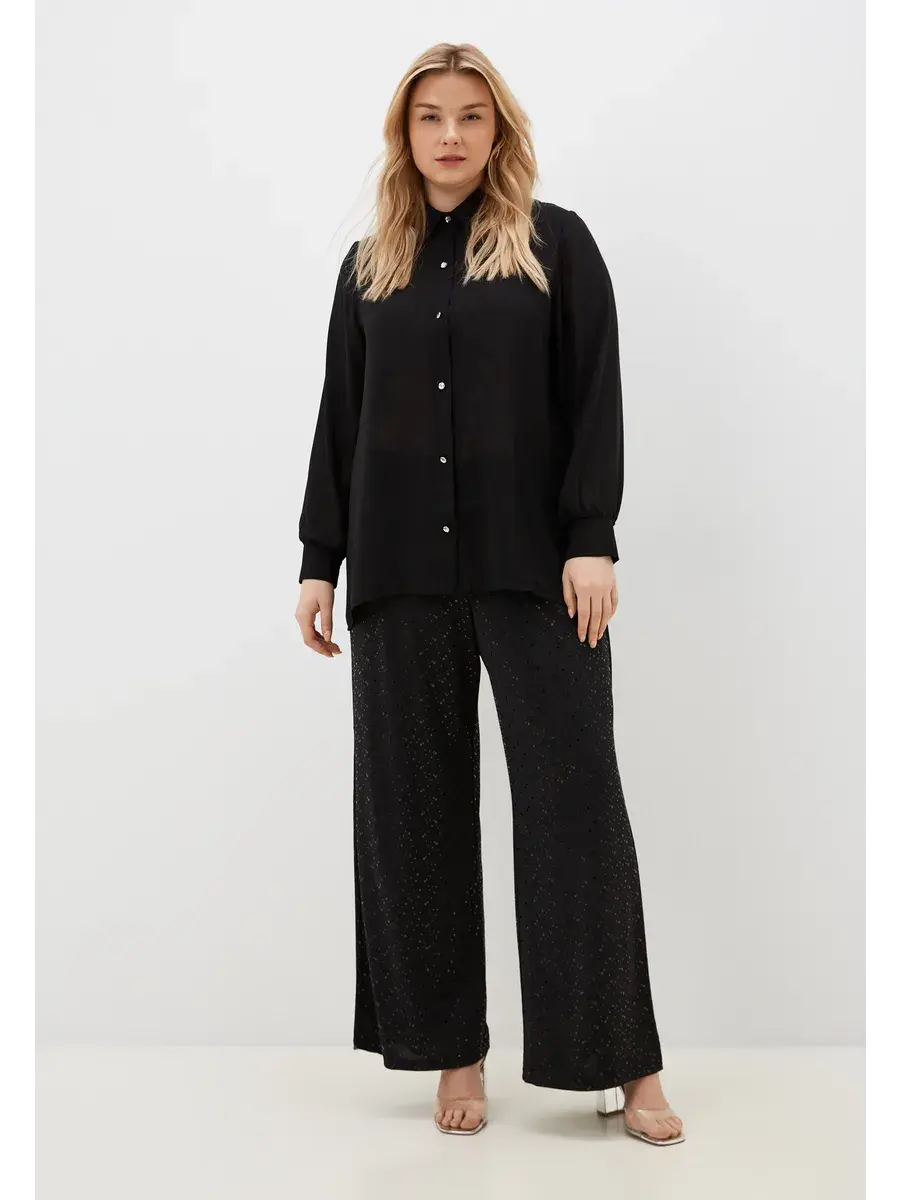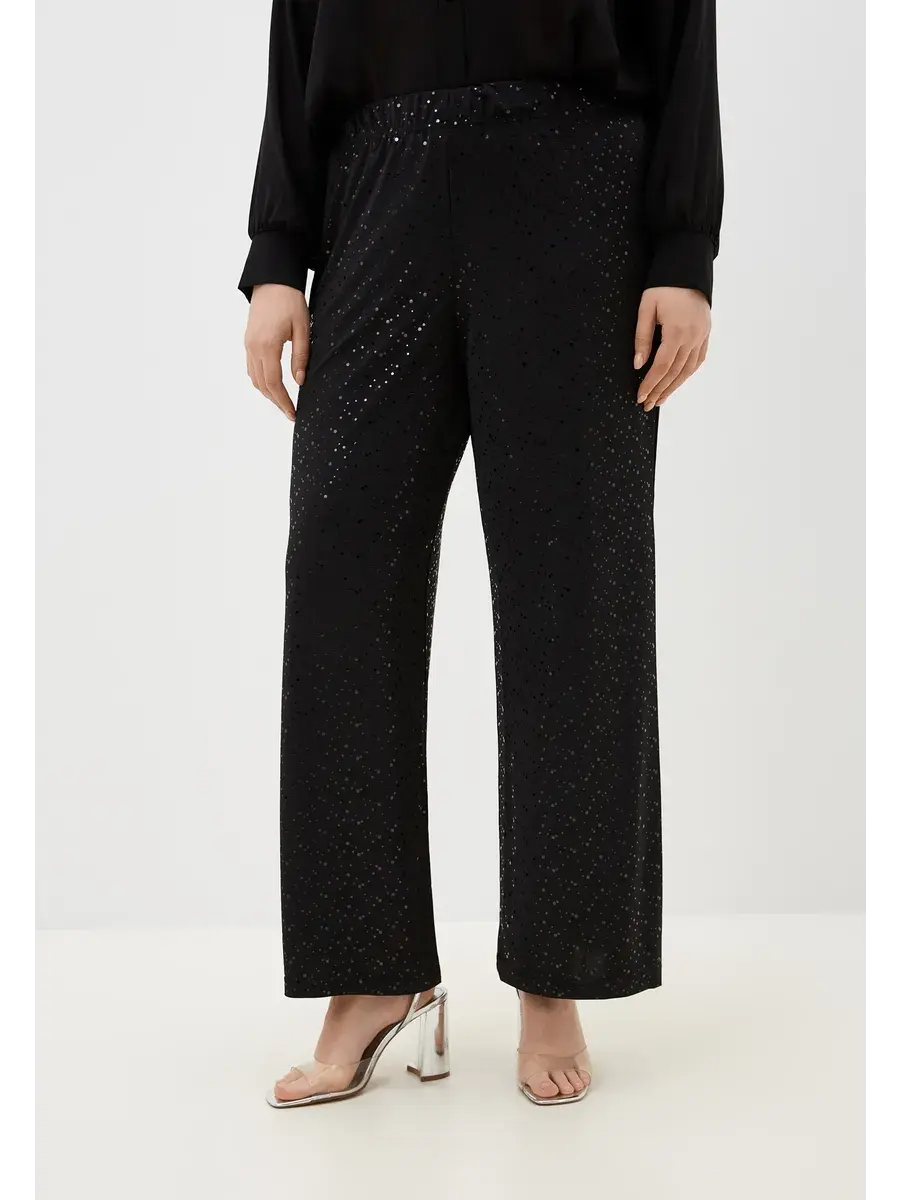 Стильные нарядные брюки больших размеров классической длины, из эластичного трикотажа по типу масло с пайетками. Модель широкого прямого кроя, свысокой посадкой, на широком поясе с резинкой. Брюки идеальны для создания ярких, запоминающихся образов.