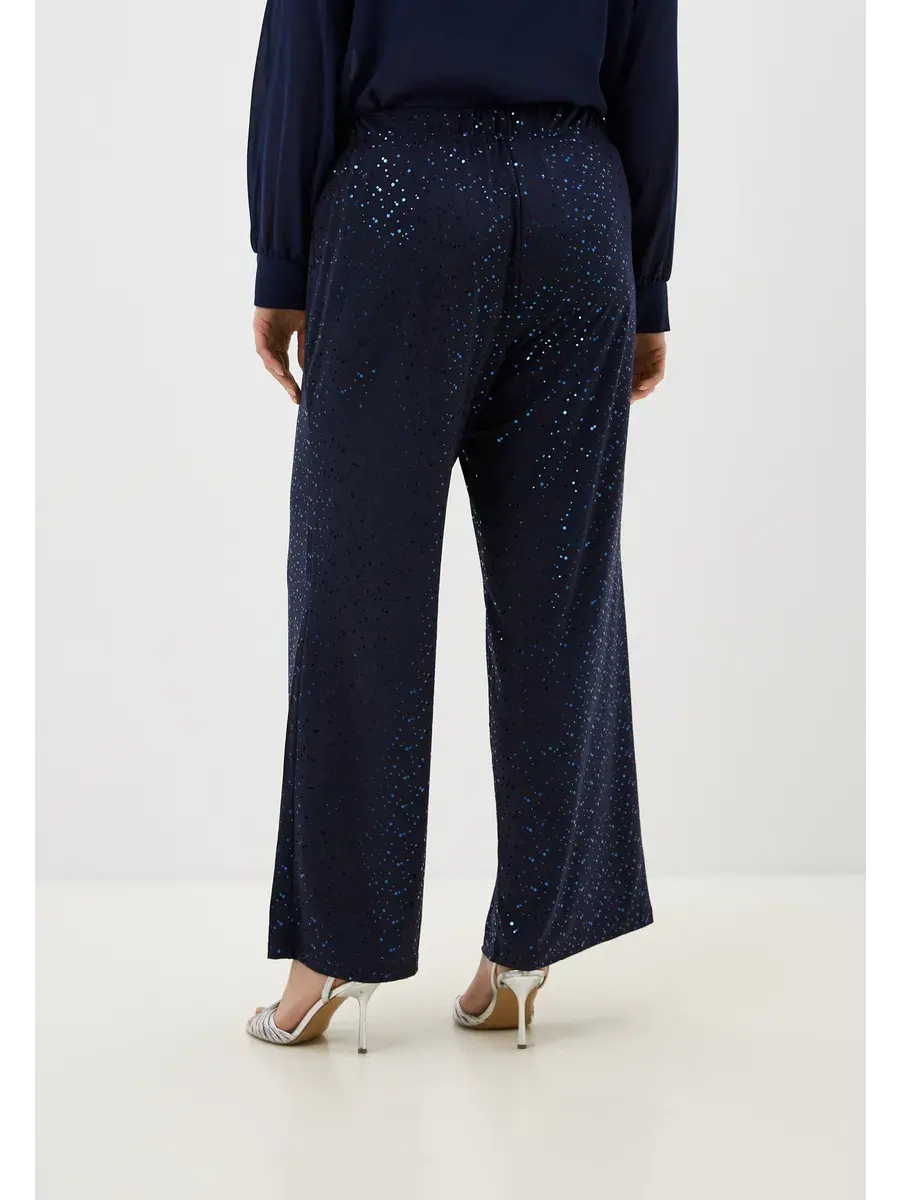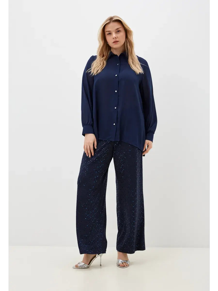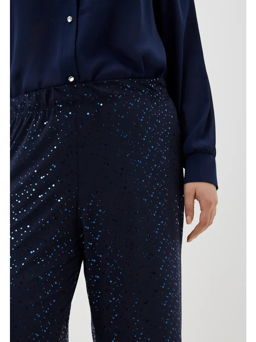 Стильные нарядные брюки больших размеров классической длины, из эластичного трикотажа по типу масло с пайетками. Модель широкого прямого кроя, свысокой посадкой, на широком поясе с резинкой. Брюки идеальны для создания ярких, запоминающихся образов.
