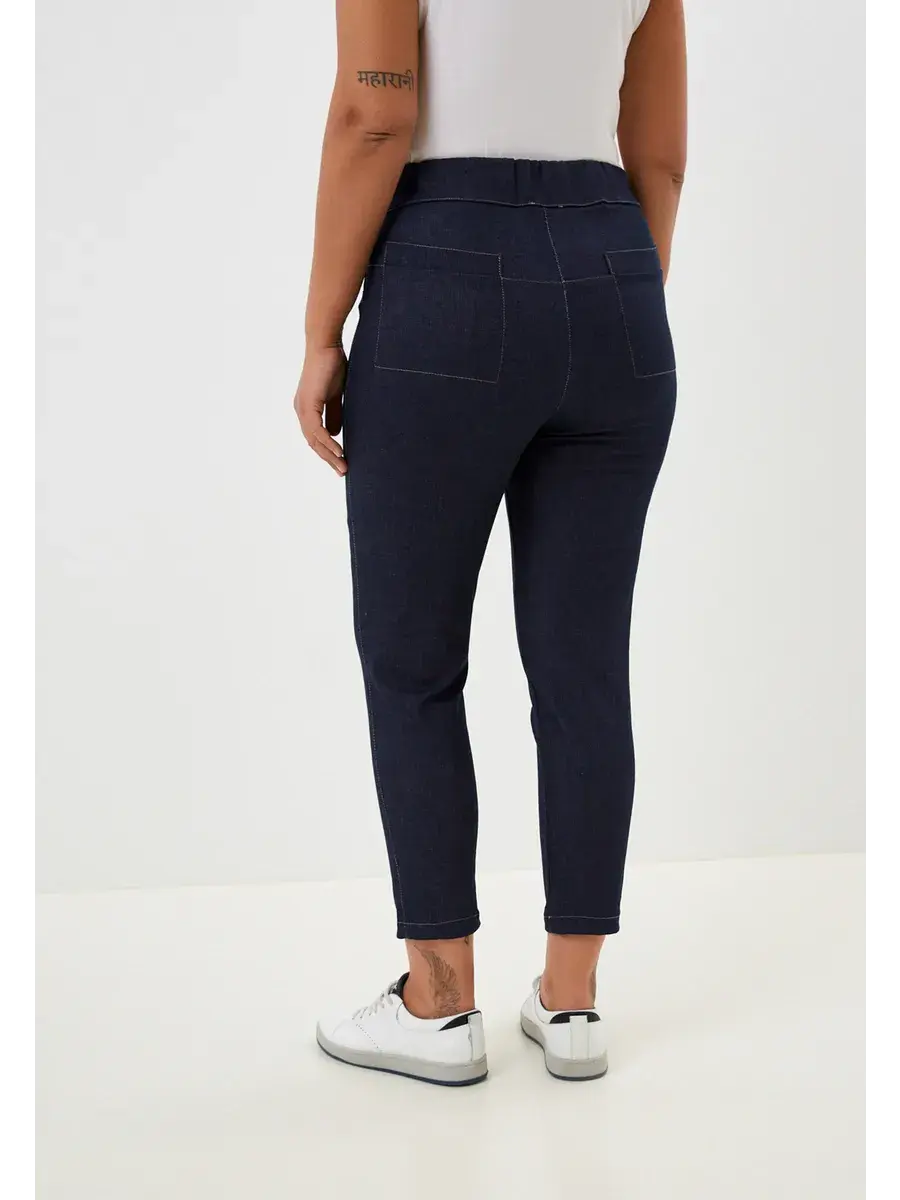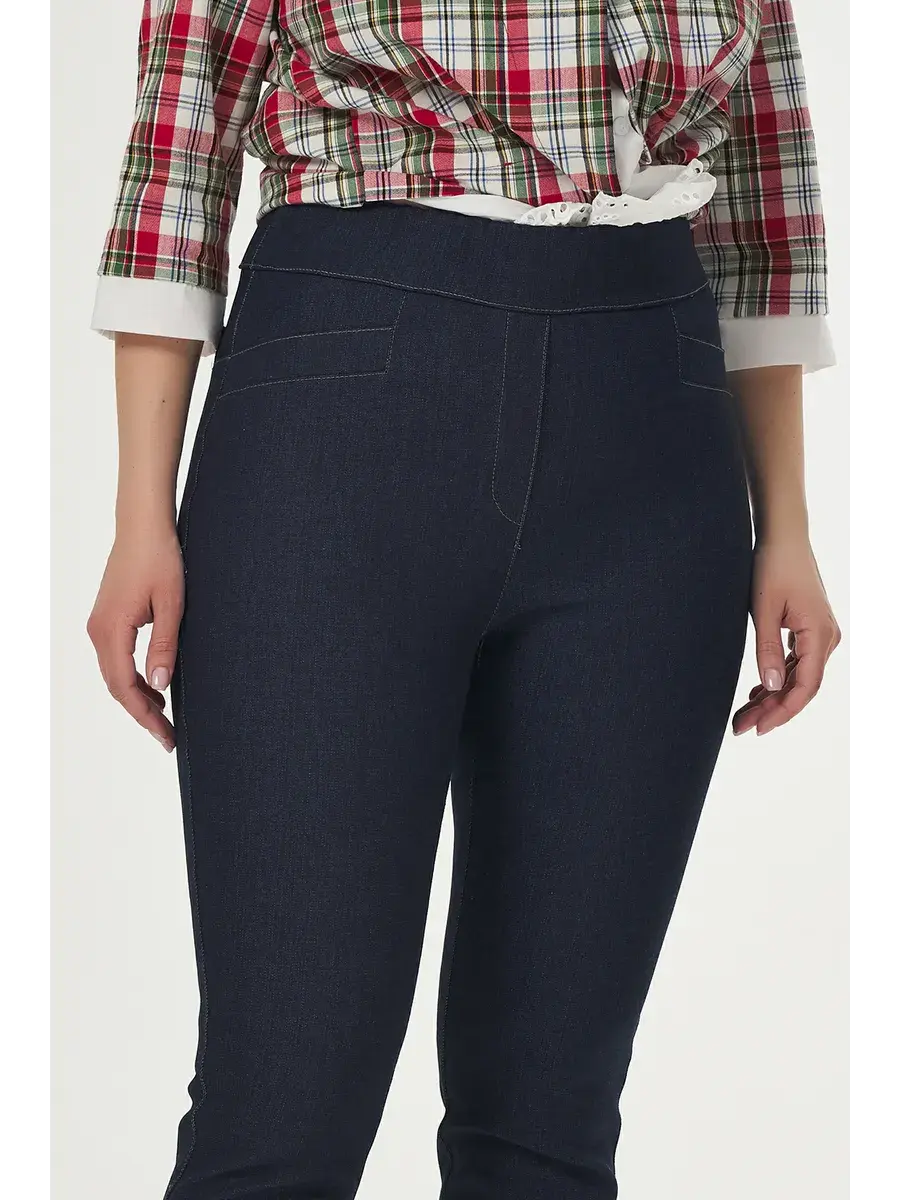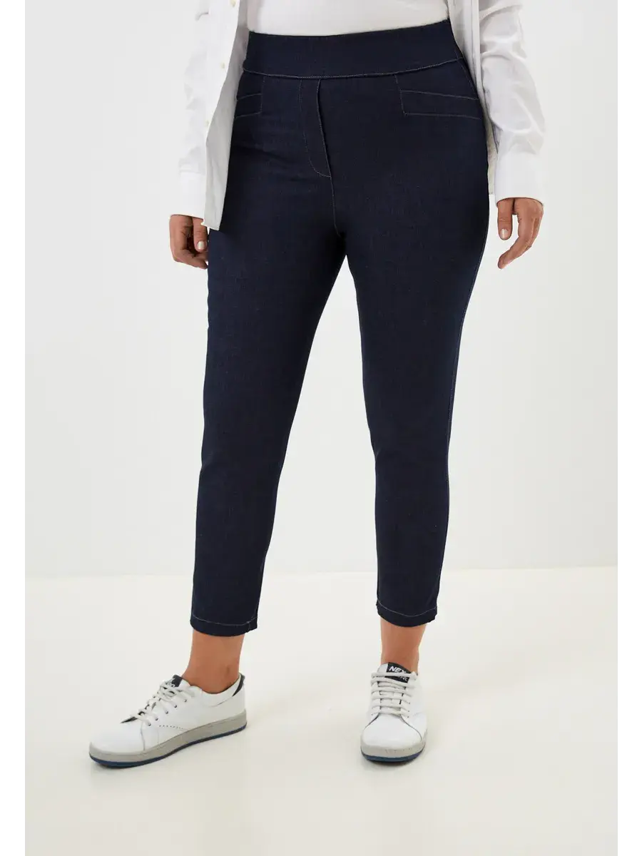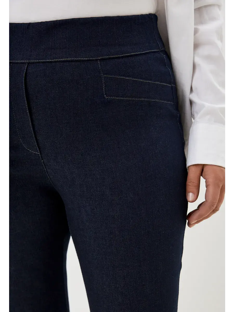 Укороченные зауженные брюки выполнены из джинсы с эластаном, пояс на резинке, перед ношением рекомендуем изделия из джинсы постирать, возможно окрашивание ткани.