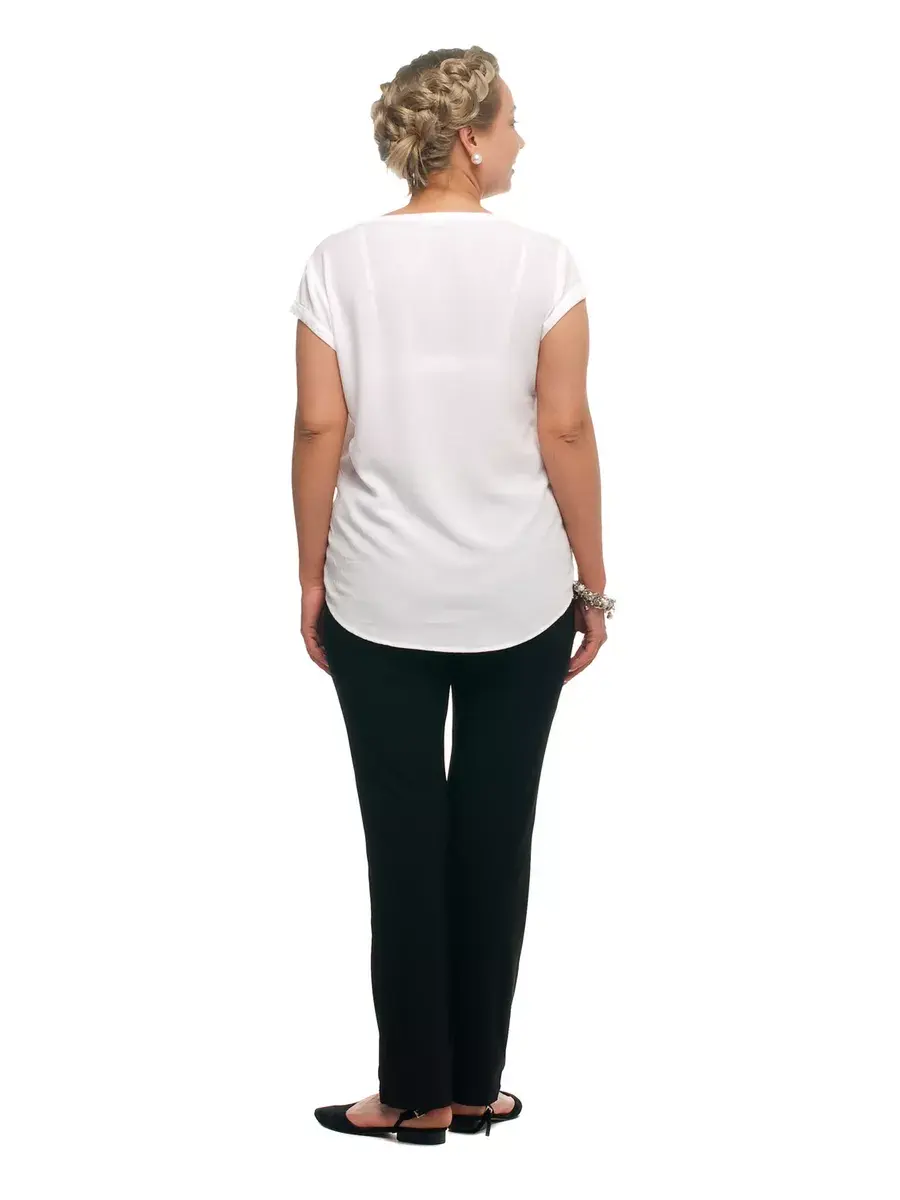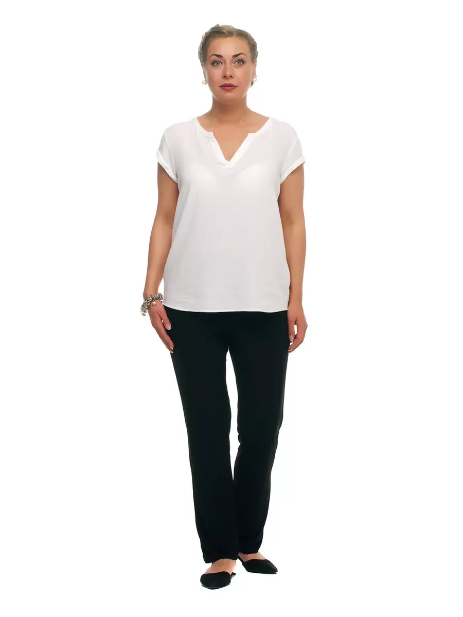 Женские брюки больших размеров от бренда OLSI выполнены из трикотажа-масло. Классическая длина, прикрывающая щиколотку. Пояс на резинке, без застежки. Без карманов. Небольшие боковые разрезы по низу брюк. Базовые брюки должны быть в каждом гардеробе.