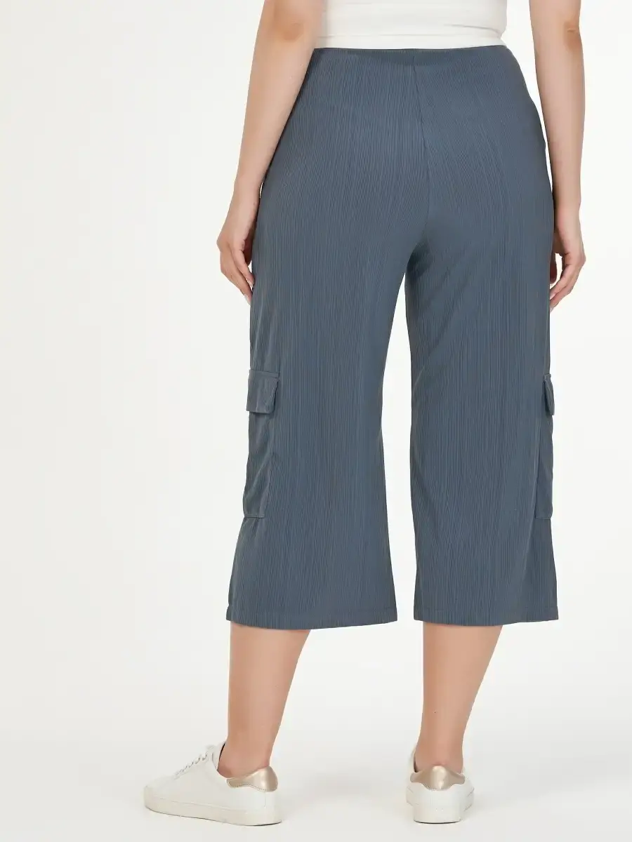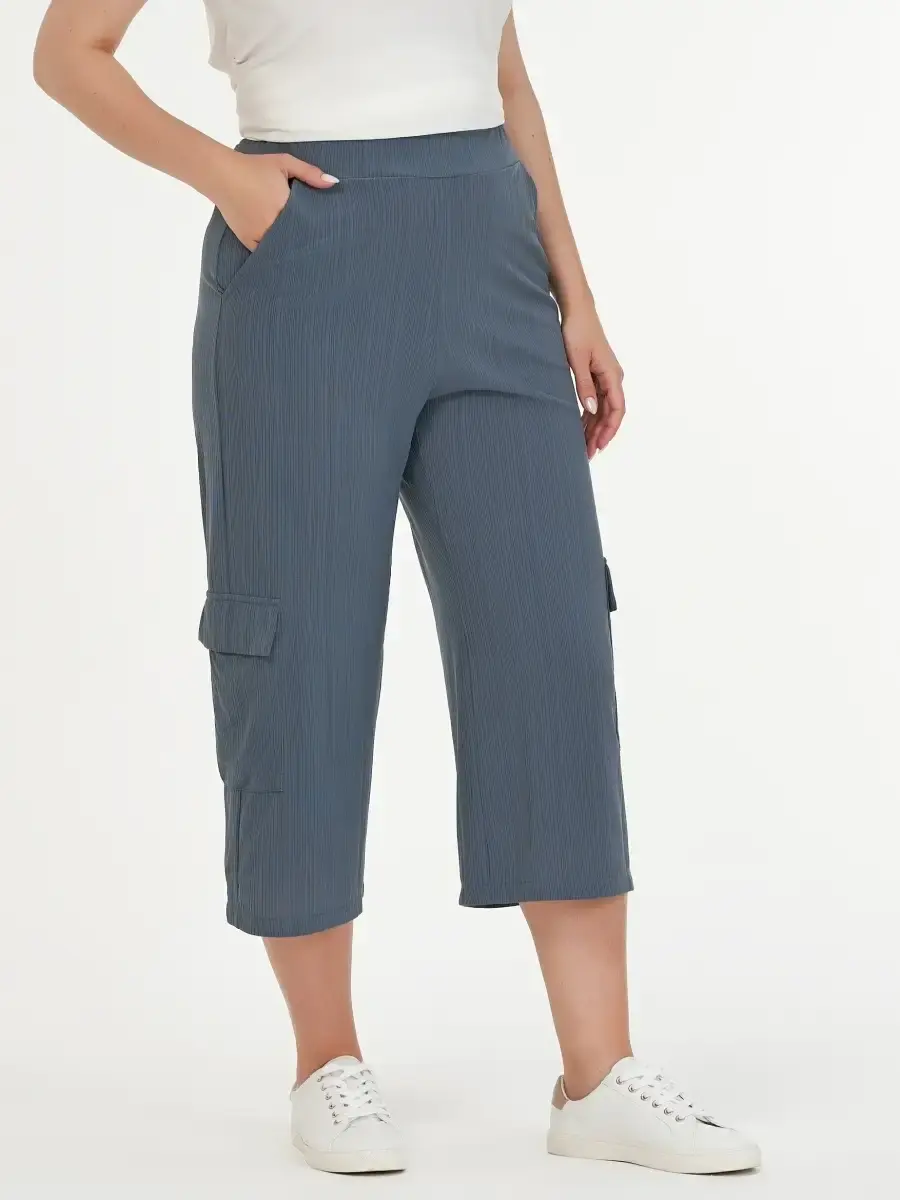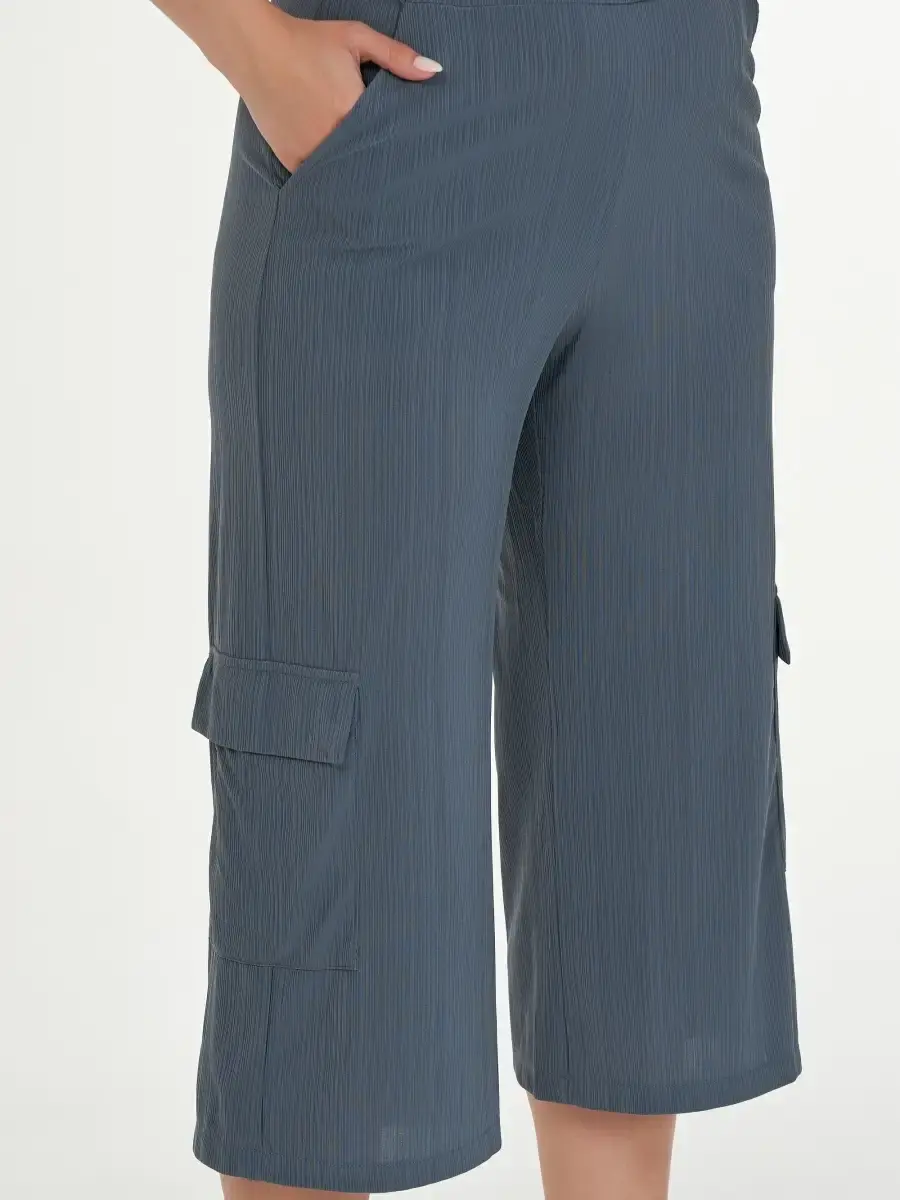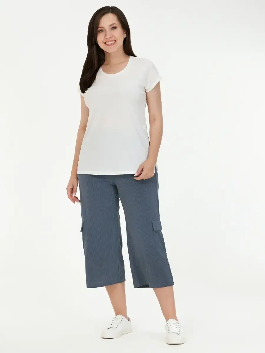 Укороченные широкие летние брюки, выполнены из трикотажного полотна по типу "гофре", пояс на резинке, с карманами, так же декорированы действующими карманами на штанинах. Длина бокового шва/длина шагового шва/ширина брючины низ соответственно:р.48-86,4см/55,0см/31,3смр.50-86,6см/54,8см/32,3смр.52-86,8см/54,6см/33,0смр.54-87,1см/54,4см/34,0смр.56-87,4см/54,2см/35,2смр.58-87,7см/53,9см/36,3смр.60-87,9см/53,7см/37,4смр.62-88,1см/53,4см/38,6смр.64-88,4см/53,1см/39,7смр.66-88,7см/53,0см/40,9смр.68-88,9см/52,8см/42,1смр.70-89,2см/52,5см/43,2см