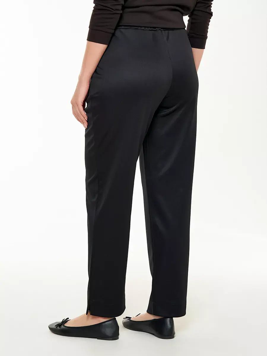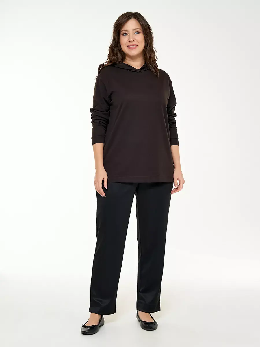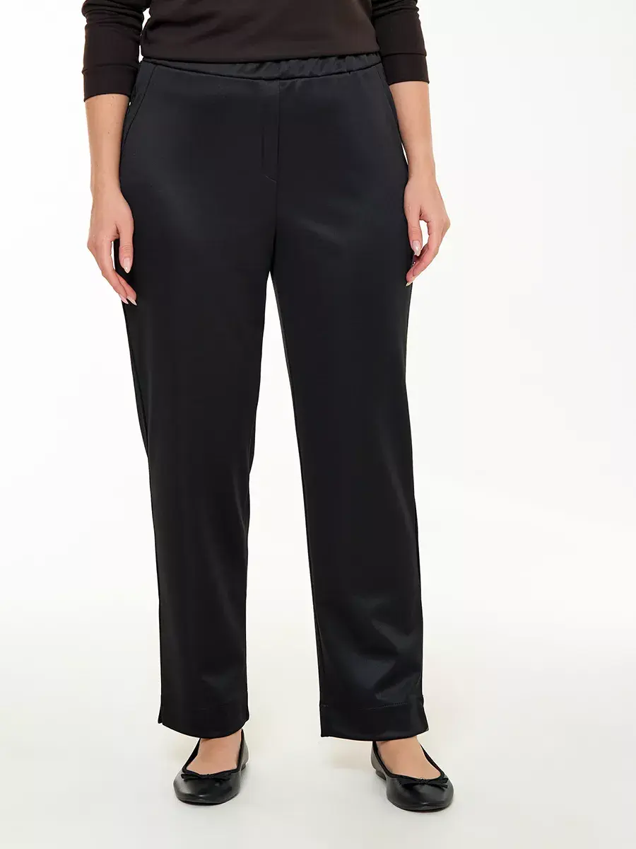 Повседневные женские брюки больших размеров от бренда OLSI из плотного мягкого трикотажного полотна прямого кроя.Черные брюки имеют высокую посадку, пояс на резинке, ткань с эффектом утепления, карманы и гульфик ложные.