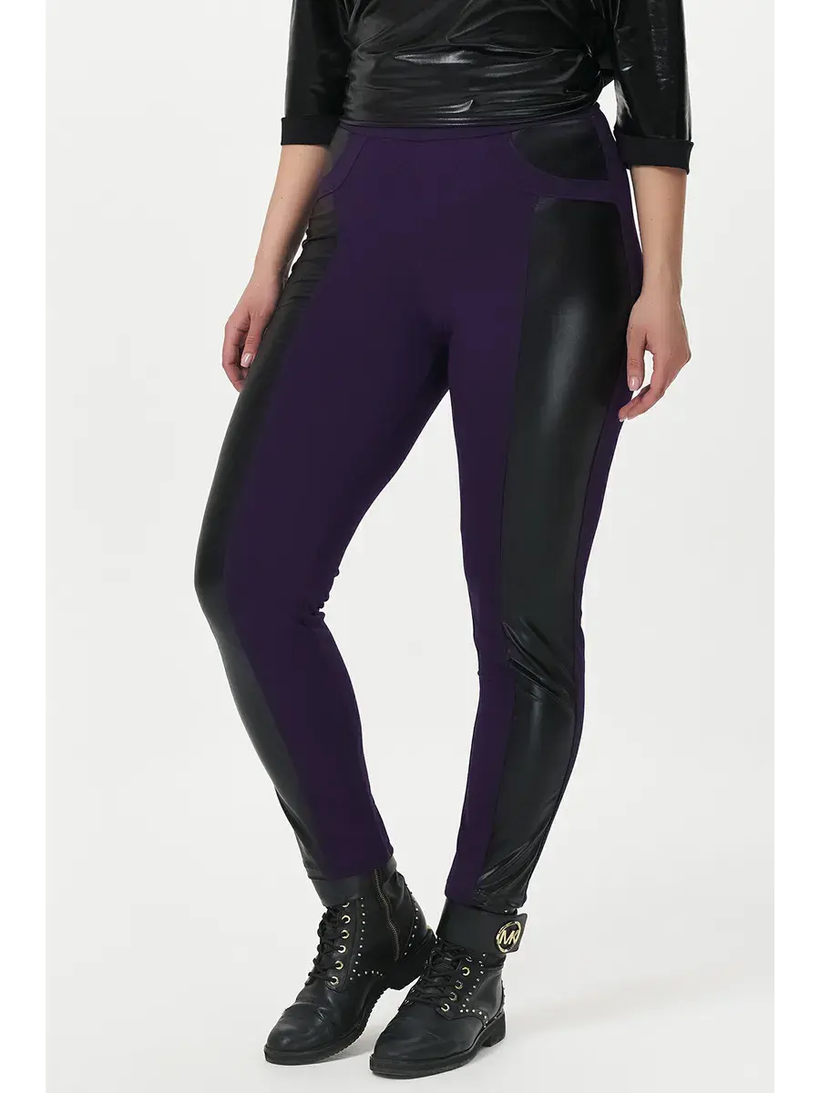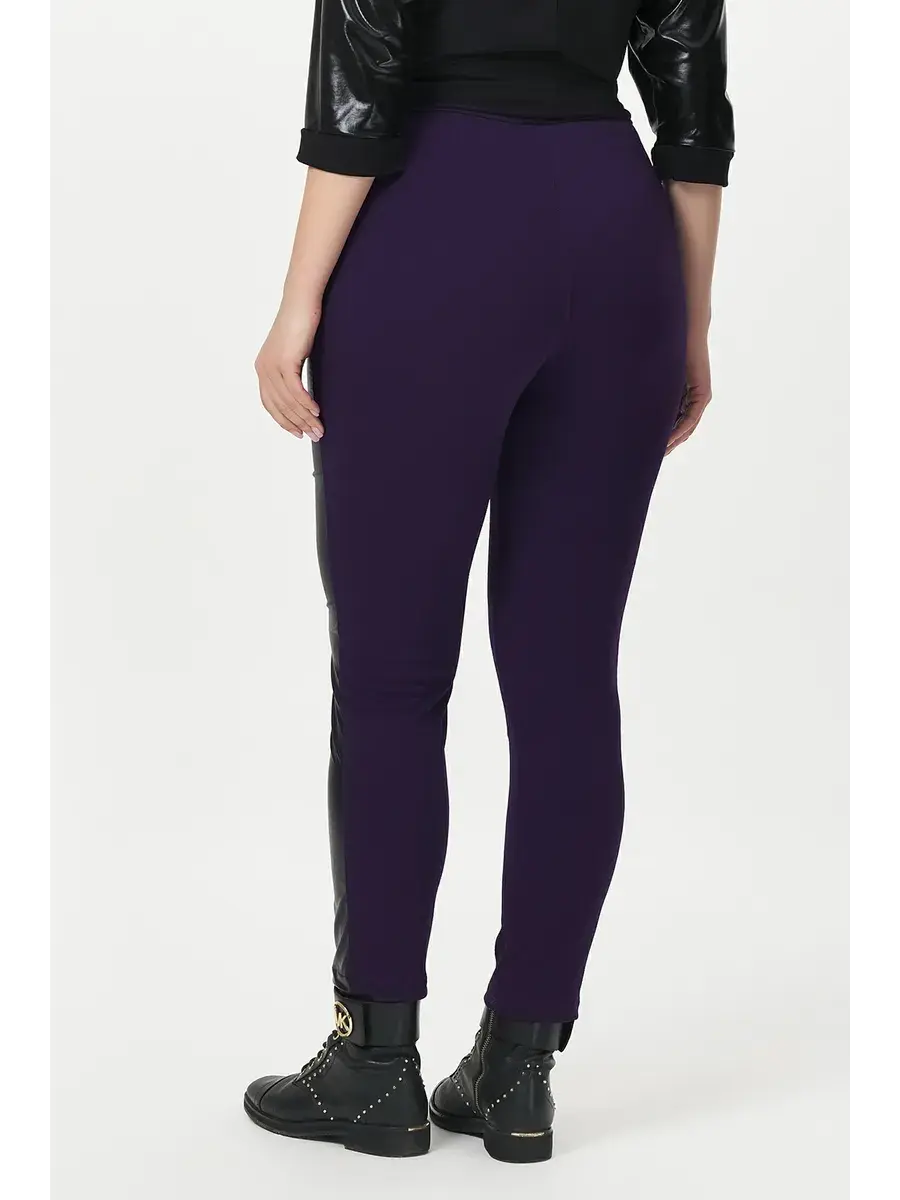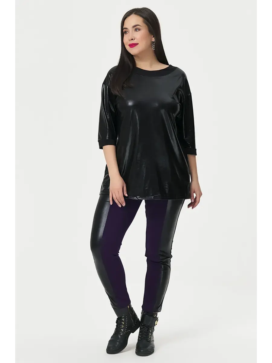 Женские повседневные брюки из трикотажной ткани и с вставками и ткани “лаке” с за ужением книзу. По переду брюк черные вставки по бокам и карманы (обманки) Задняя половинка брюк однотонная. Пояс обработан притачным поясом на резинке.