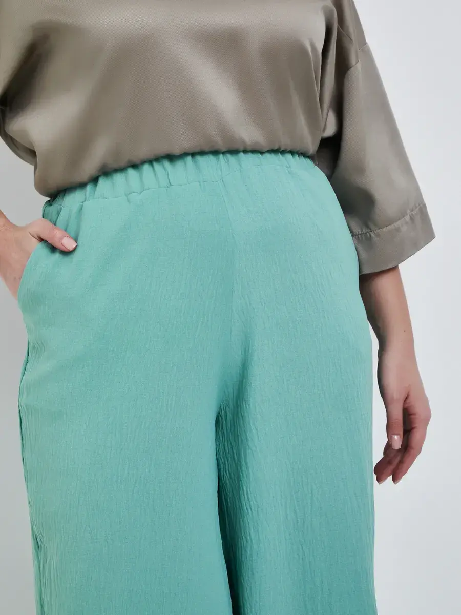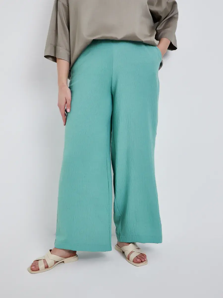 Широкие женские брюки палаццо больших размеров от бренда OLSI, выполнены из ультрамодной в этом сезоне ткани Сингапур! Материал струящийся, с жатым эффектом, не требует глажки.