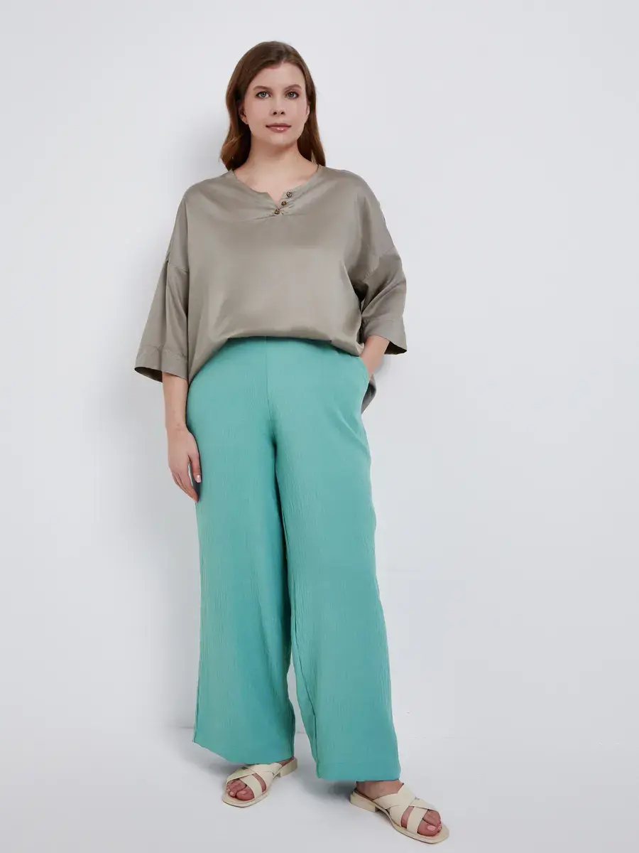Модель прямого силуэта, с функциональными карманами, притачной пояс на резинке. Это универсальный вариант брюк, который можно носить круглый год. Они легко адаптируются к различным стилям, идеально подходя как для повседневной носки, так и для создания оригинальных нарядов для особых мероприятий. Эти штаны больших размеров также подойдут для работы, офиса, ресторана, театра или торжественного мероприятия в сочетании с нарядным верхом. Модель брюк палаццо с круговой резинкой по талии, без застежки. Широкие струящиеся брюки в комфортном свободном стиле незаменимы в жаркую погоду и путешествии. Идеальный вариант в офис, на праздник, на прогулку.