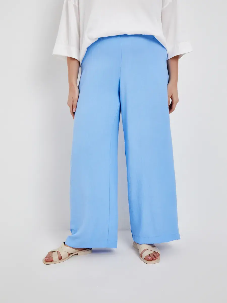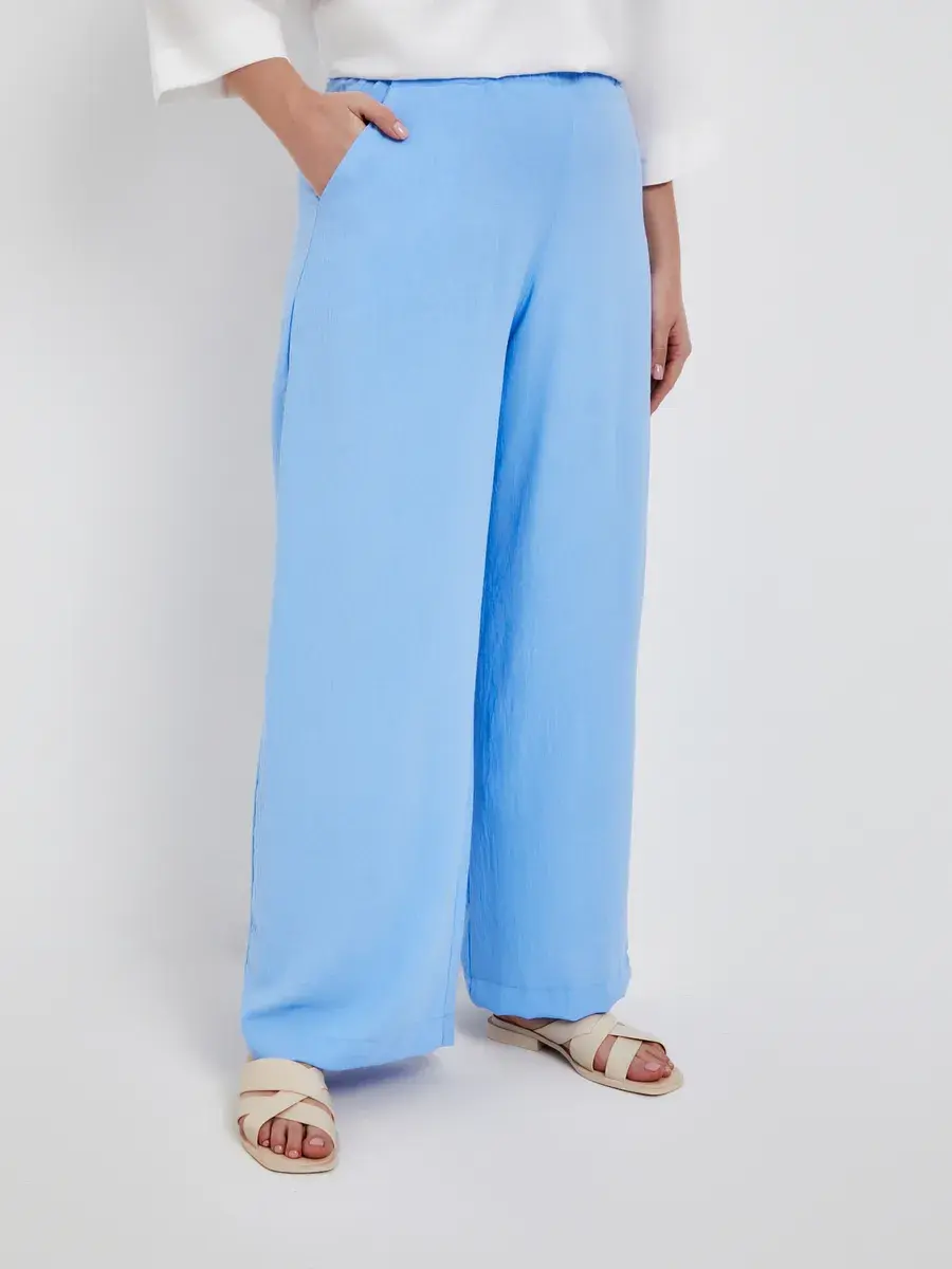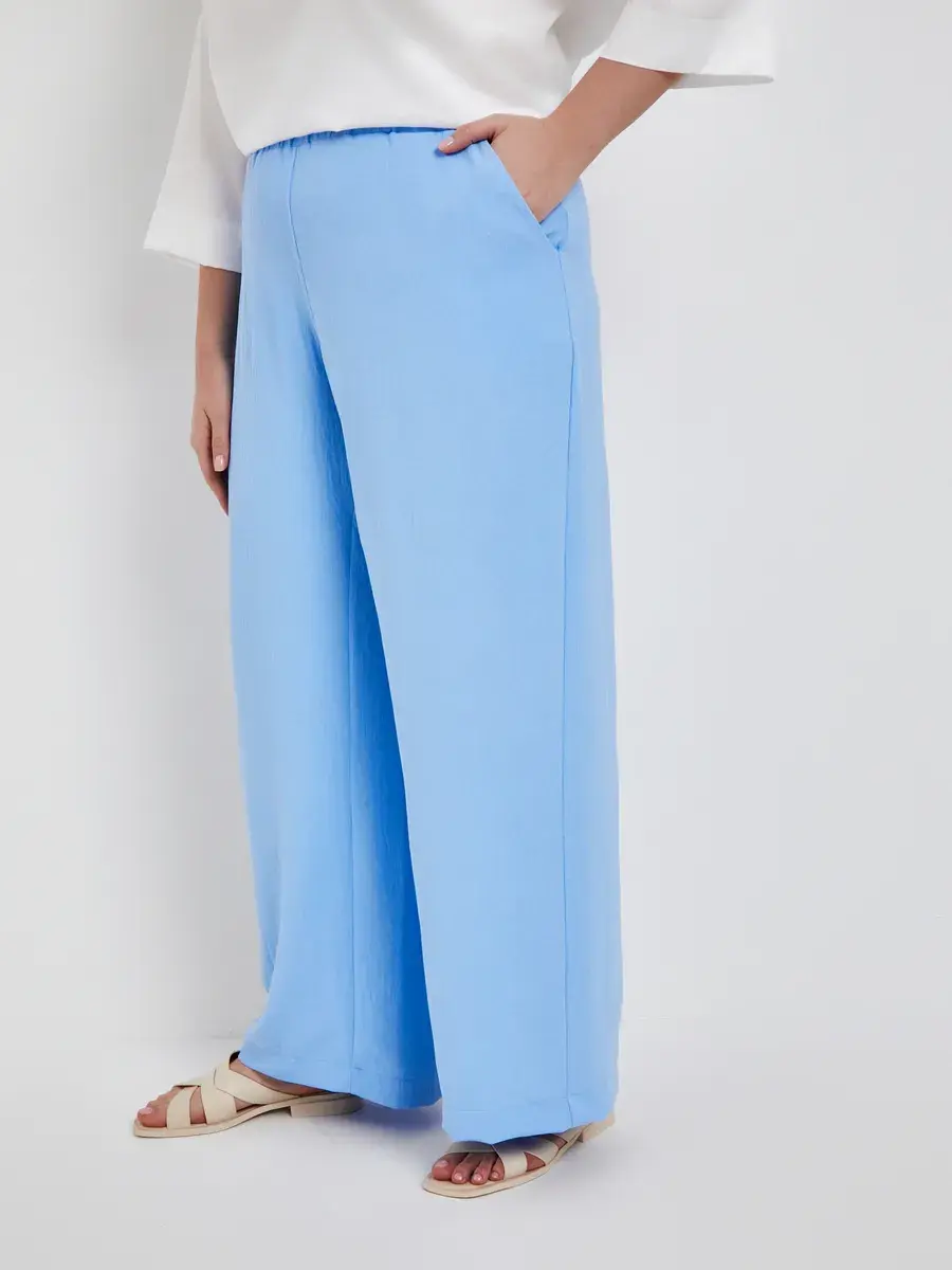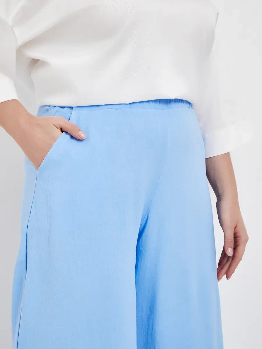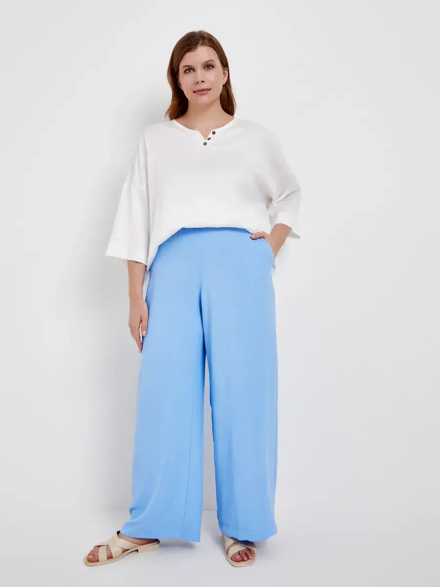 Модель прямого силуэта, с функциональными карманами, притачной пояс на резинке. Это универсальный вариант брюк, который можно носить круглый год. Они легко адаптируются к различным стилям, идеально подходя как для повседневной носки, так и для создания оригинальных нарядов для особых мероприятий. Эти штаны больших размеров также подойдут для работы, офиса, ресторана, театра или торжественного мероприятия в сочетании с нарядным верхом. Модель брюк палаццо с круговой резинкой по талии, без застежки. Широкие струящиеся брюки в комфортном свободном стиле незаменимы в жаркую погоду и путешествии. Идеальный вариант в офис, на праздник, на прогулку.