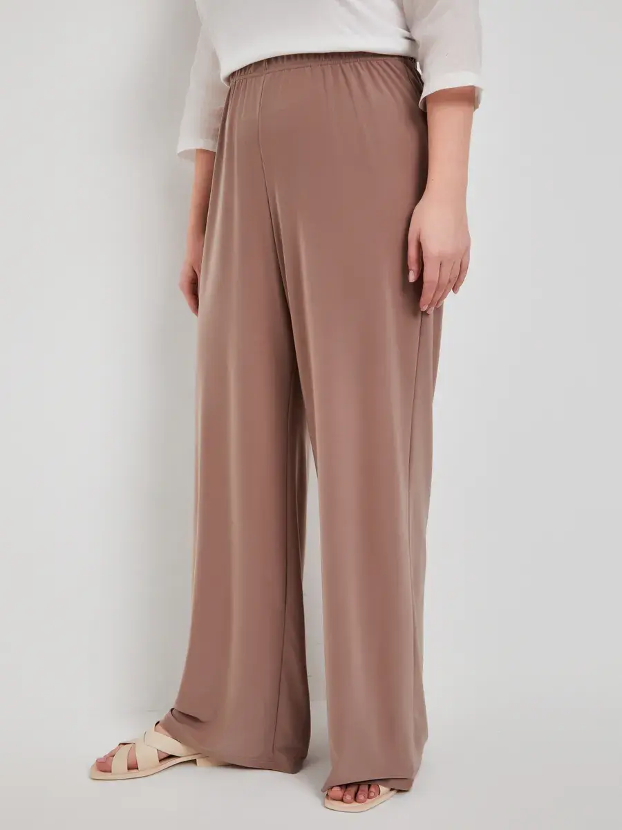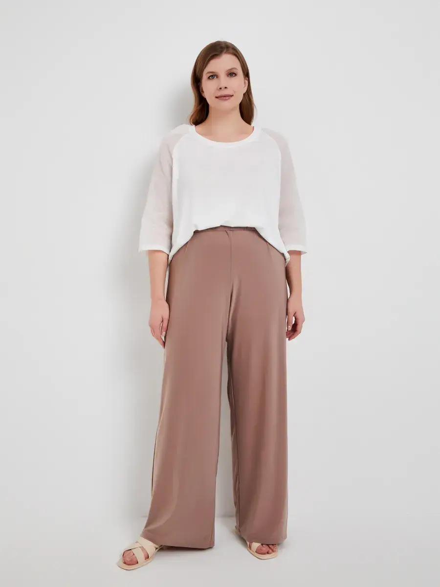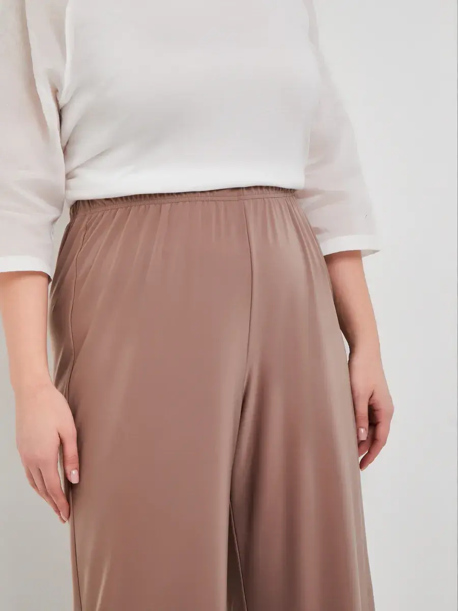 Легкие трикотажные брюки от бренда OLSI из шелковистого материала. Брюки свободного кроя из ткани трикотаж масло не мнутся и быстро сохнут. Это универсальный вариант брюк, который можно носить круглый год. На праздник их можно сочетать с нарядной блузой и туфлями, а для более спортивного образа - с футболкой и кедами. Они подойдут и для прогулок, и для поездок, так как не помнутся в чемодане. Брюки также подойдут для работы, офиса, ресторана, театра или торжественного мероприятия в сочетании с нарядным верхом. Модель брюк палаццо с круговой резинкой по талии, без застежки. Широкие струящиеся брюки в комфортном свободном стиле незаменимы в жаркую погоду. Идеальный вариант в офис, на праздник, на прогулку.