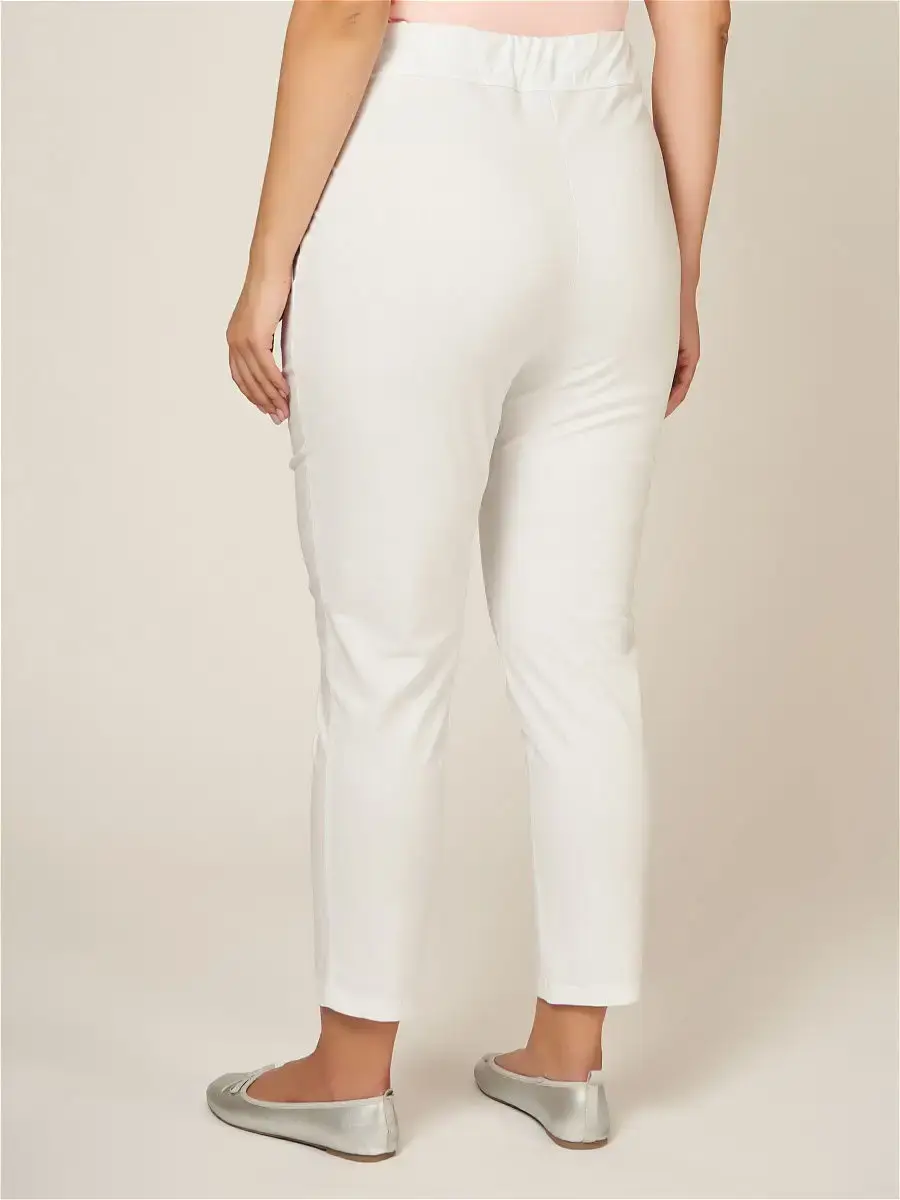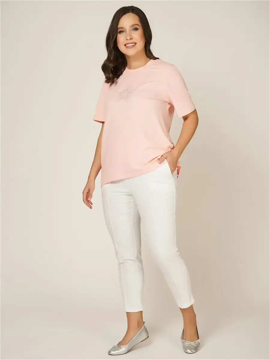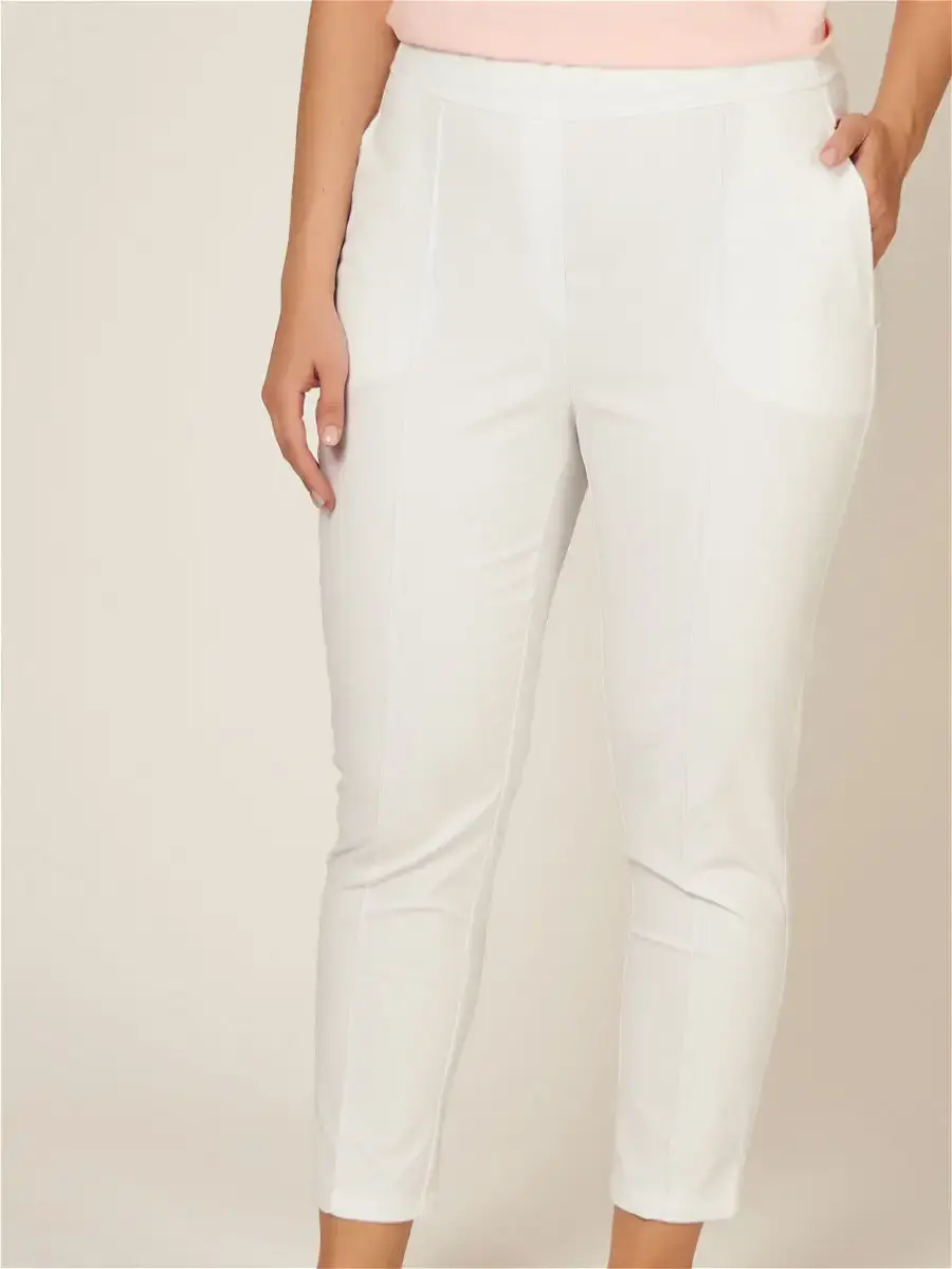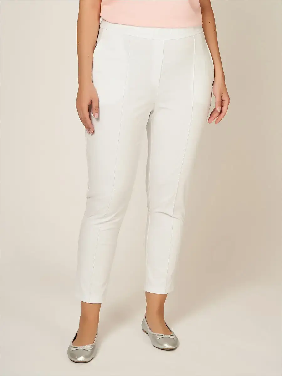 Стильные белые брюки из тонкой хлопковой ткани, длиной 7/8; узкие по всей длине, со средней комфортной посадкой. Модель с классическими прошитыми стрелками, на поясе-резинке с имитацией гульфика, врезными карманами спереди. Небольшое количестве эластана в составе ткани делает брюки удобными в уходе и в носке. Модель утягивает силуэт, благодаря строгому продуманному крою, белый цвет не добавляет лишний объем. Брюки уместны в офисе, на прогулке, в отпуске у моря. Длина бокового шва/длина шагового шва/ширина брючины низ соответственно:р.48-100,6см/67,9см/15,0смр.50-100,8см/67,7см/15,6смр.52-101,1см/67,5см/16,2смр.54-101,5см/67,3см/16,8смр.56-101,9см/67,1см/17,4смр.58-102,1см/66,8см/18,0смр.60-102,5см/66,6см/18,6смр.62-102,7см/66,3см/19,2смр.64-103,1см/66,1см/19,8смр.66-103,5см/65,9см/20,4смр.68-103,8см/65,6см/21,0смр.70-104,1см/65,3см/21,6см