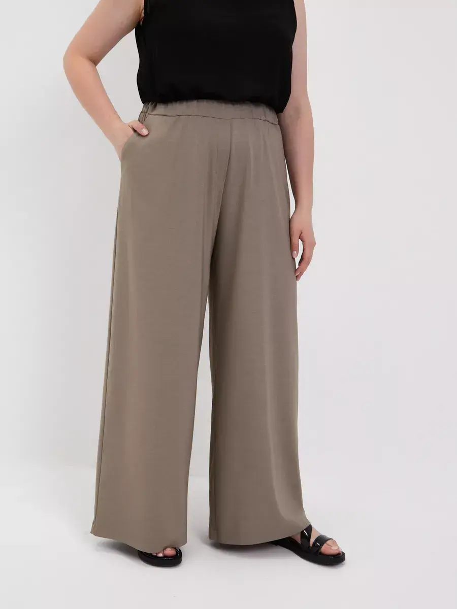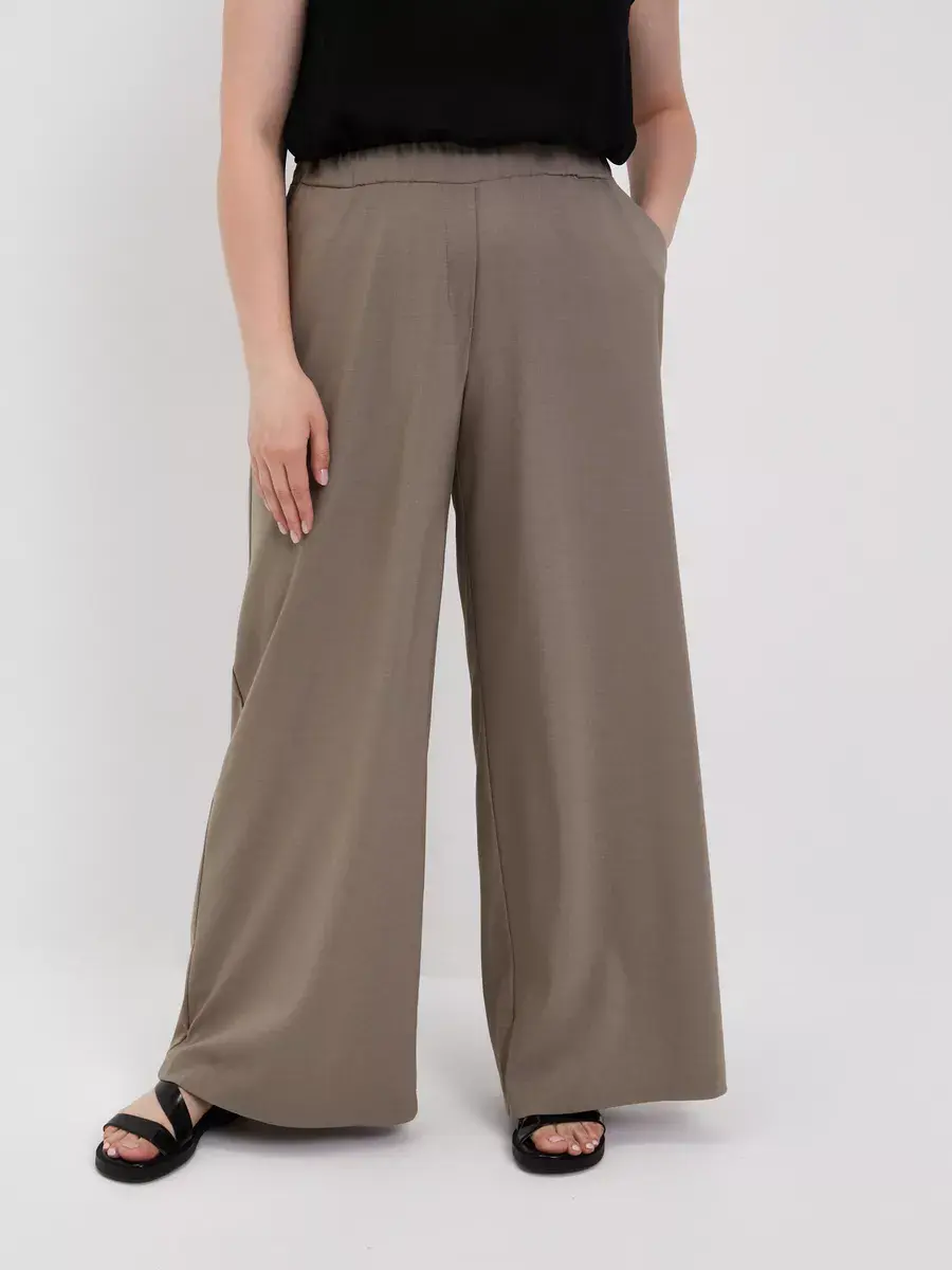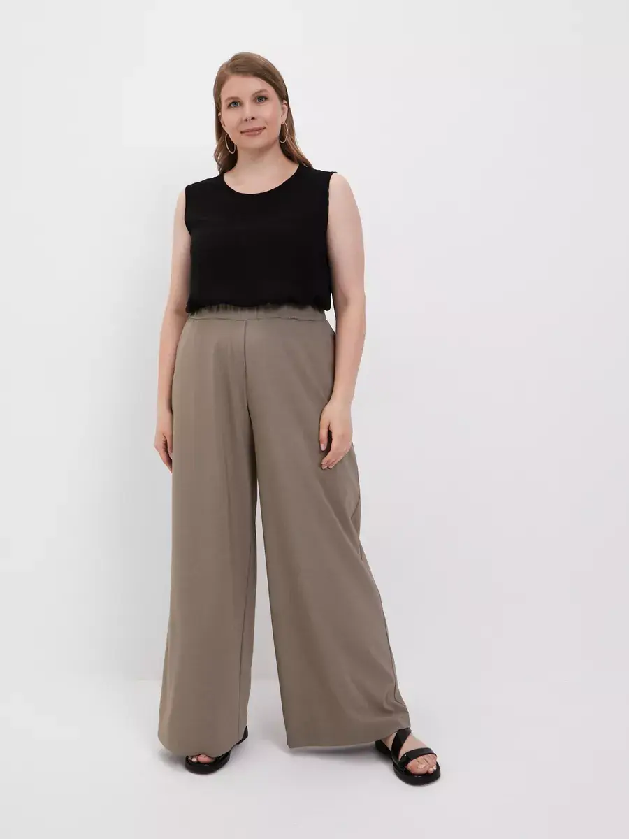 Женские брюки палаццо больших размеров от бренда OLSI, однотонные из текстильного тонкого полотна, прямого силуэта. Стильные длинные юбка-брюки высокой посадки с поясом на резинке. Оригинальная модель идеально сидит на фигуре любого типа благодаря завышенной линии талии визуально стройнят ноги, делают их длинными. Широкие штанины брюк создают ощущение, что на вас длинная широкая юбка. Женские брюки Олси представлены в 10 размерах от 52 до 70. Удобные лекала. Большой популярностью пользуются эти брюки в бежевом цвете. Отлично подходят для офиса, как деловая одежда для женщин а также для вечеринок. И модель в целом стройнит свою обладательницу. Брюки хорошо подойдут не только стройным девушкам, но в том числе обладательницам полных ног.