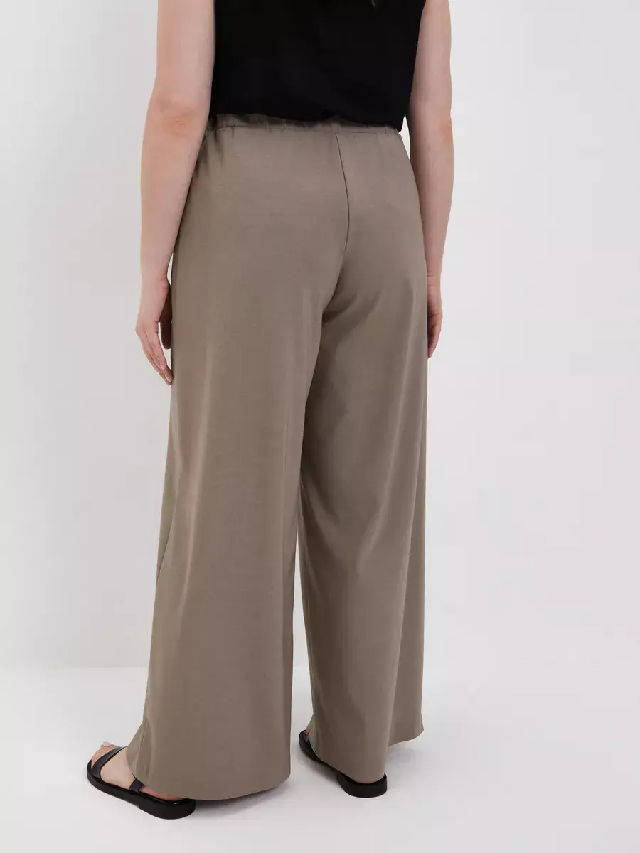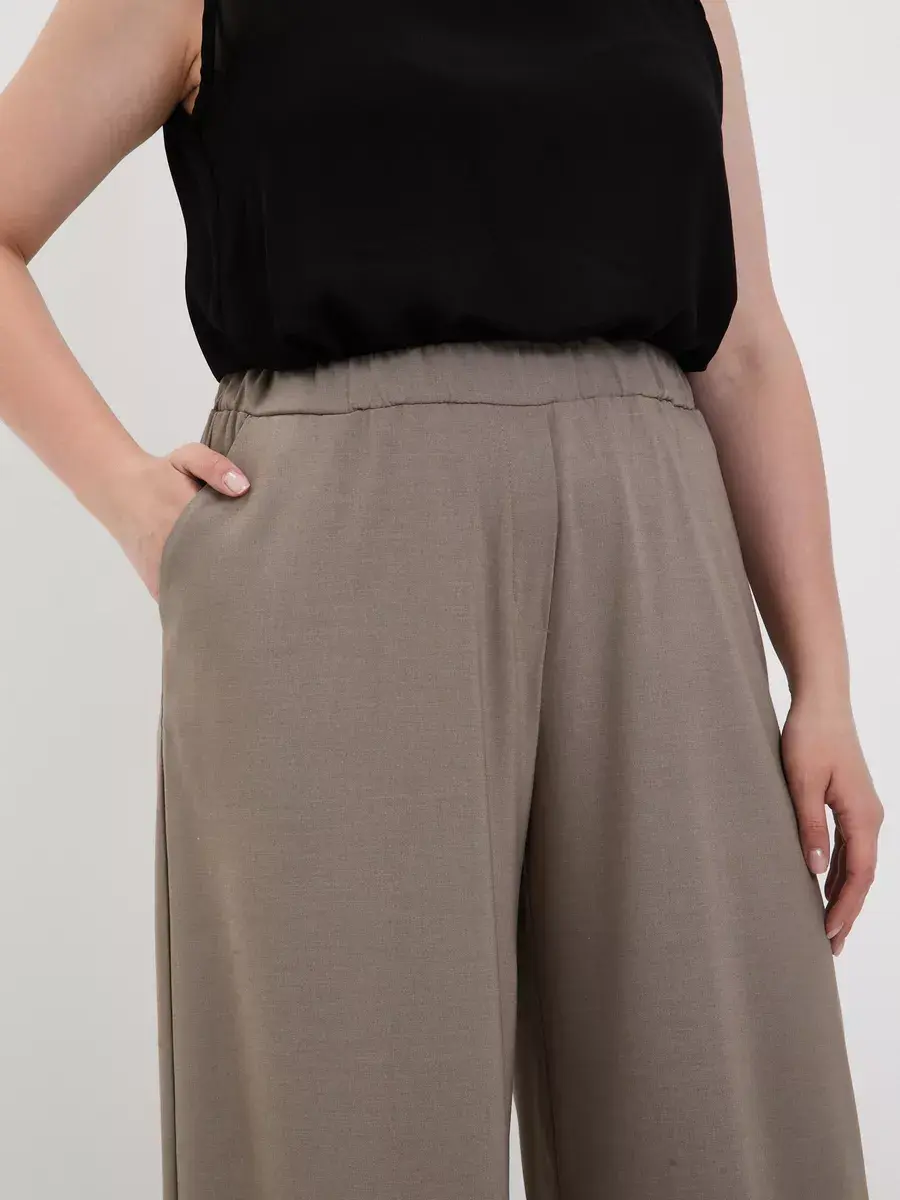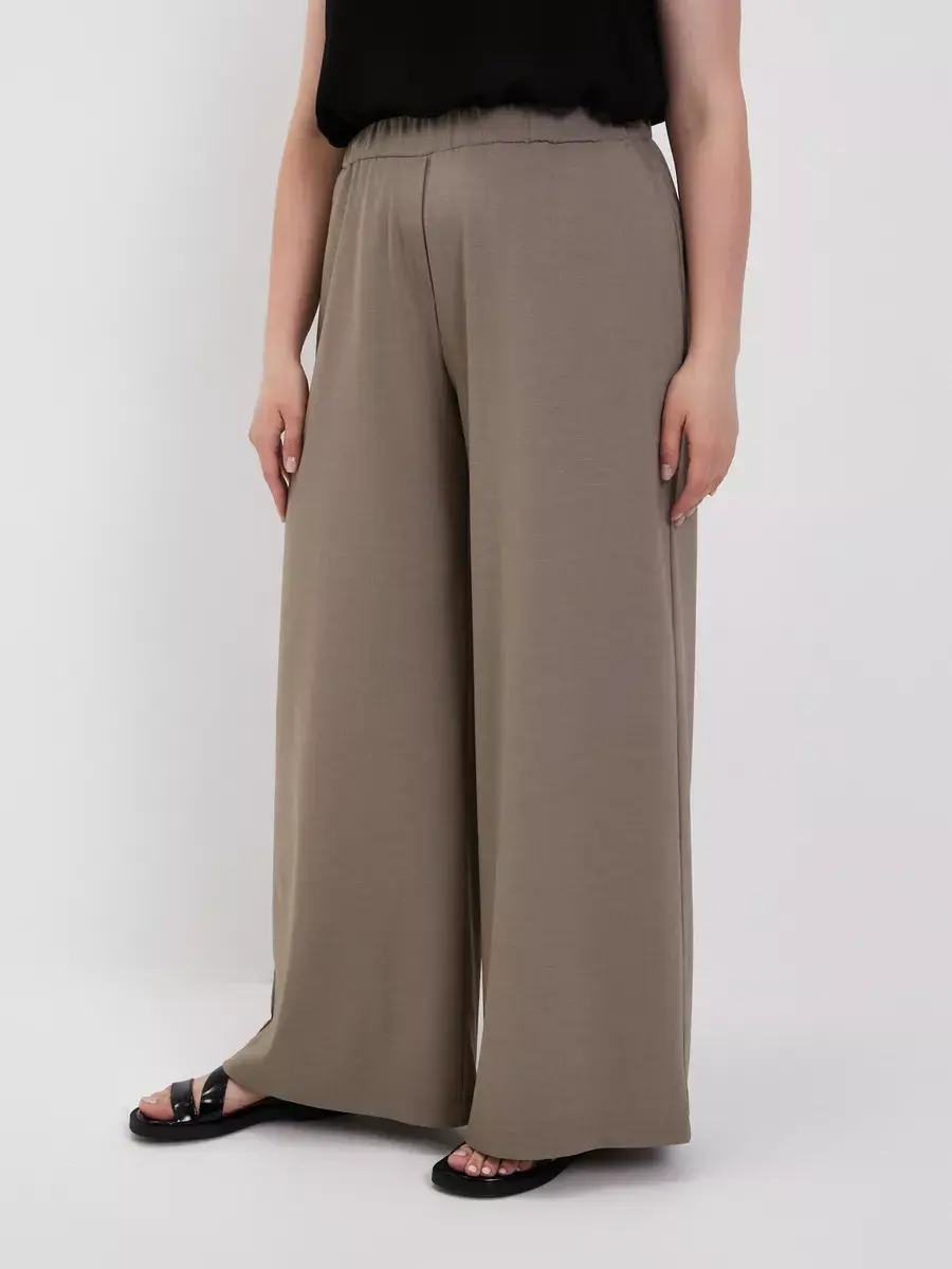 Женские брюки палаццо больших размеров от бренда OLSI, однотонные из текстильного тонкого полотна, прямого силуэта. Стильные длинные юбка-брюки высокой посадки с поясом на резинке. Оригинальная модель идеально сидит на фигуре любого типа благодаря завышенной линии талии визуально стройнят ноги, делают их длинными. Широкие штанины брюк создают ощущение, что на вас длинная широкая юбка. Женские брюки Олси представлены в 10 размерах от 52 до 70. Удобные лекала. Большой популярностью пользуются эти брюки в бежевом цвете. Отлично подходят для офиса, как деловая одежда для женщин а также для вечеринок. И модель в целом стройнит свою обладательницу. Брюки хорошо подойдут не только стройным девушкам, но в том числе обладательницам полных ног.