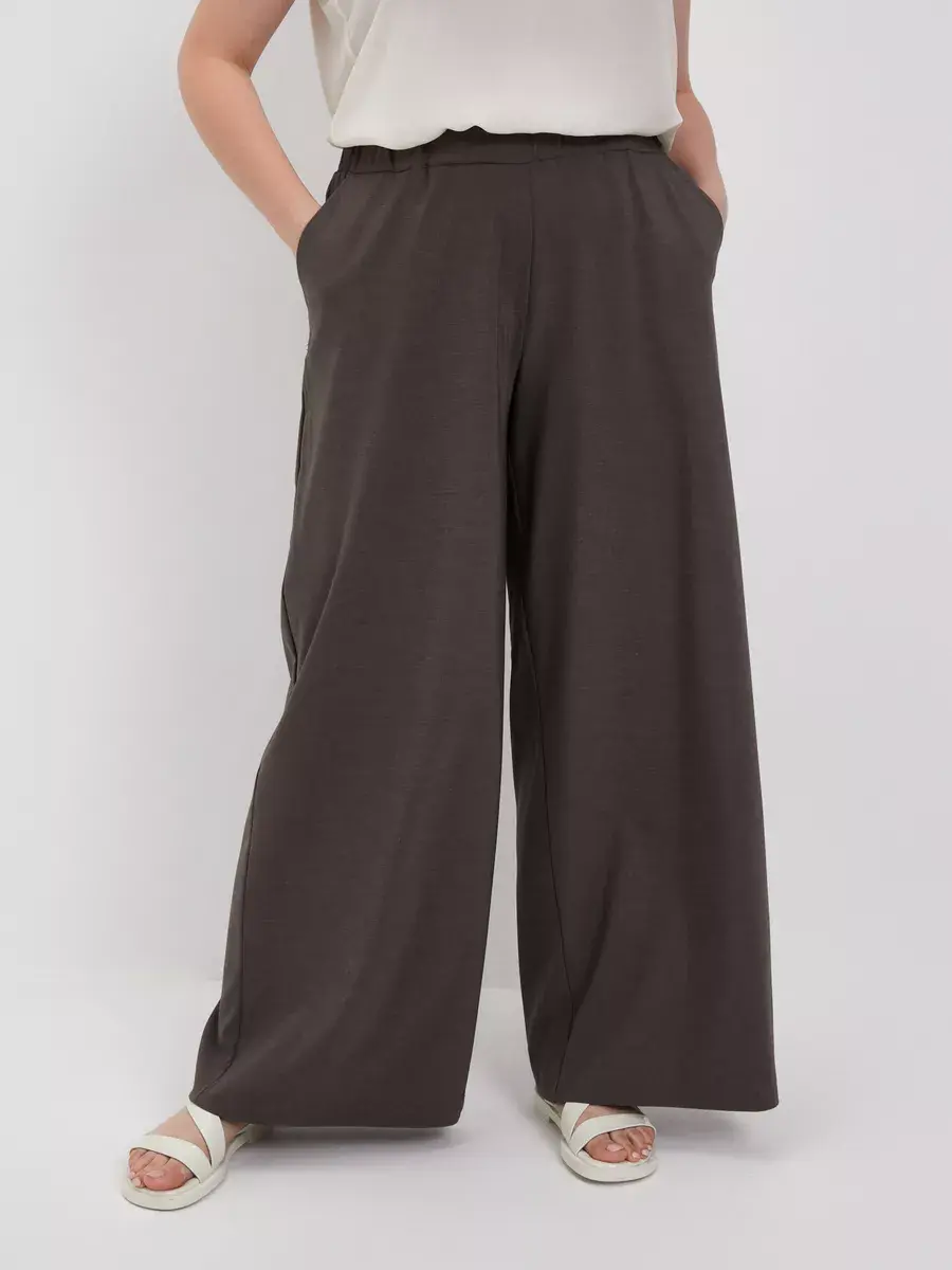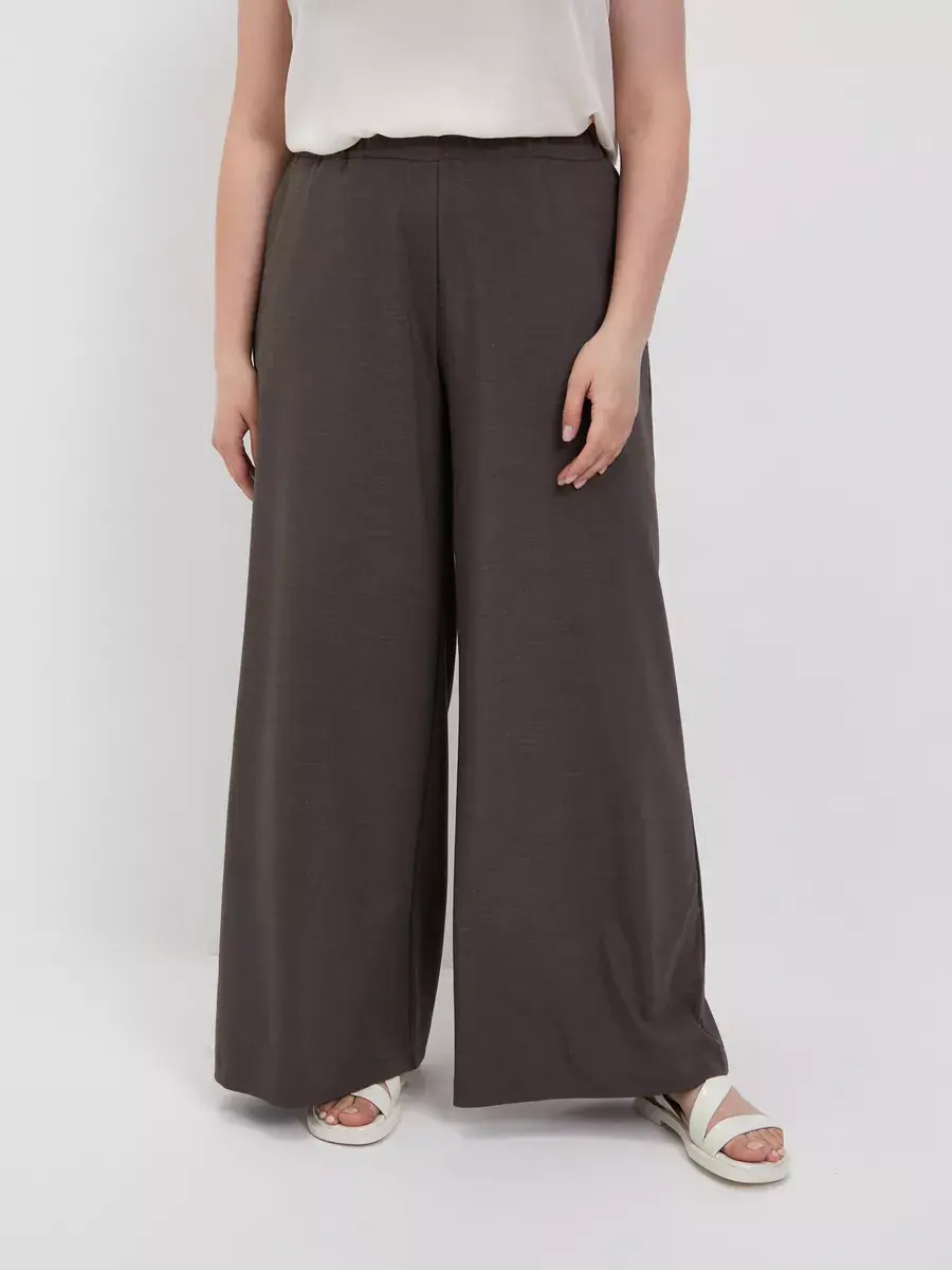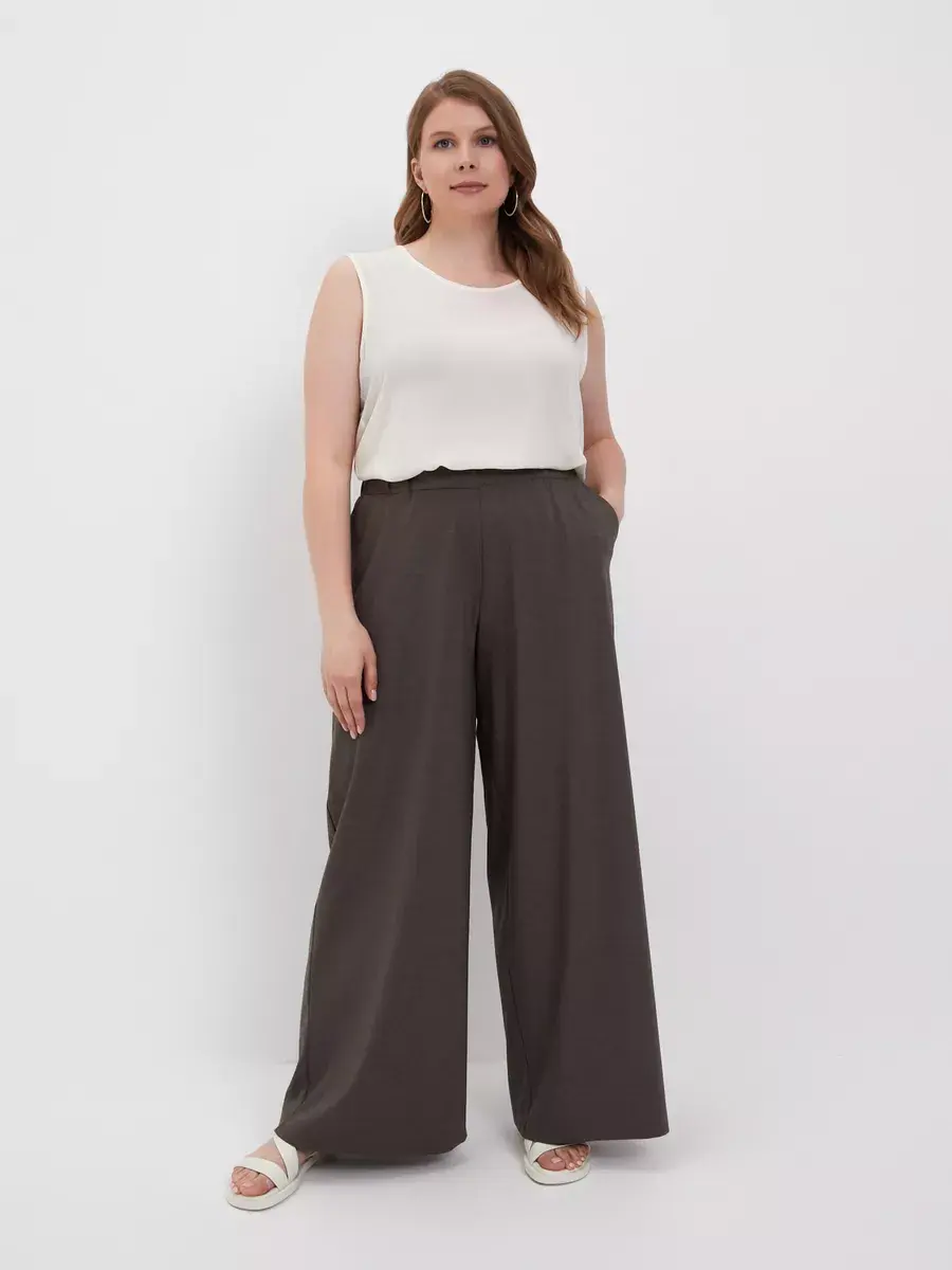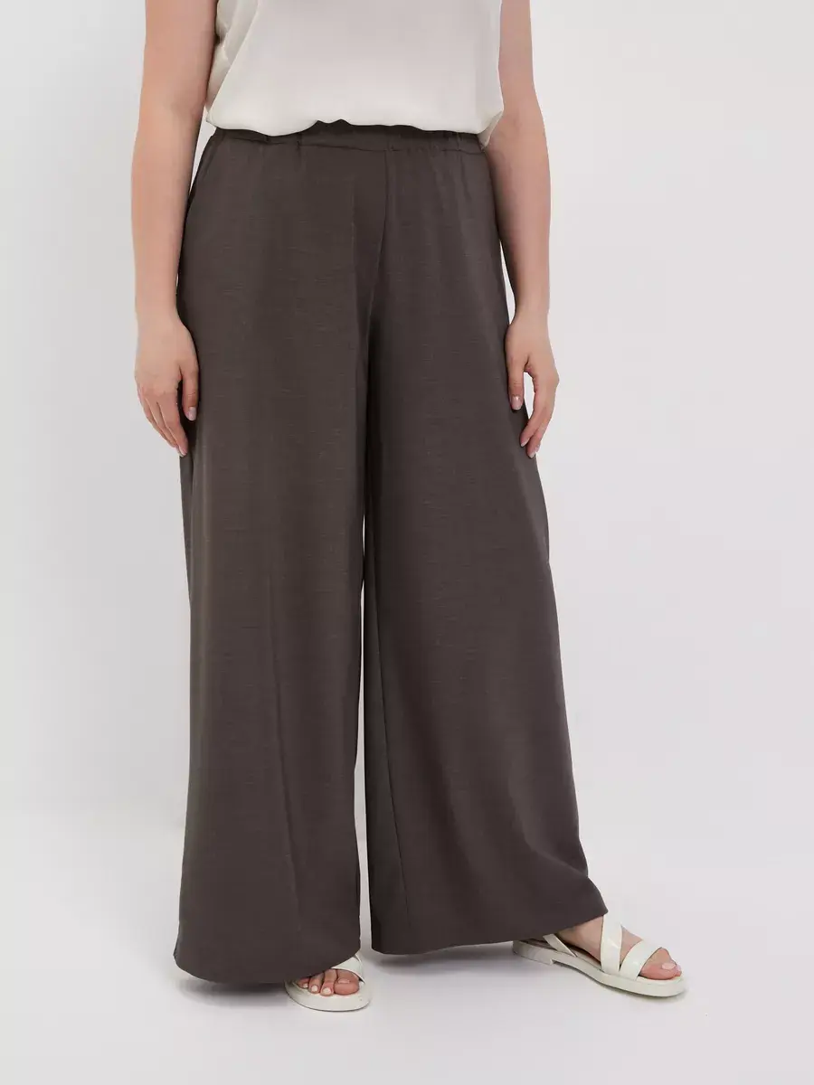 Женские брюки палаццо больших размеров от бренда OLSI, однотонные из текстильного тонкого полотна, прямого силуэта. Стильные длинные юбка-брюки высокой посадки с поясом на резинке. Оригинальная модель идеально сидит на фигуре любого типа благодаря завышенной линии талии визуально стройнят ноги, делают их длинными. Широкие штанины брюк создают ощущение, что на вас длинная широкая юбка. Женские брюки Олси представлены в 10 размерах от 52 до 70. Удобные лекала. Большой популярностью пользуются эти брюки в бежевом цвете. Отлично подходят для офиса, как деловая одежда для женщин а также для вечеринок. И модель в целом стройнит свою обладательницу. Брюки хорошо подойдут не только стройным девушкам, но в том числе обладательницам полных ног.