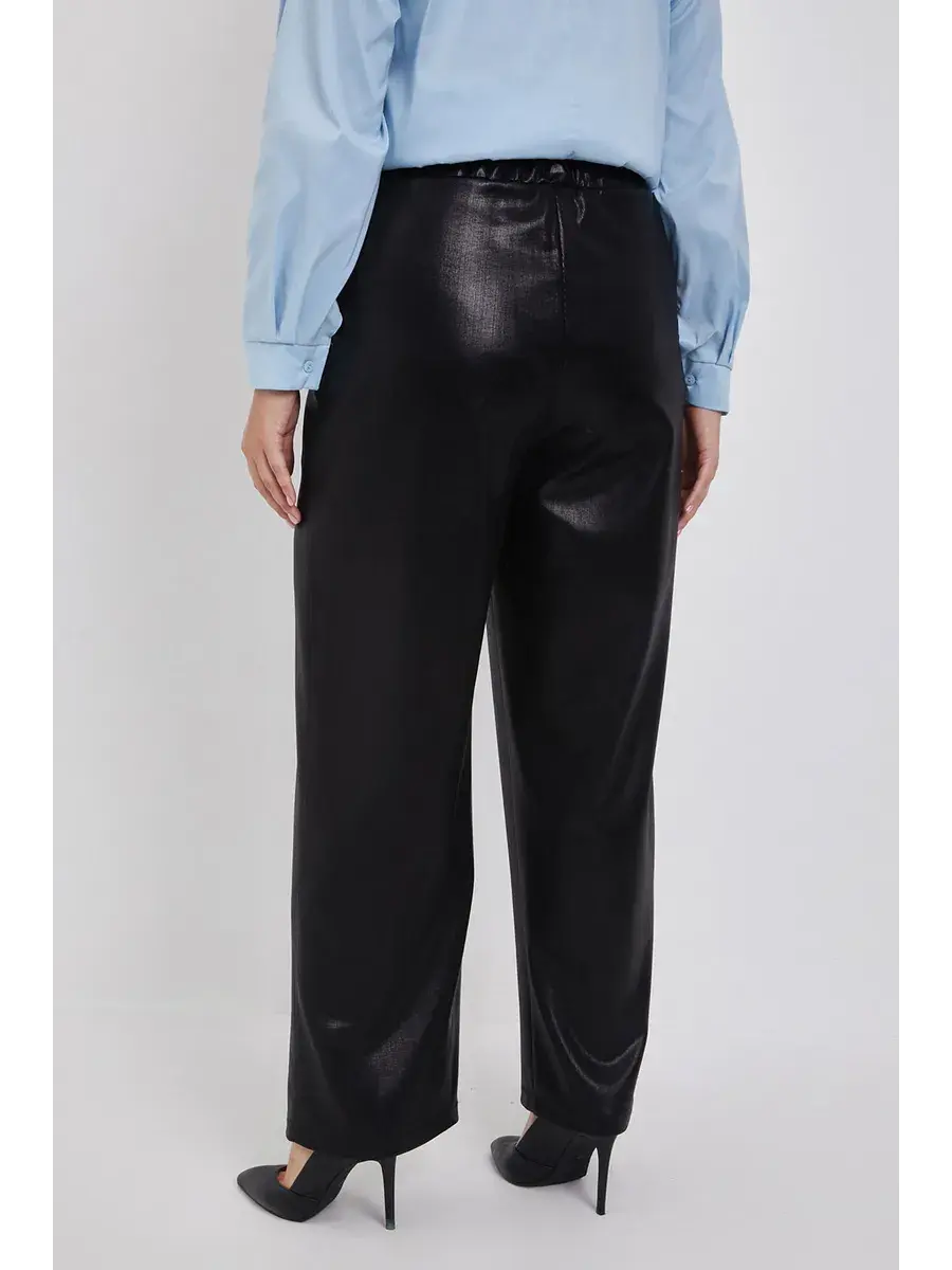 Женские брюки больших размеров, выполнены из плотной эластичной ткани с рельефным принтом, имитирующим кожу рептилий. Эффектные нарядные брюки палаццо с карманами. Модель с комфортной посадкой, пояс на резинке. Изделие не стесняет движений, стройнит, отлично сидит по фигуре и придает ей изящество. Идеально подойдет для создания деловых и повседневных образов, которым рисунок на ткани придаст особую пикантность. Вам будет комфортно на протяжении всего праздника или рабочей встречи. Можно создать стильный ансамбль на Новый год или корпоратив. Подойдет женщинам высокого роста. Для невысоких можно укоротить длину по желанию, или носить с каблуками.