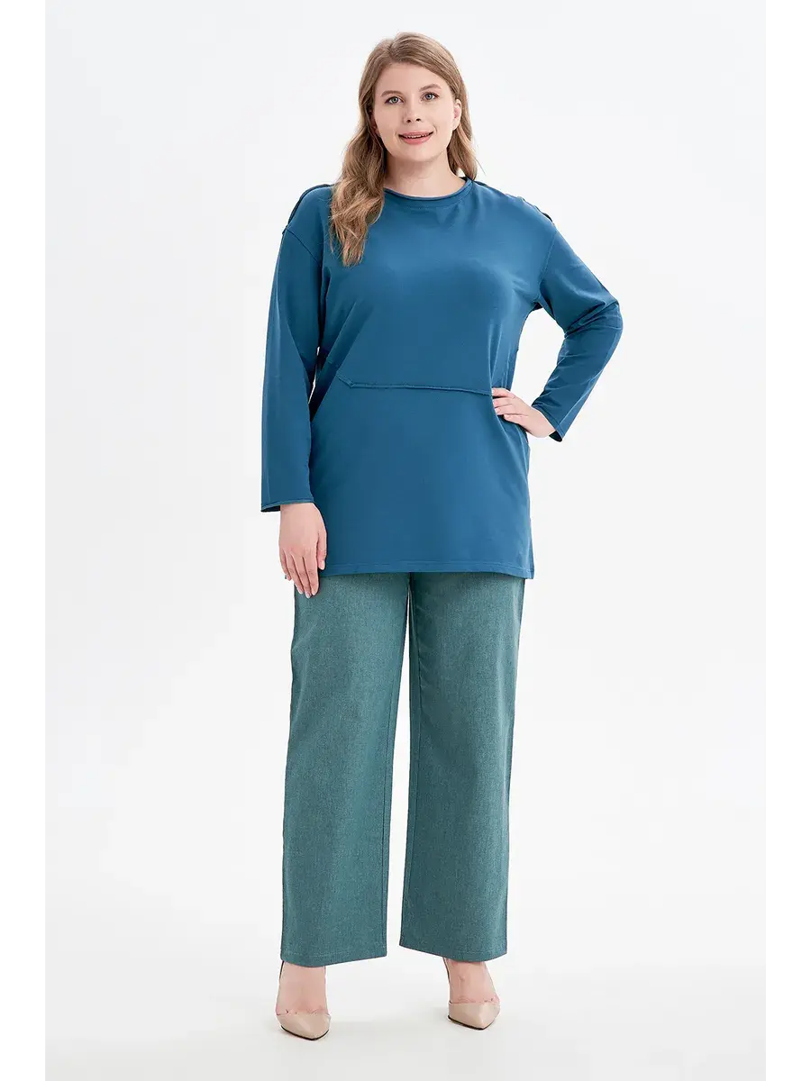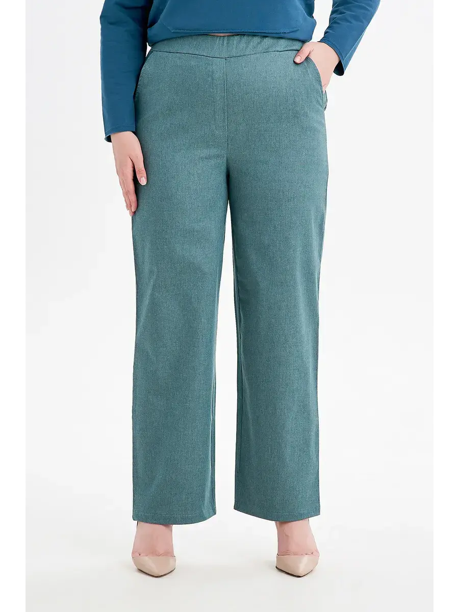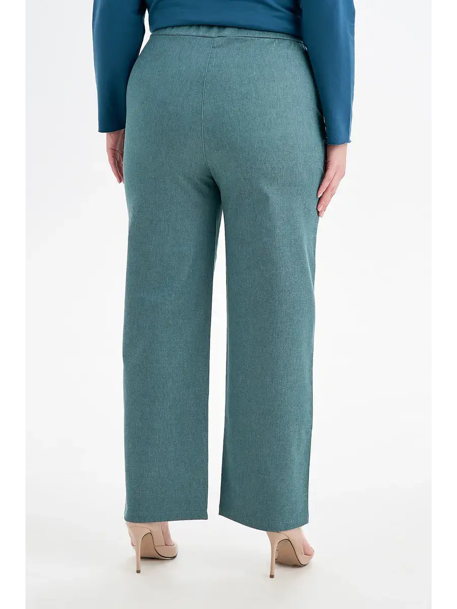 Женские стильные брюки больших размеров, выполнены из качествественной тонкой джинсы со стрейчем. Пояс не резинке, брюки с карманами.