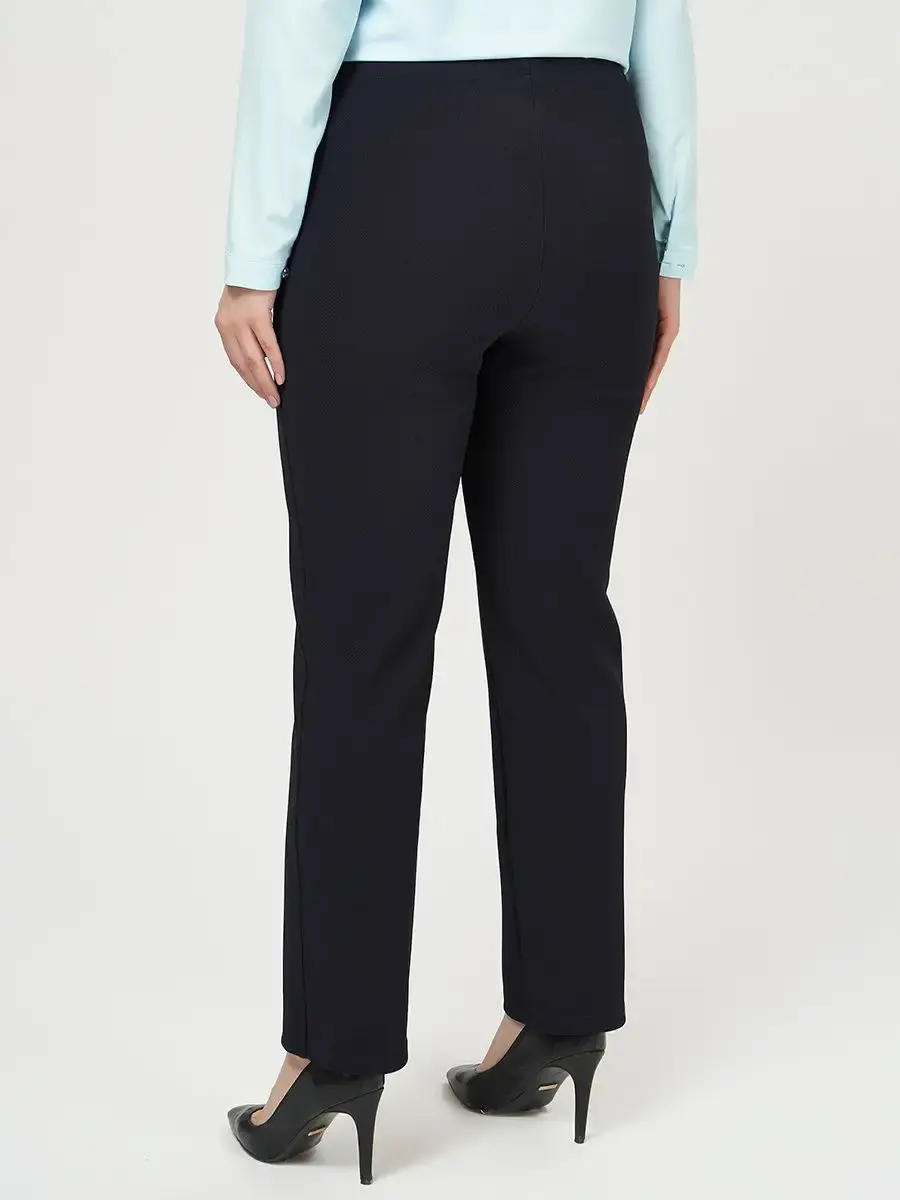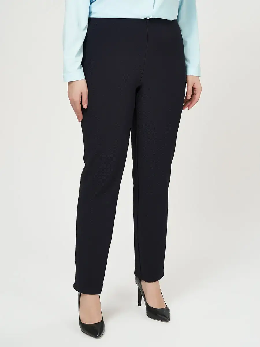 Элегантные брюки, выполненные из эластичной ткани в классический рубчик. С естественной посадкой и кулиской на резинке. Брюки подтягивают силуэт, делают фигуру привлекательнее и стройнее. Благодаря лаконичному крою и отсутствию декоративных деталей, изделие можно носить с любым верхом и любой обувью. Модель из разряда маст-хэв (must have) – то, что у Вас обязательно должно быть в гардеробе.