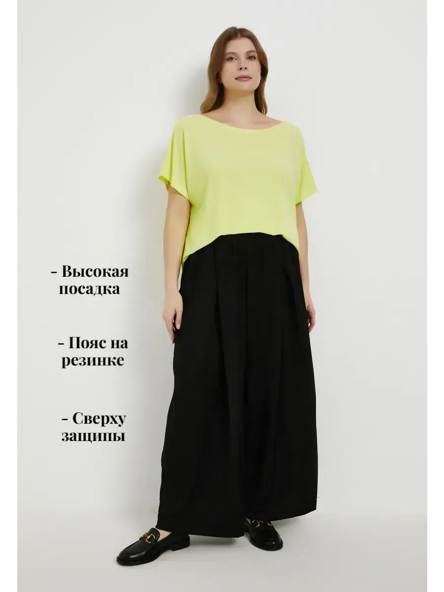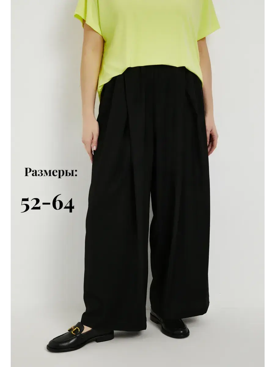 Женские брюки палаццо больших размеров от бренда OLSI, однотонные, прямого силуэта. Широкие брюки с защипами сверху,высокая посадка. Выполненные из фактурного струящегося материала. Оверсайз-крой, удобный пояс на резинке для максимального комфорта. Это универсальный вариант брюк, который можно носить круглый год. На праздник их можно сочетать с нарядной блузой и туфлями, а для более спортивного образа - с футболкой и кедами, позволяя создавать стильные образы на любой случай. Они легко адаптируются к различным стилям, идеально подходя как для повседневной носки, так и для создания оригинальных нарядов для особых мероприятий. Эти штаны больших размеров также подойдут для работы, офиса, ресторана, театра или торжественного мероприятия в сочетании с нарядным верхом. Модель брюк палаццо с круговой резинкой по талии, без застежки. Широкие струящиеся брюки в комфортном свободном стиле незаменимы в жаркую погоду и путешествии. Идеальный вариант в офис, на праздник, на прогулку. Широкий размерный ряд и свободная посадка.