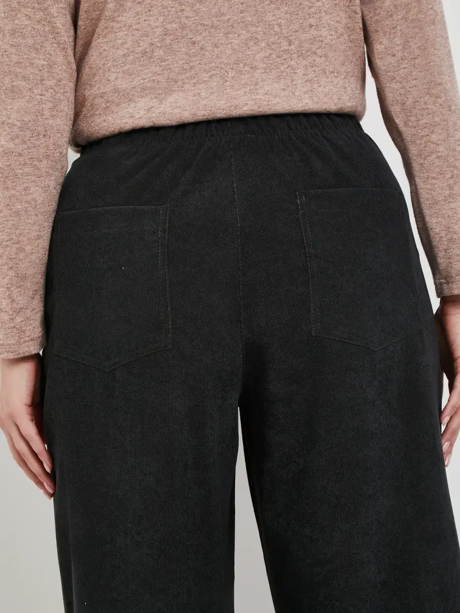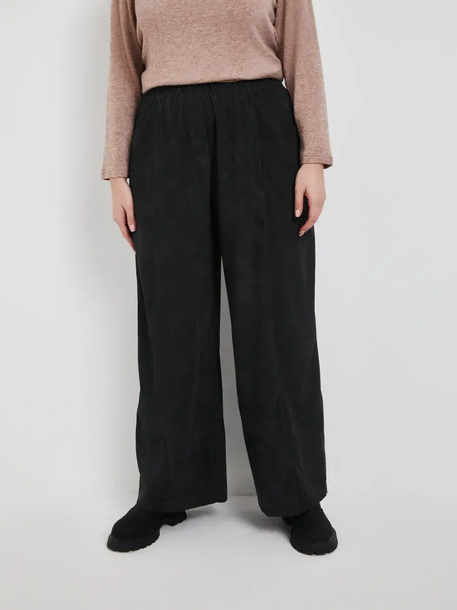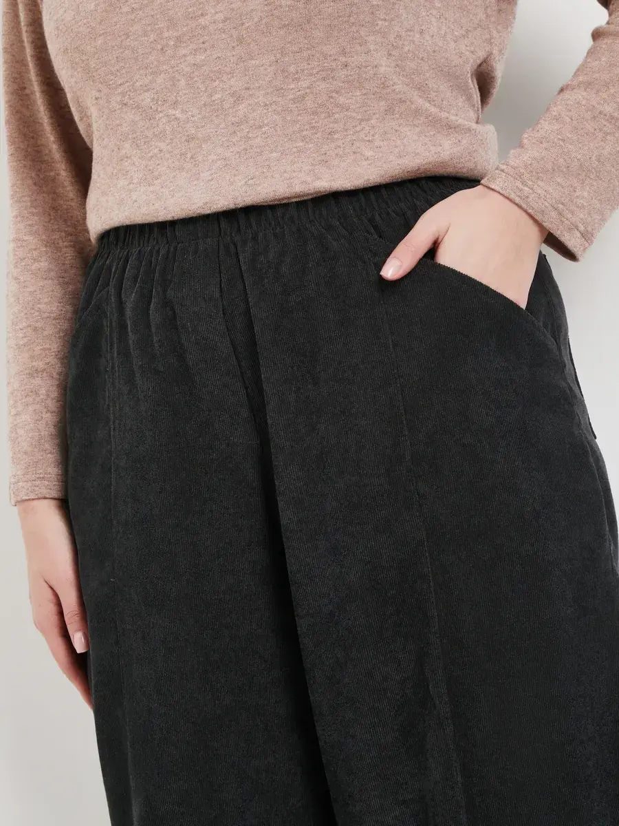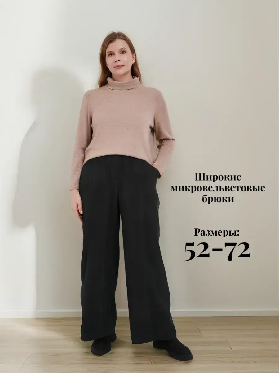 Широкие вельветовые брюки с высокой посадкой и стрелками. Выполненные из фактурного материала. Оверсайз-крой, с боковыми карманами и накладными сзади. Верхняя часть на резинке для максимального комфорта